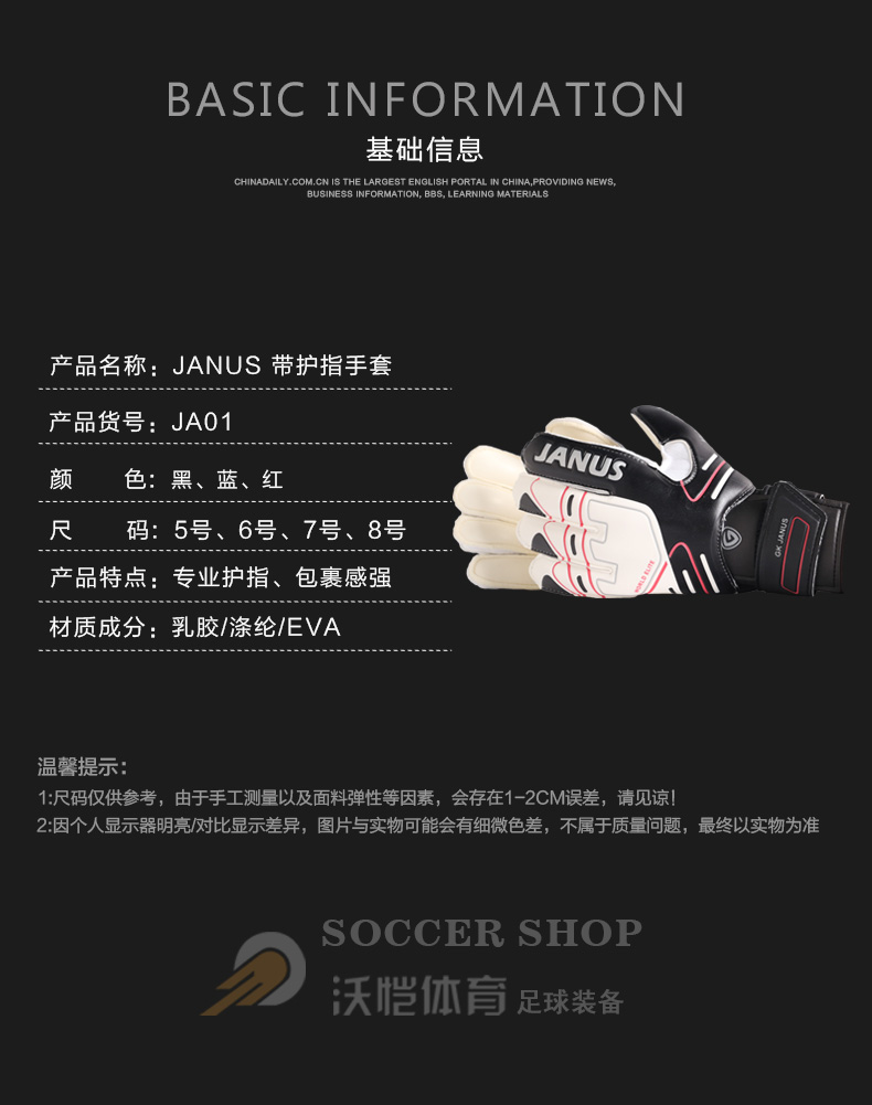 沃恺体育:JANUS 儿童成人门将乳胶手套 带护指 JA01