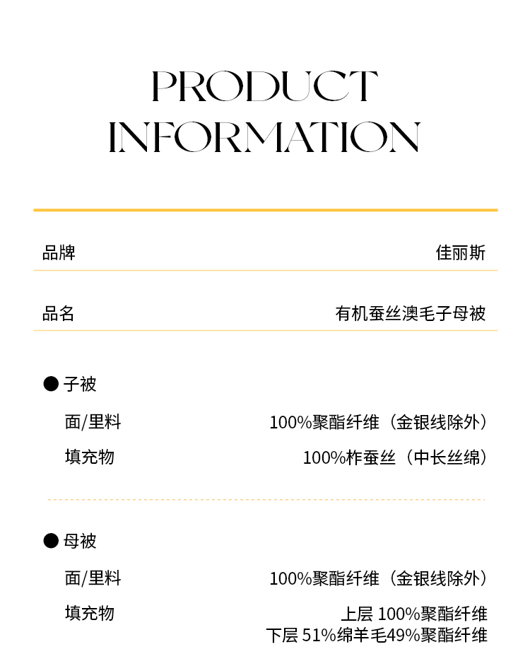 佳丽斯有机蚕丝澳毛子母被/1套(200*230cm,填充物重子被约300g+母被约1700g)补单专用