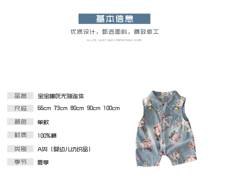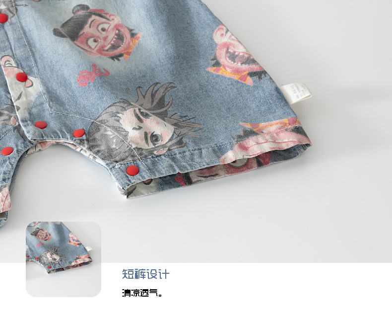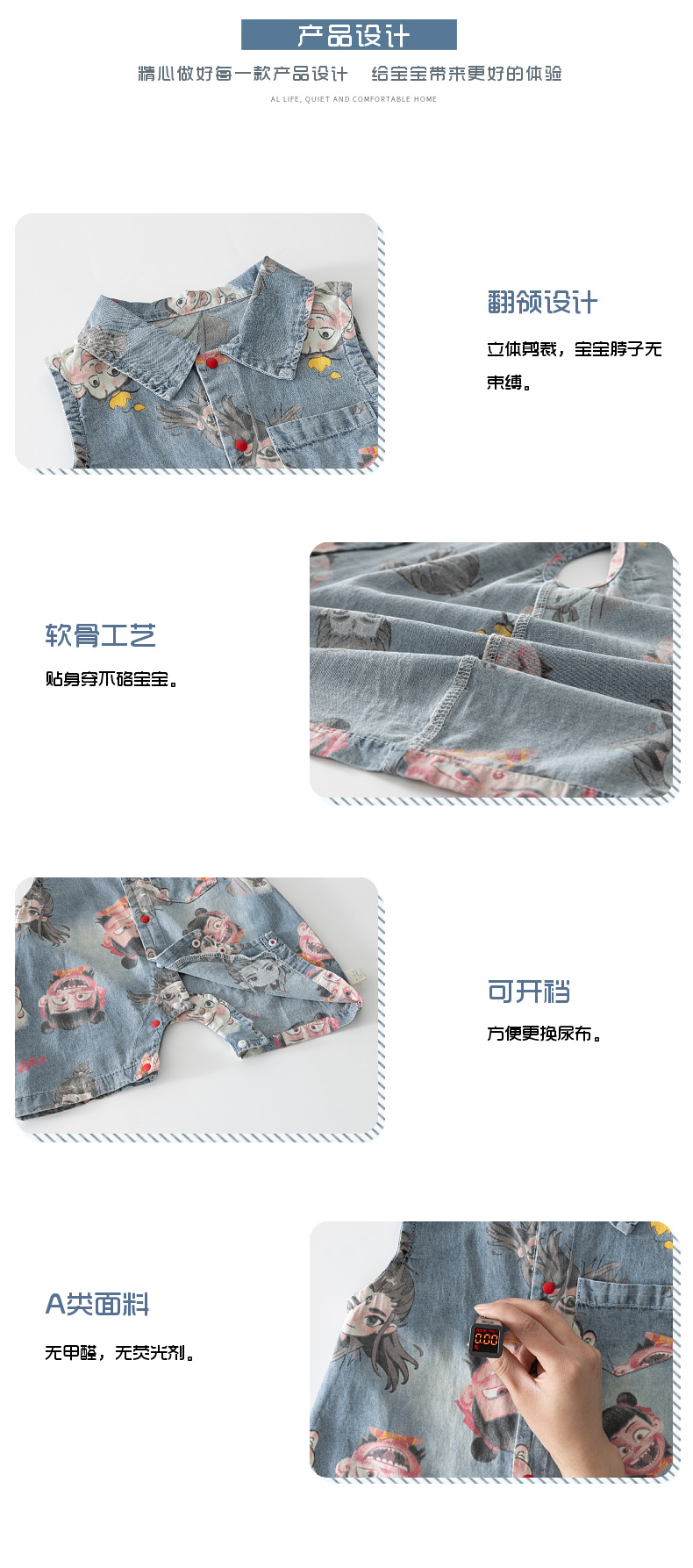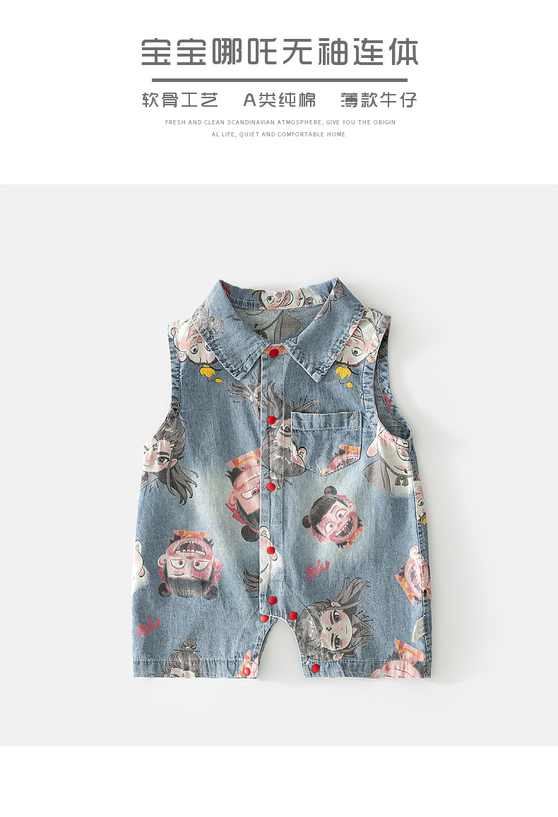 【软骨工艺,薄款牛仔·】婴儿哪吒无袖连体衣 宝宝夏季薄款纯棉牛仔哈衣 新生儿爬服 婴幼短爬-QQ