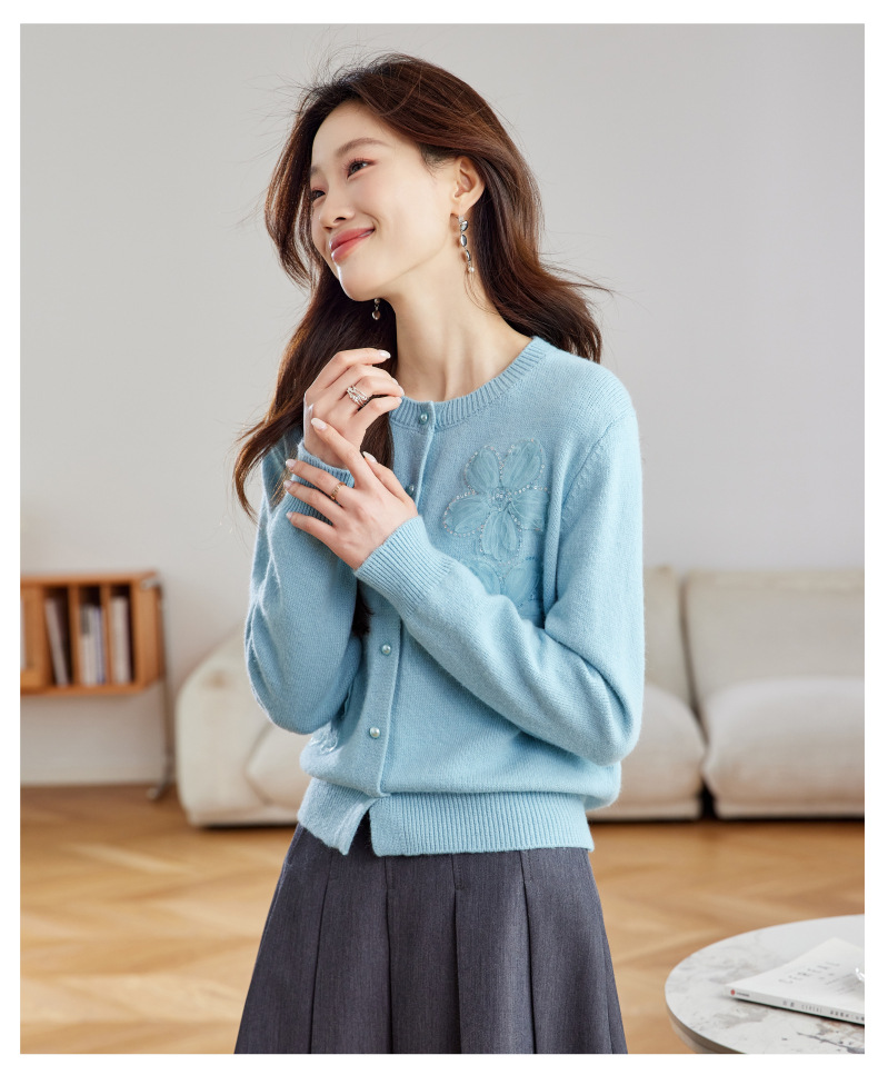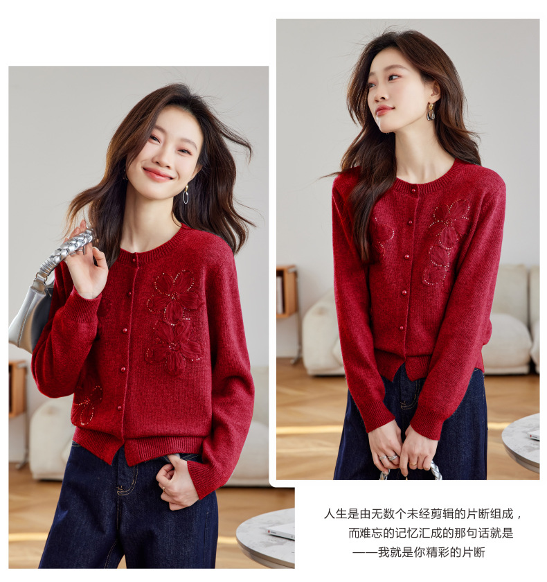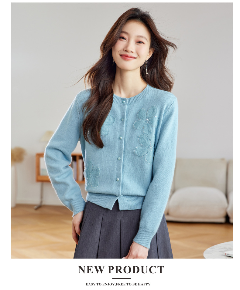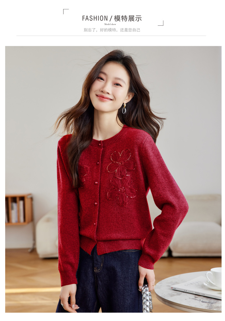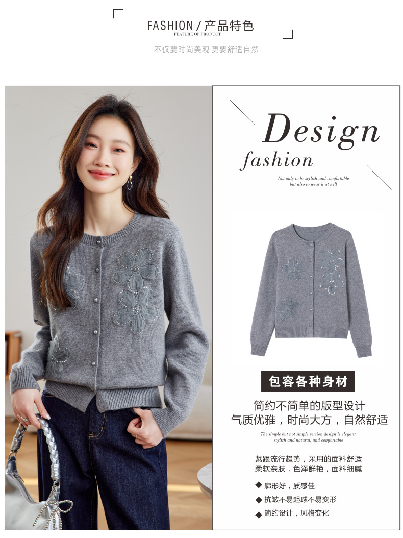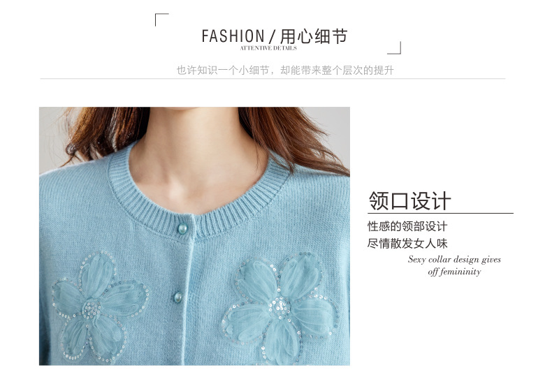 CC-27-2501春装女款2025年新款开衫针织衫短款低领小香风立体花朵亮片毛衣女