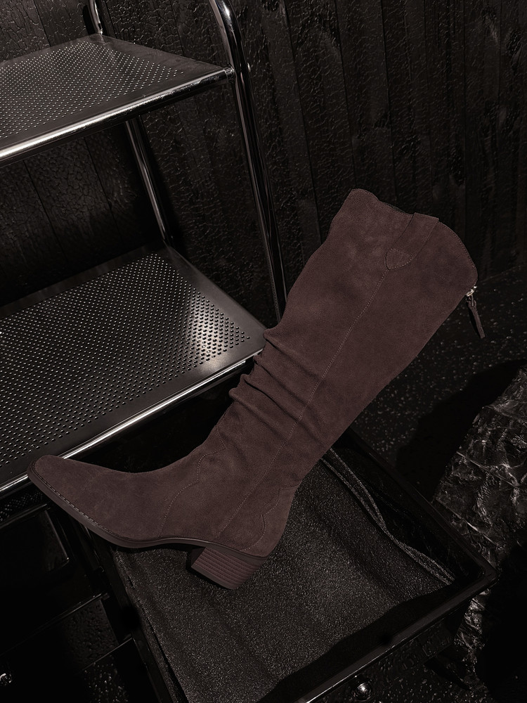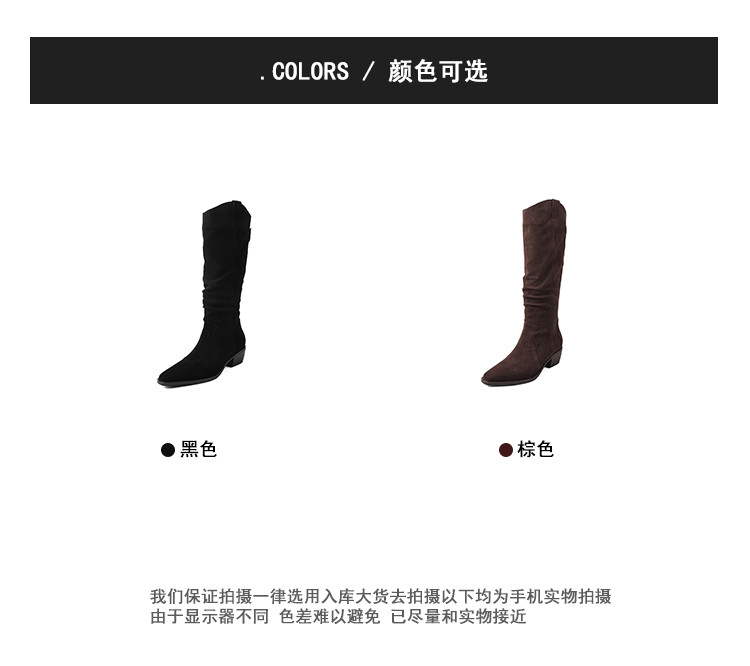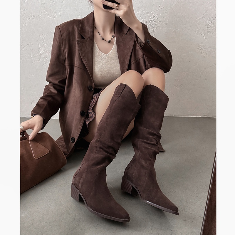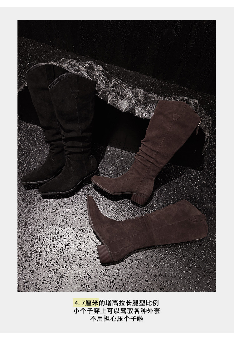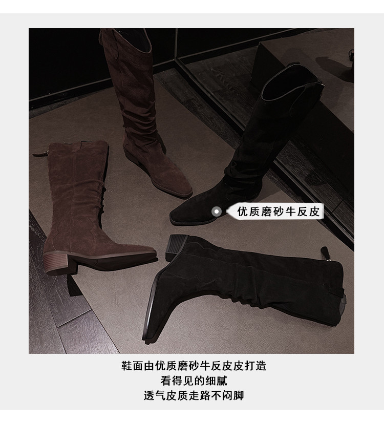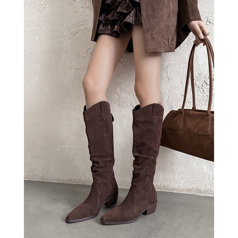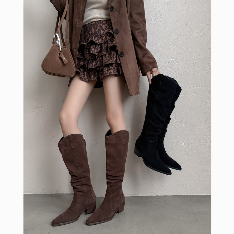 【预售7天】时尚棕色磨砂牛反皮长靴女秋冬款尖头中跟褶皱堆堆靴显瘦高筒骑士靴LD&7468