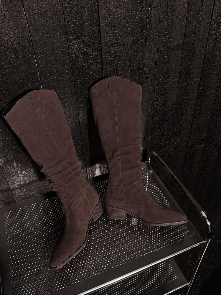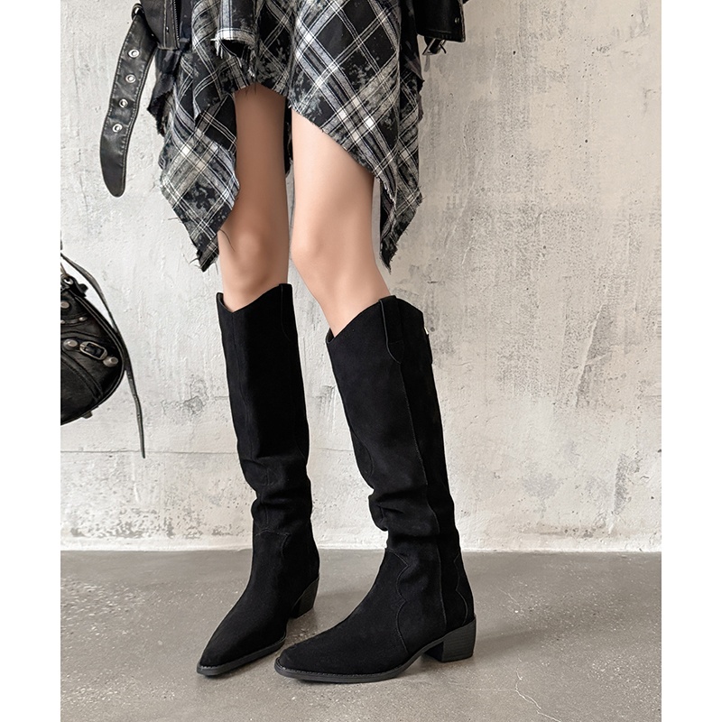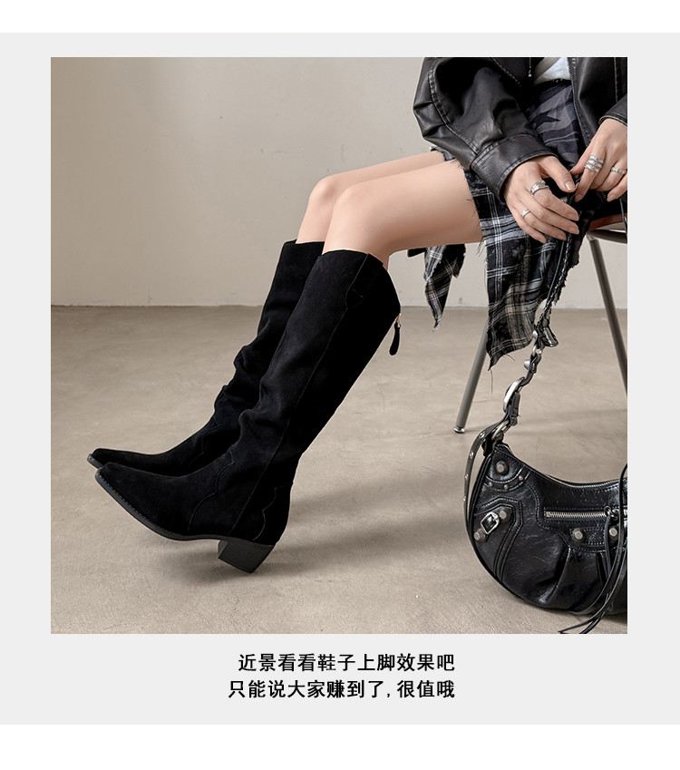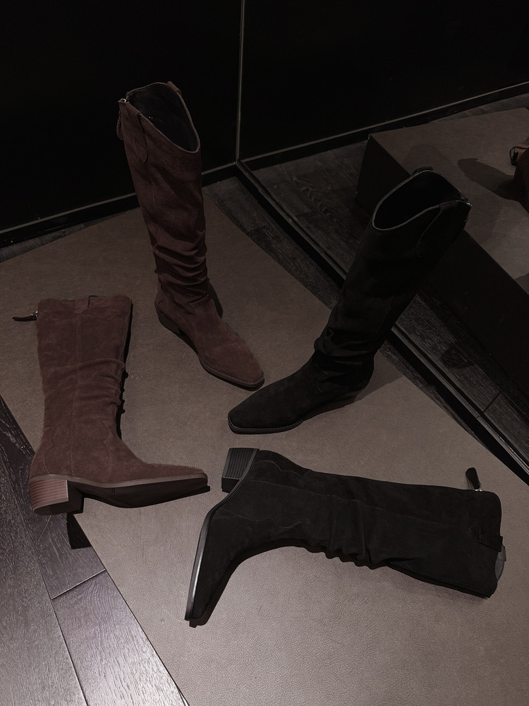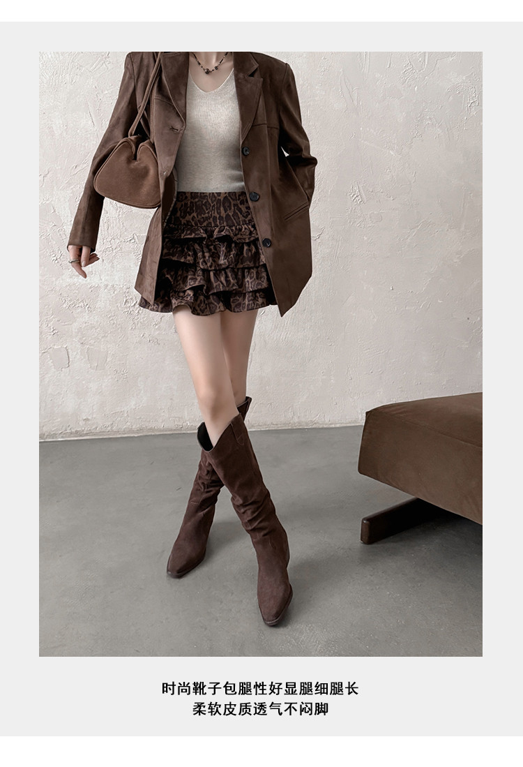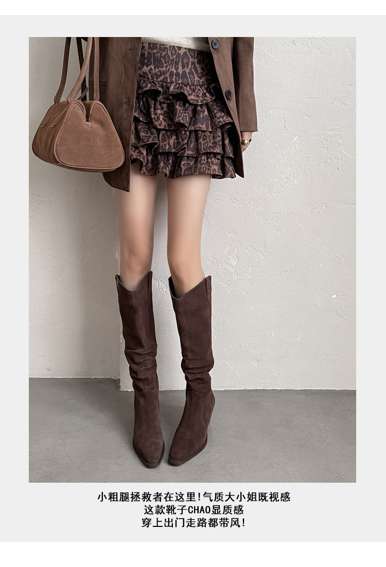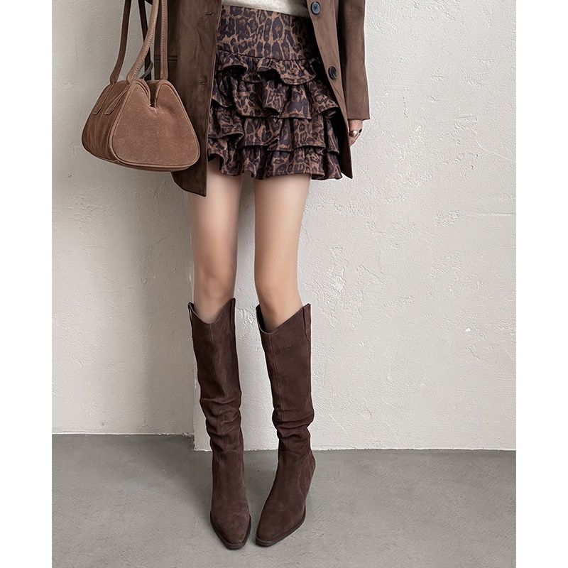 【预售7天】时尚棕色磨砂牛反皮长靴女秋冬款尖头中跟褶皱堆堆靴显瘦高筒骑士靴LD&7468