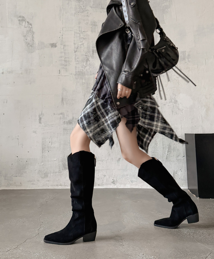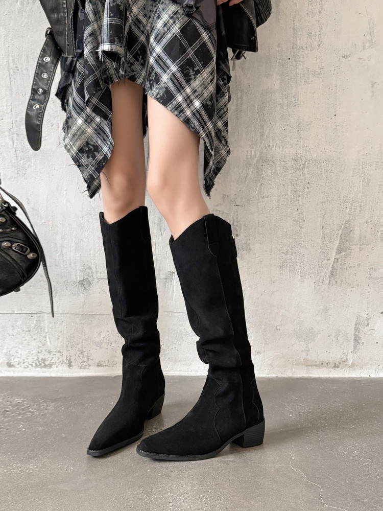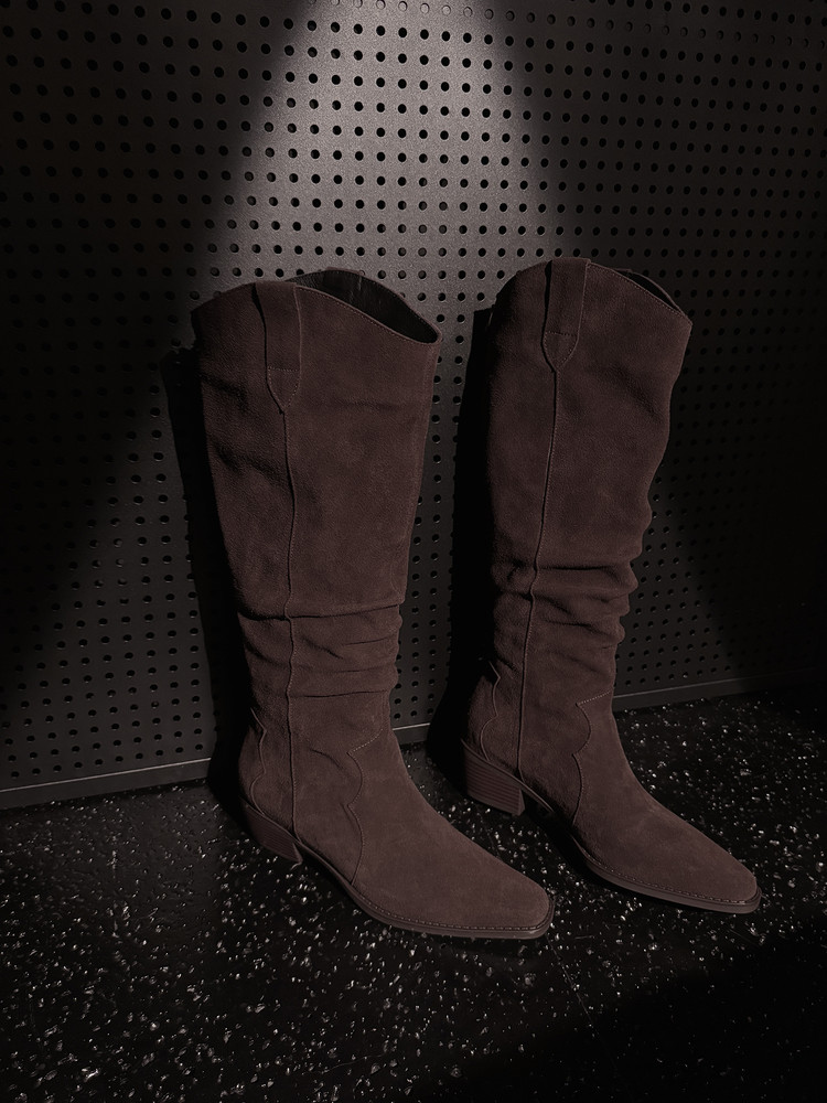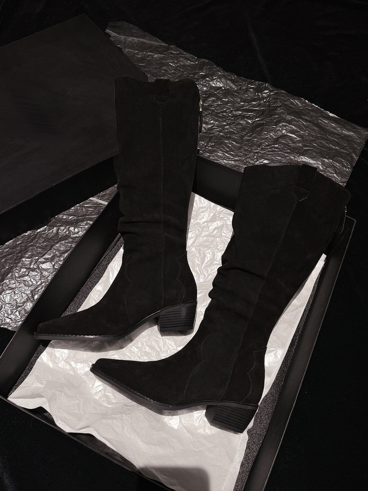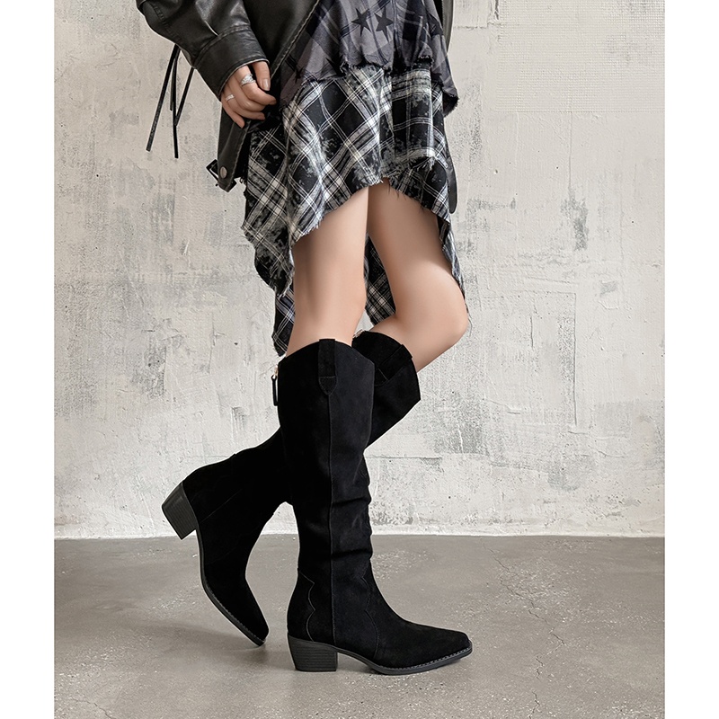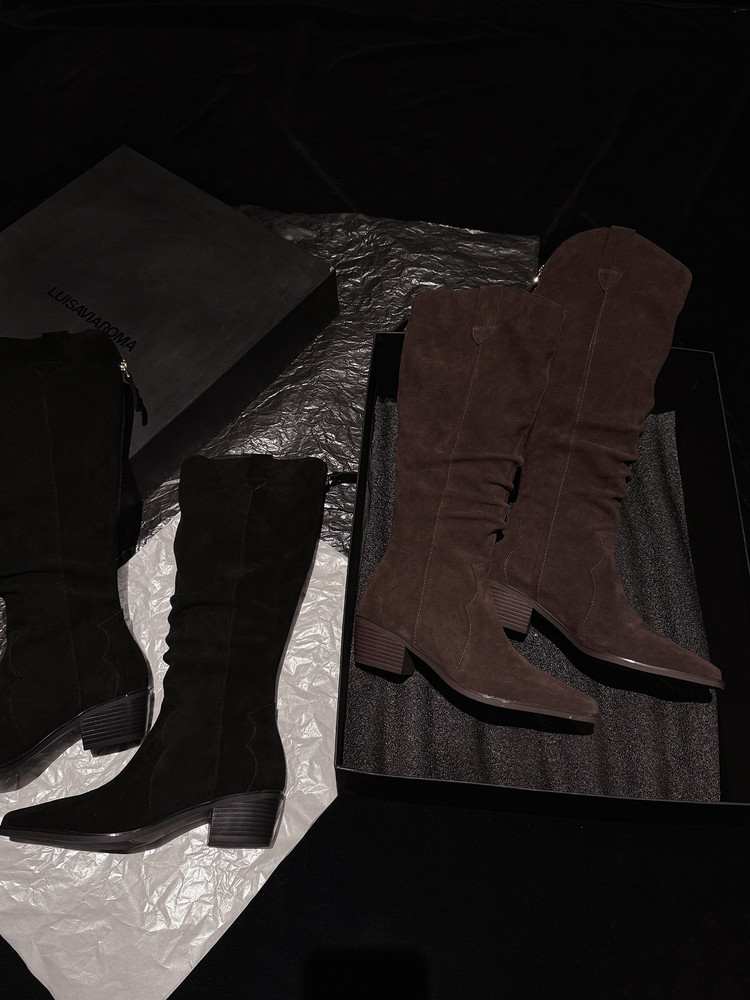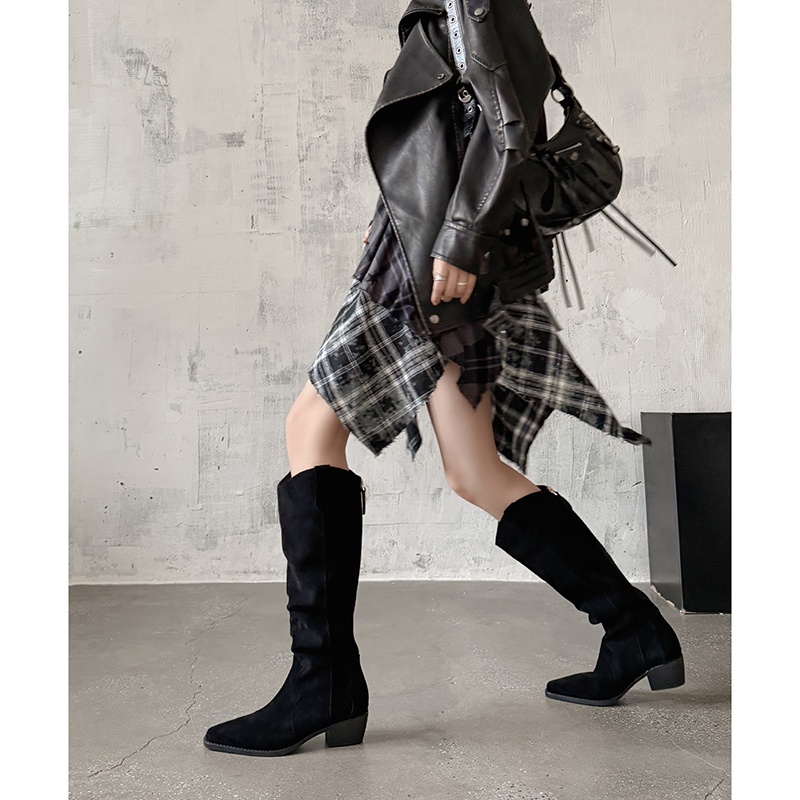 【预售7天】时尚棕色磨砂牛反皮长靴女秋冬款尖头中跟褶皱堆堆靴显瘦高筒骑士靴LD&7468
