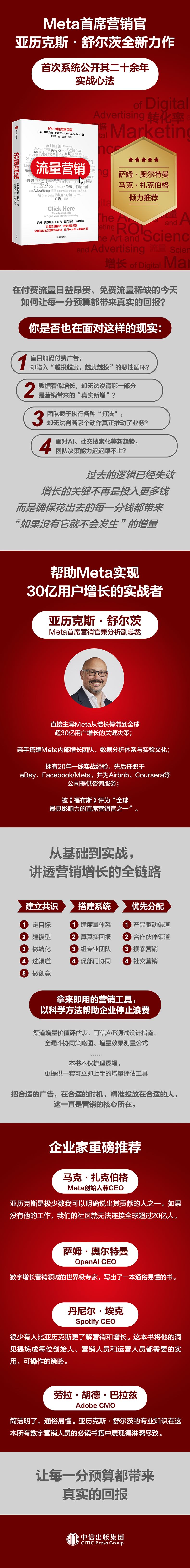 1.Meta首席营销官亚历克斯·舒尔茨次系统公开其二十余年全球增长实战心法。作者舒尔茨作为Meta首席营销官,在数字增长方面有20多年的资深经验,直接参与并主导Meta从用户增长停滞到全球社交巨头的关键决策,例如:设计月活跃用户(MAU)作为核心北极星目标,平衡用户体验与商业化。此外,作者深度参与Meta在社交媒体的重大转折,如2010年代主导Meta广告系统的用户体验优化,推动其成为全球大数字广告平台之一。