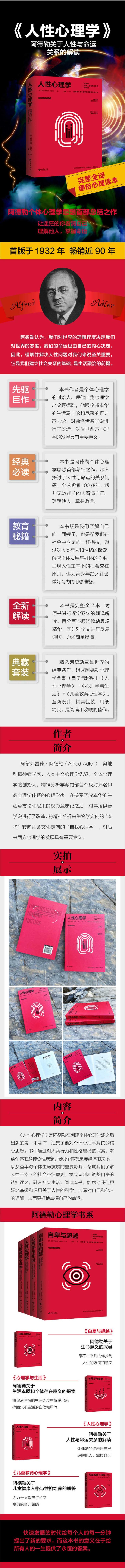 精选阿德勒享誉世界的典名作,组成阿德勒心理学全集:《自卑与超越》+《人性心理学》+《心理学与生活》+《儿童教育心理学》。全新设计,精美包装,用纸精良,是阅读和收藏的佳作。