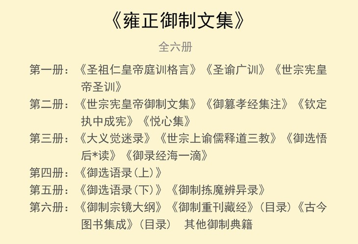 五、?世宗宪皇帝御制文集?是雍正的诗文作品集。包括文二十卷,分别为敕谕、诏、册文、论、记、序、杂著、题辞、题跋、碑文、祭文等十二种体裁。另包括诗十卷。其中前七卷?雍邸集?是即位前之作,后三卷? 四宜堂集? 是即位后之作。该书于乾隆年间刊印。