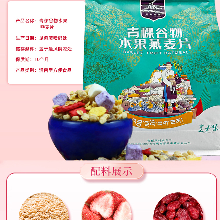 | 名称:青稞谷物水果燕麦片(芝士味) 规格:300g 单位:袋 箱装:20袋/箱 产品编码:6974560950041 保质期:10个月 产地:甘肃甘南藏族自治州 生产商:甘南云端羚城食品科技有限公司 |