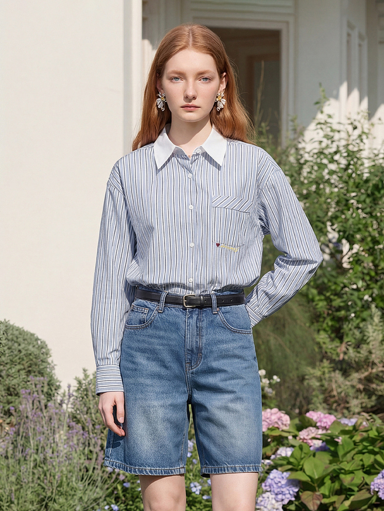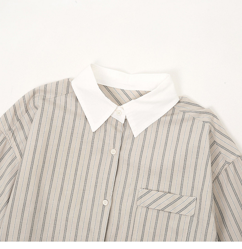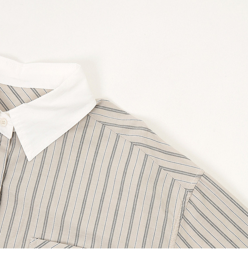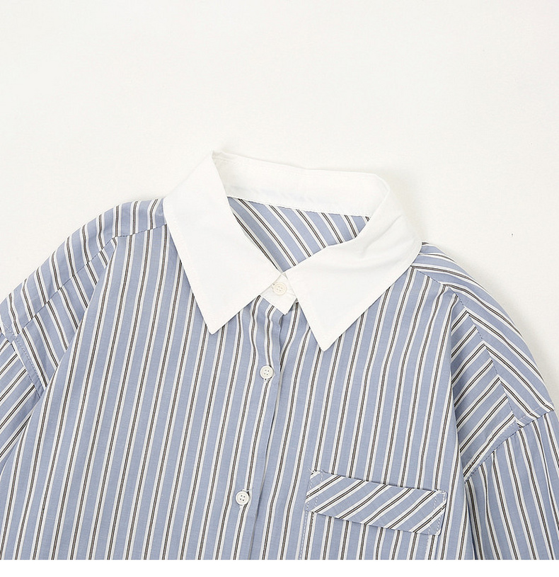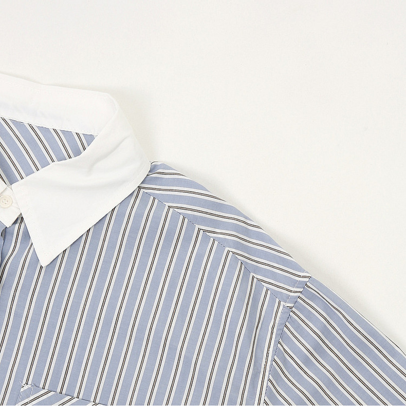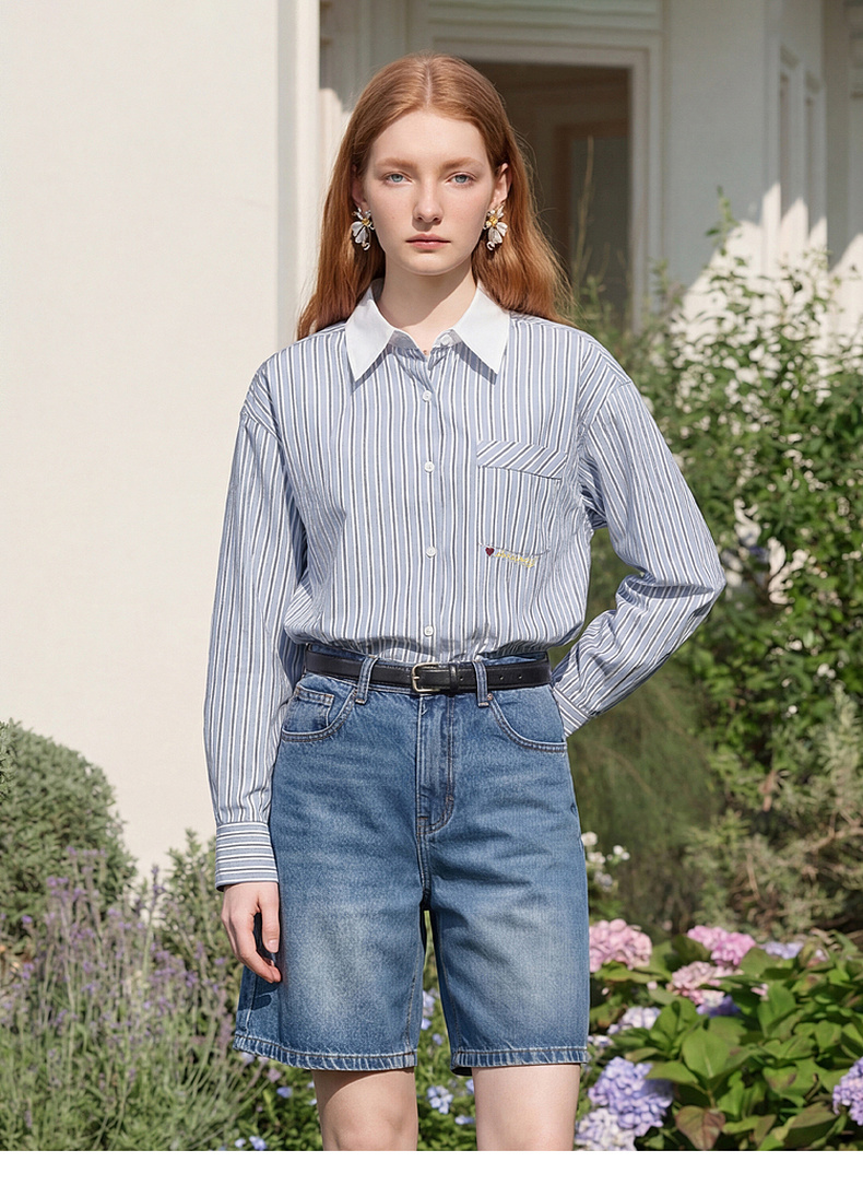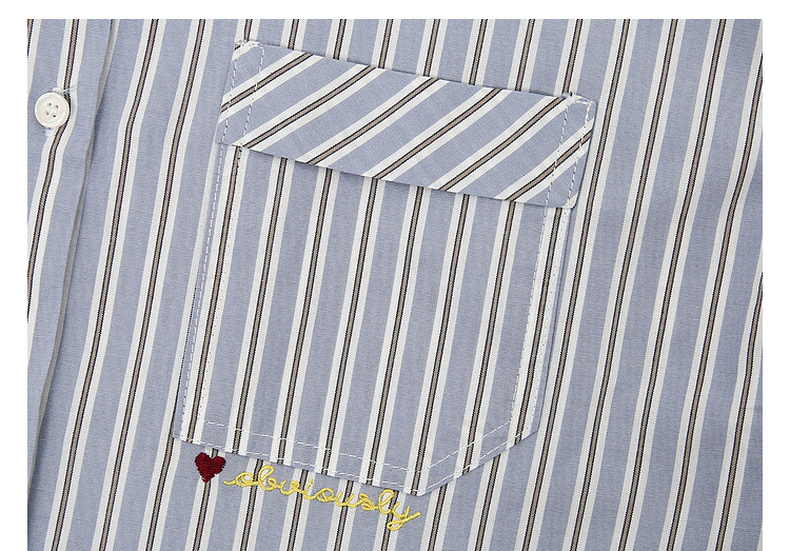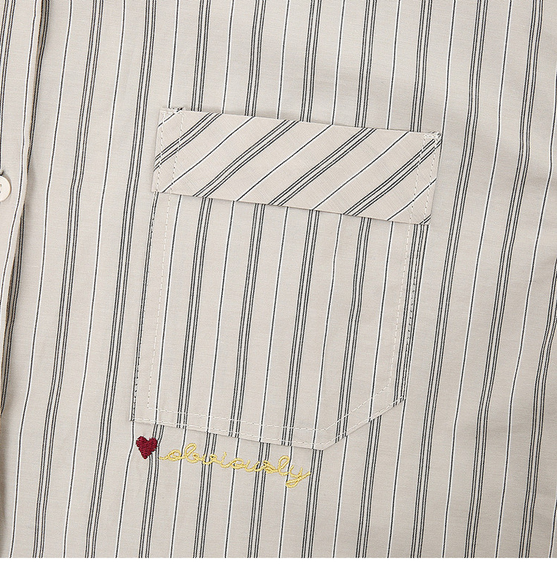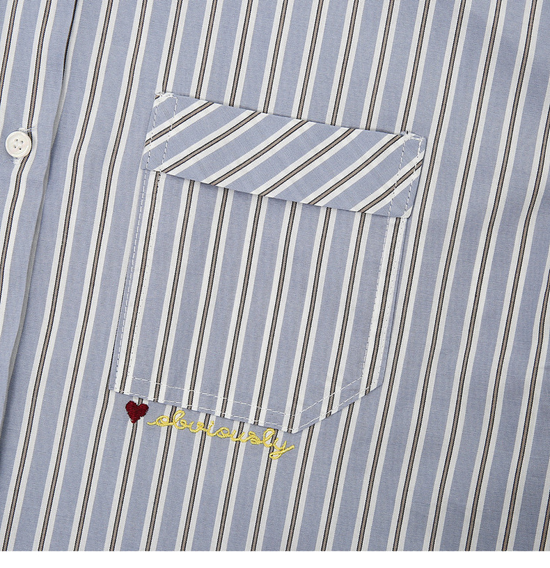 天猫同步【慵懒气质~】拉夏贝尔/La Chapelle撞色翻领竖条纹设计单口袋纯棉刺绣衬衫百搭通勤风上衣