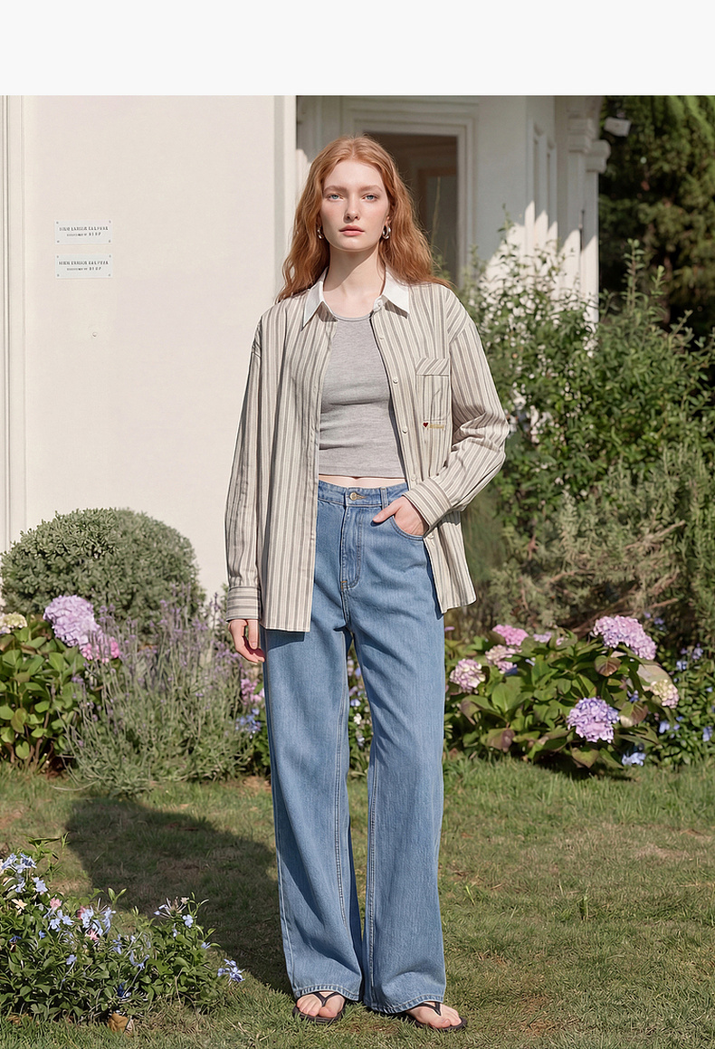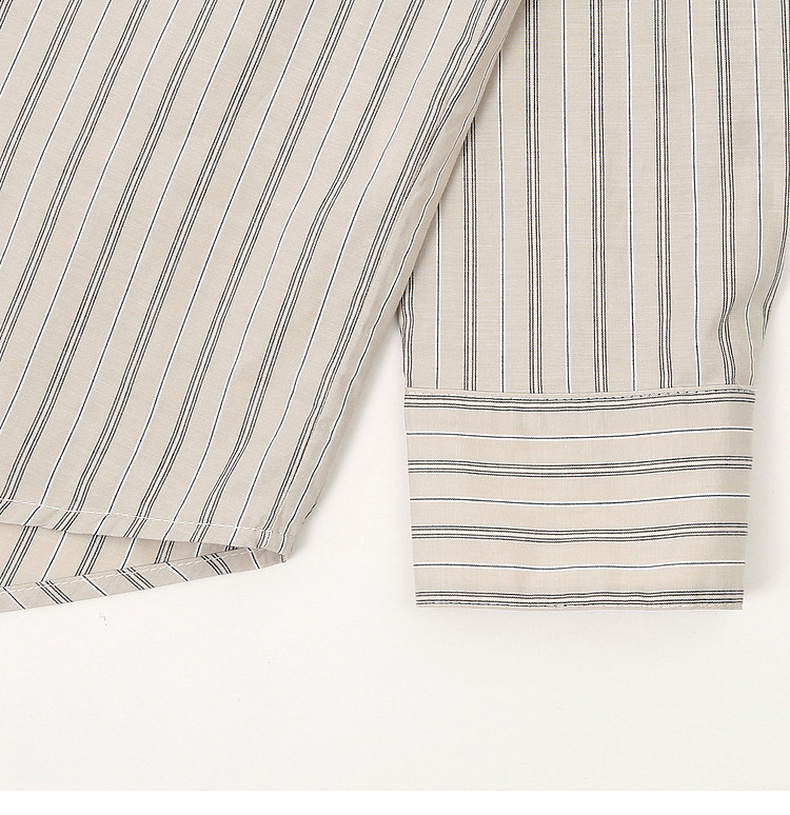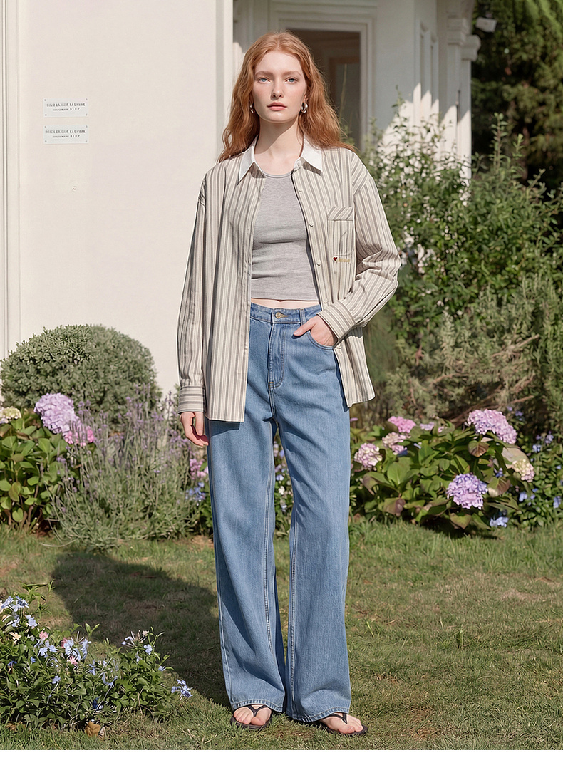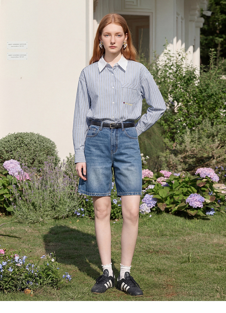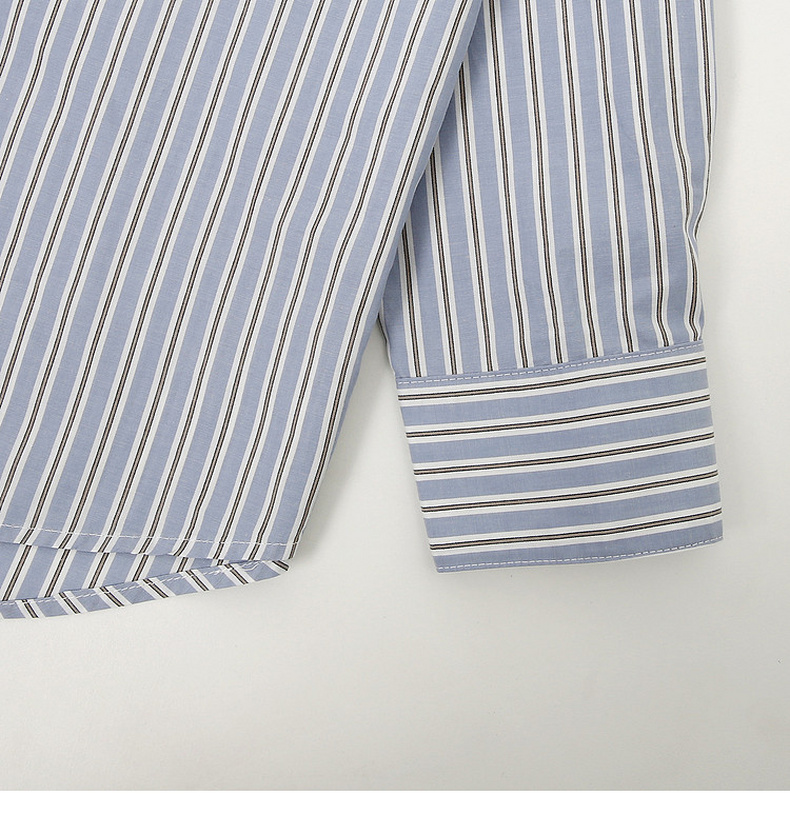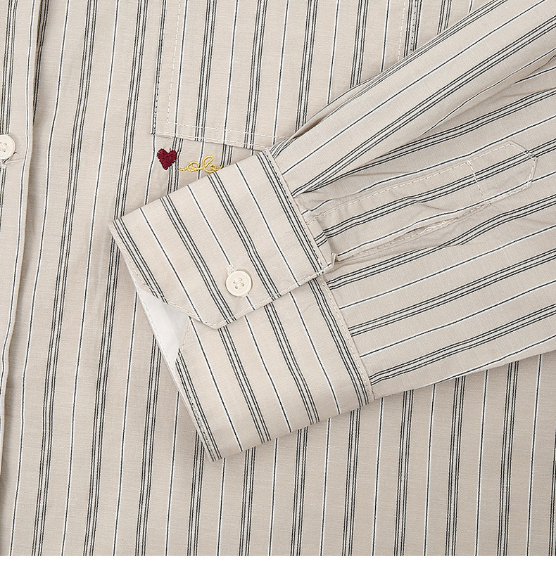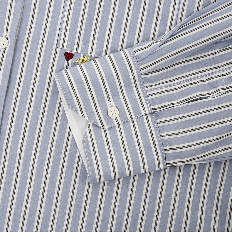 天猫同步【慵懒气质~】拉夏贝尔/La Chapelle撞色翻领竖条纹设计单口袋纯棉刺绣衬衫百搭通勤风上衣