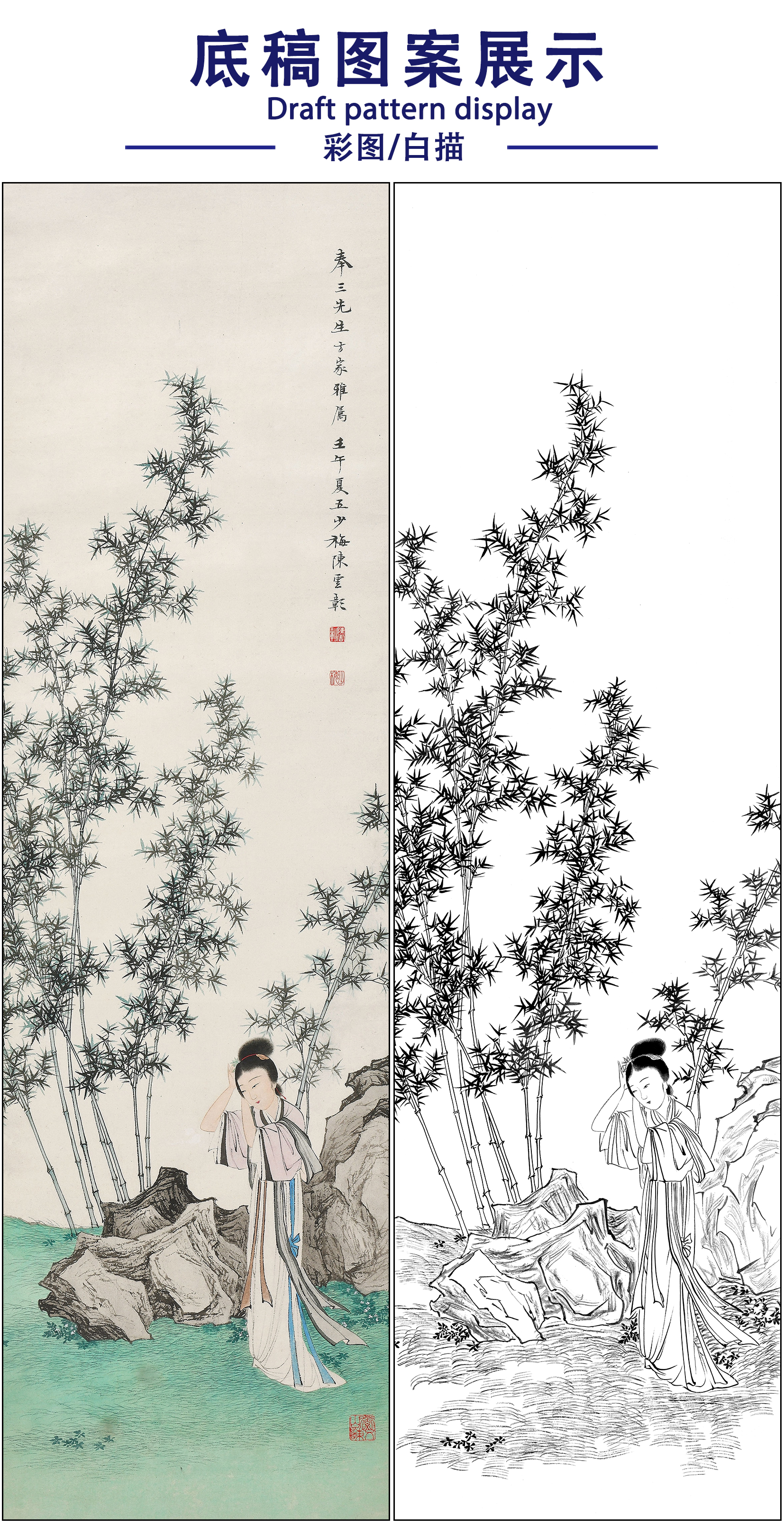 陈少梅山水人物仕女工笔画白描底稿《竹苑仕女》临摹勾线高清打印稿SM57