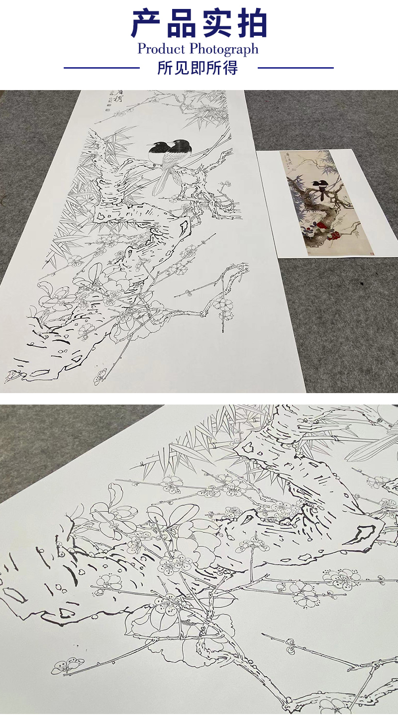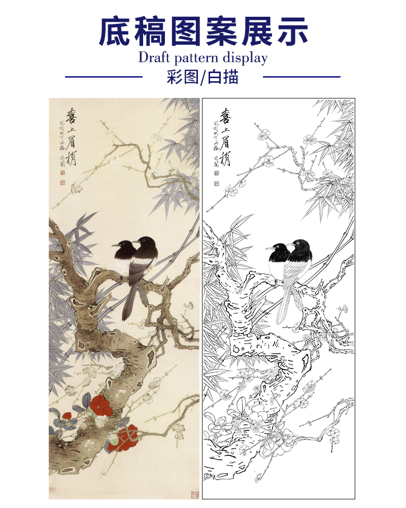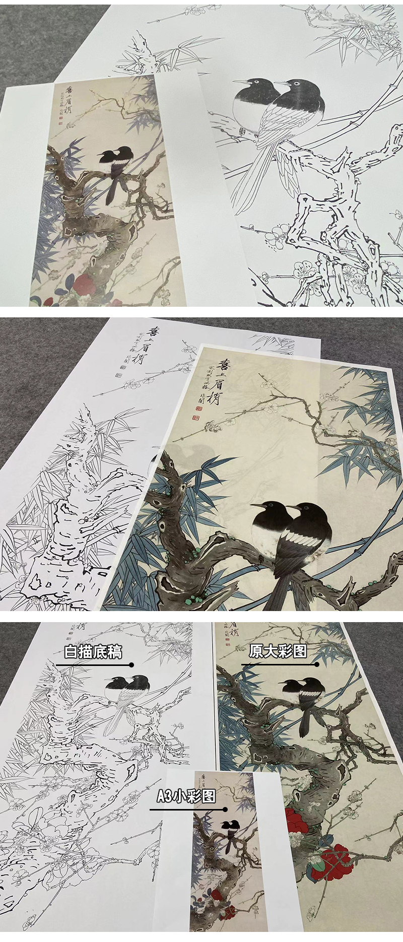 【大彩图】于非闇工笔画白描底稿《喜上眉梢图》喜鹊临摹勾线高清打印稿YF07