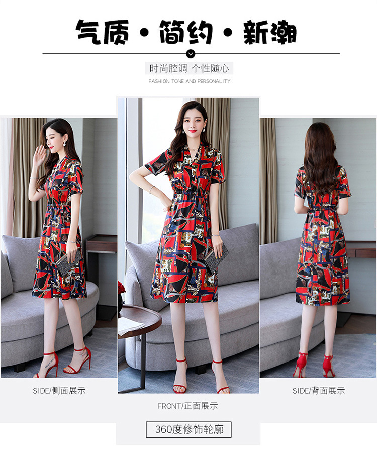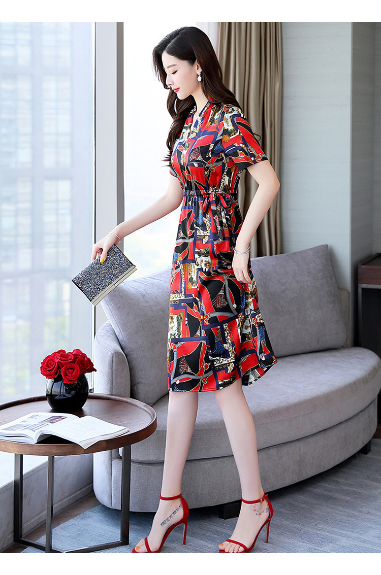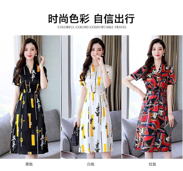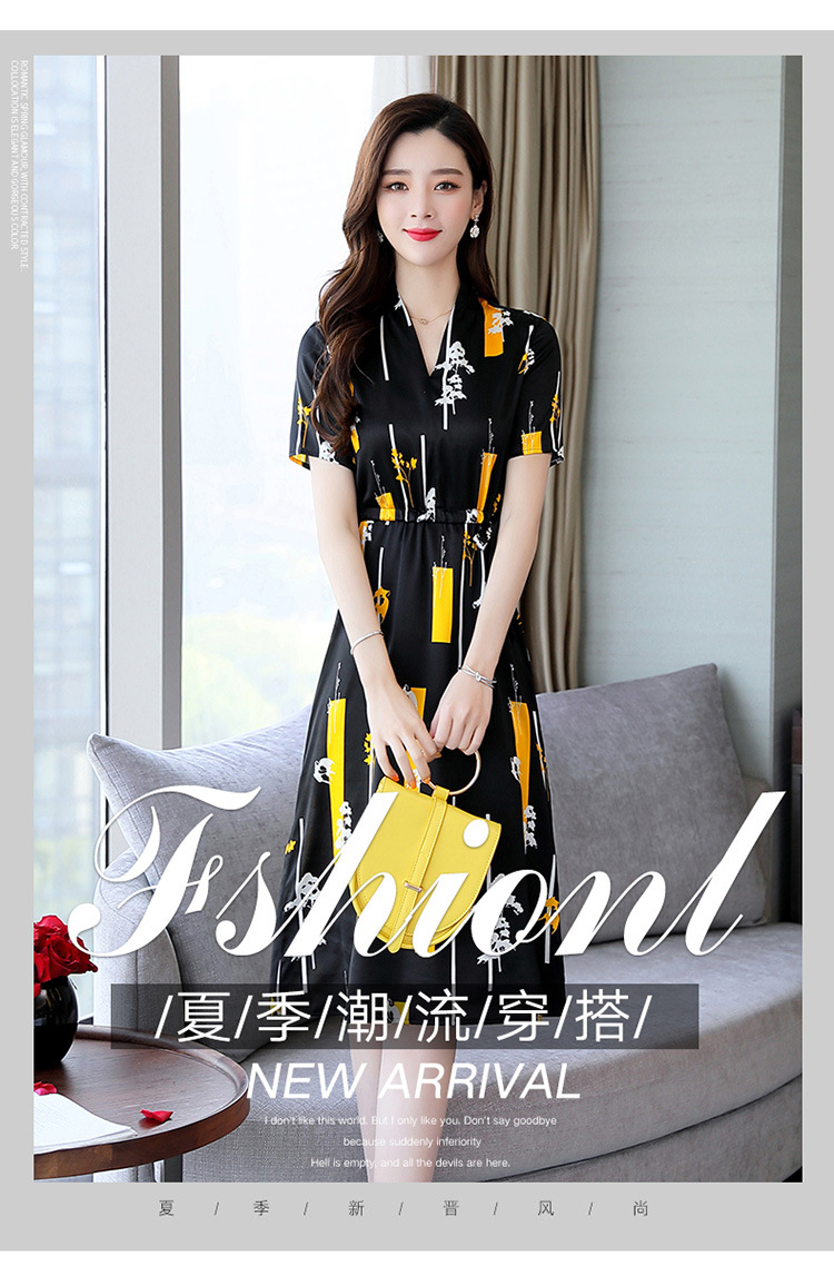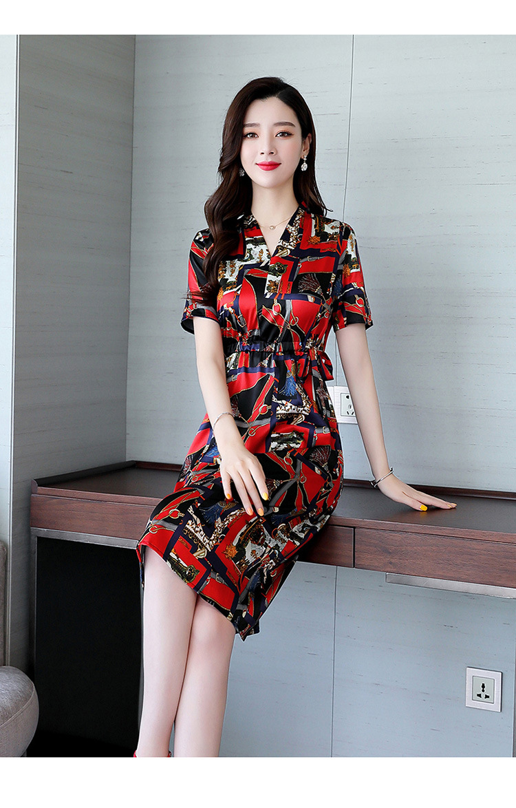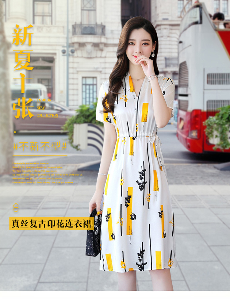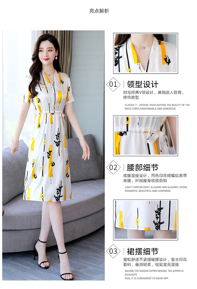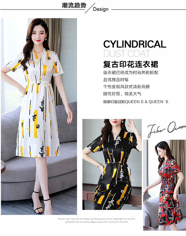 上海旗袍厂ASE-ASE2230真丝复古印花V领连衣裙中长款系带收腰显瘦