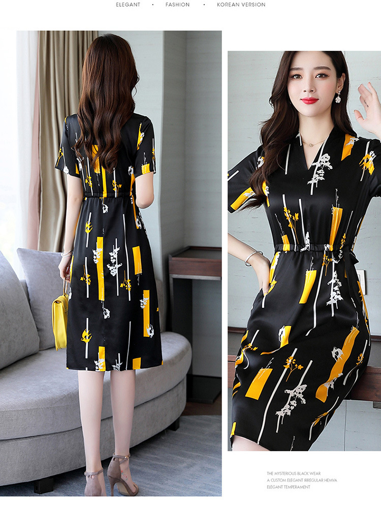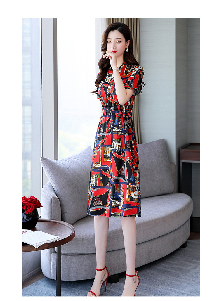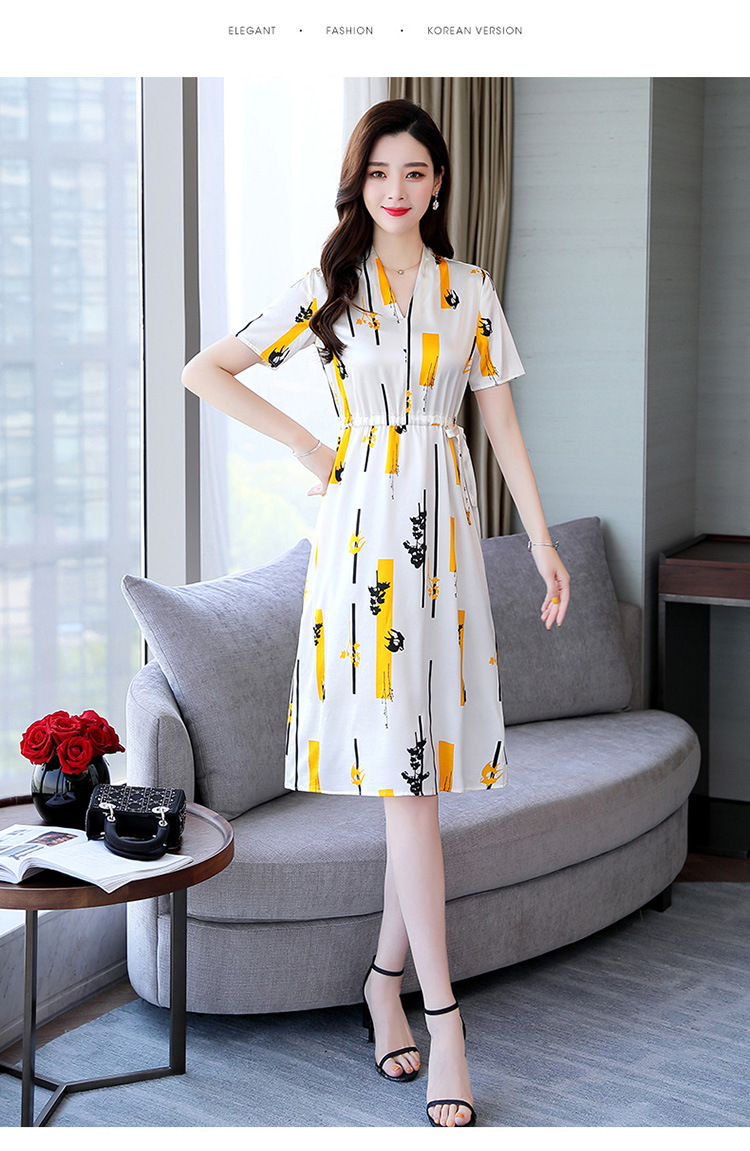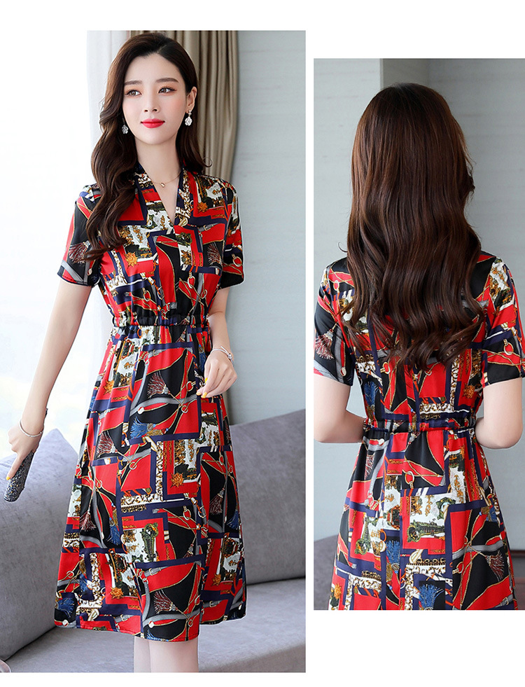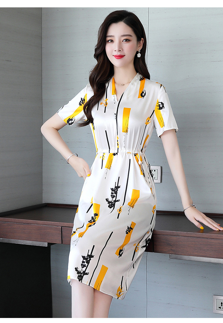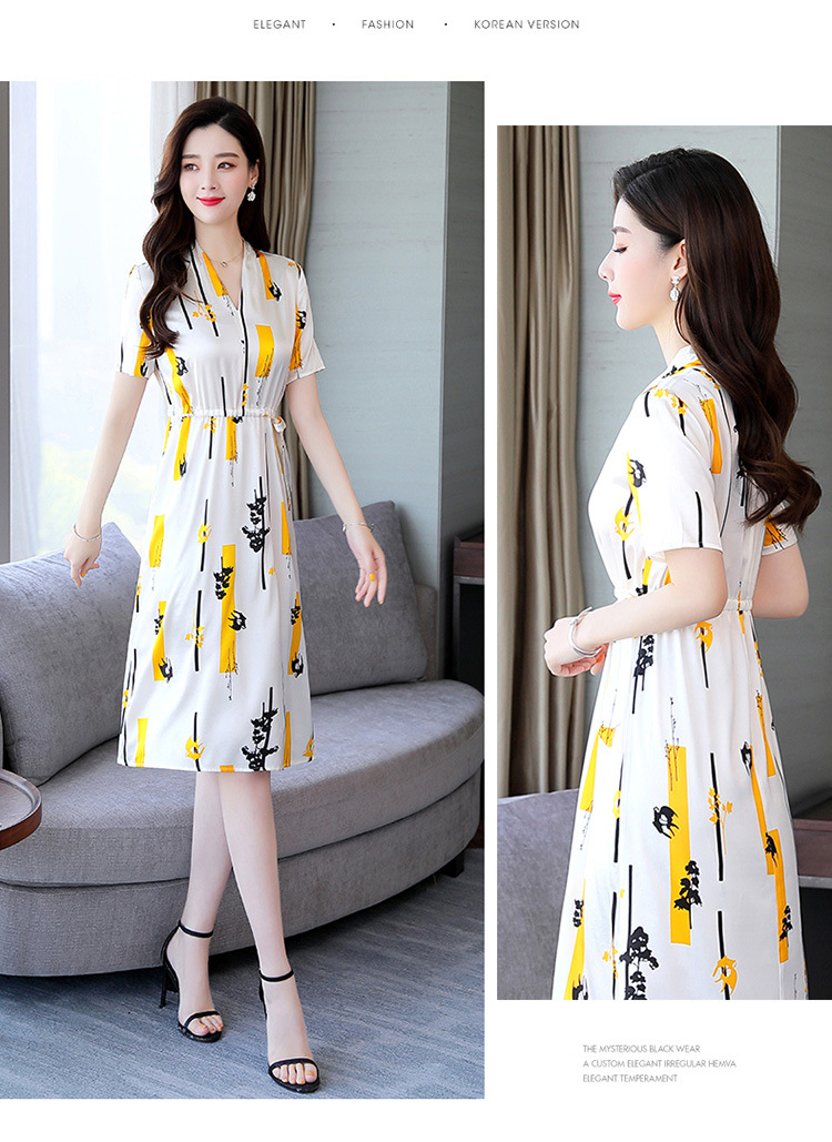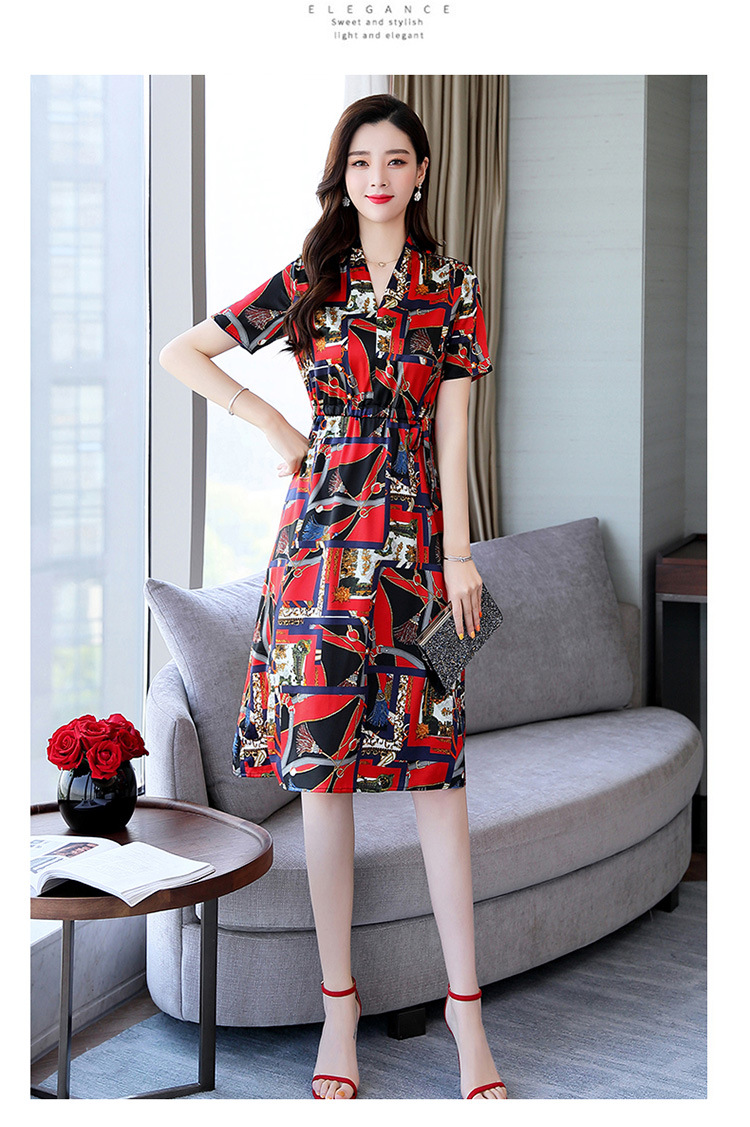 上海旗袍厂ASE-ASE2230真丝复古印花V领连衣裙中长款系带收腰显瘦