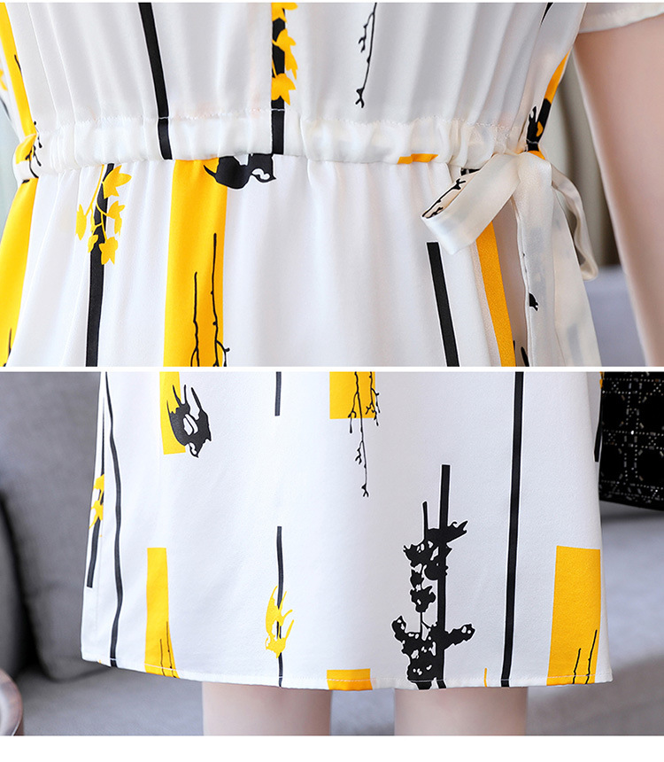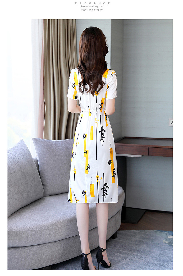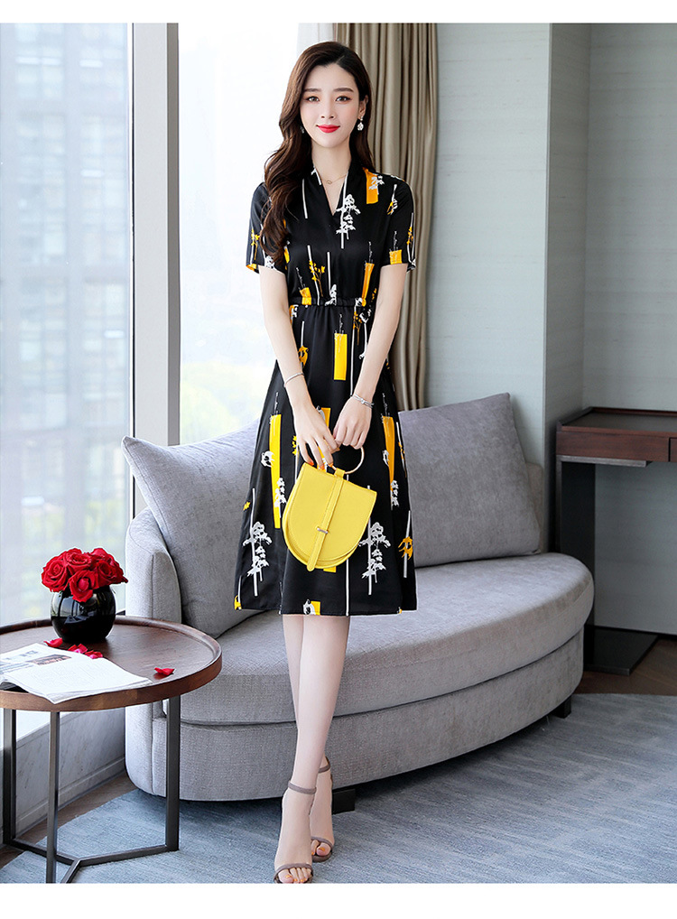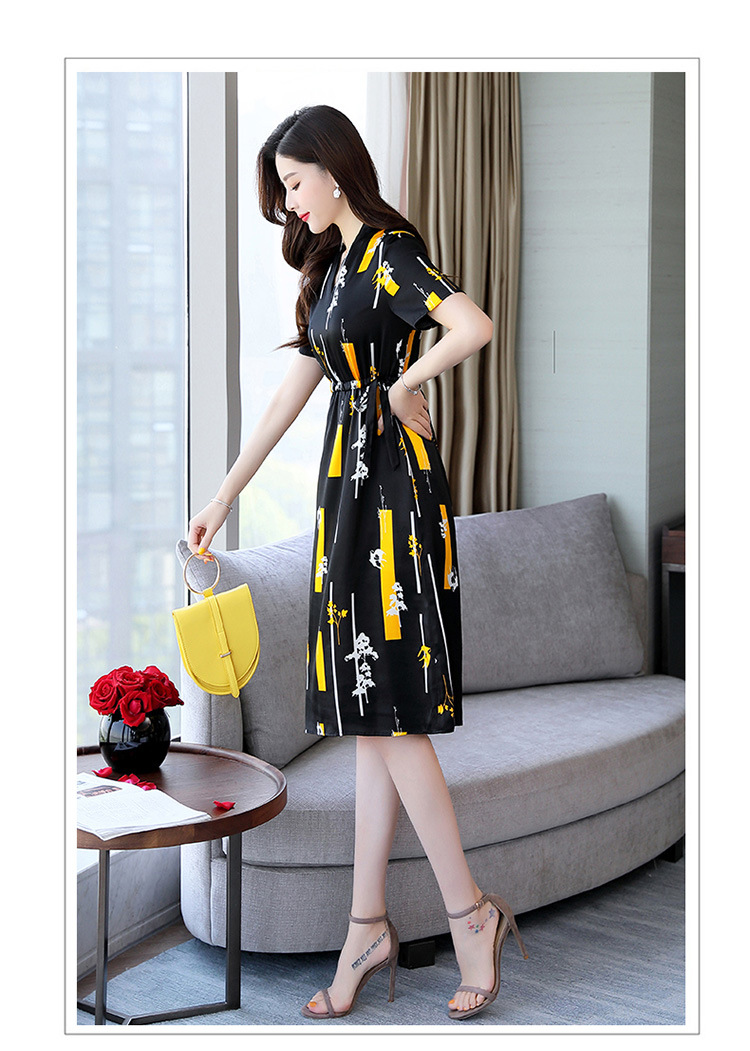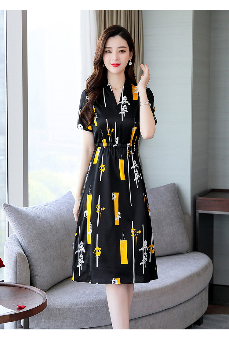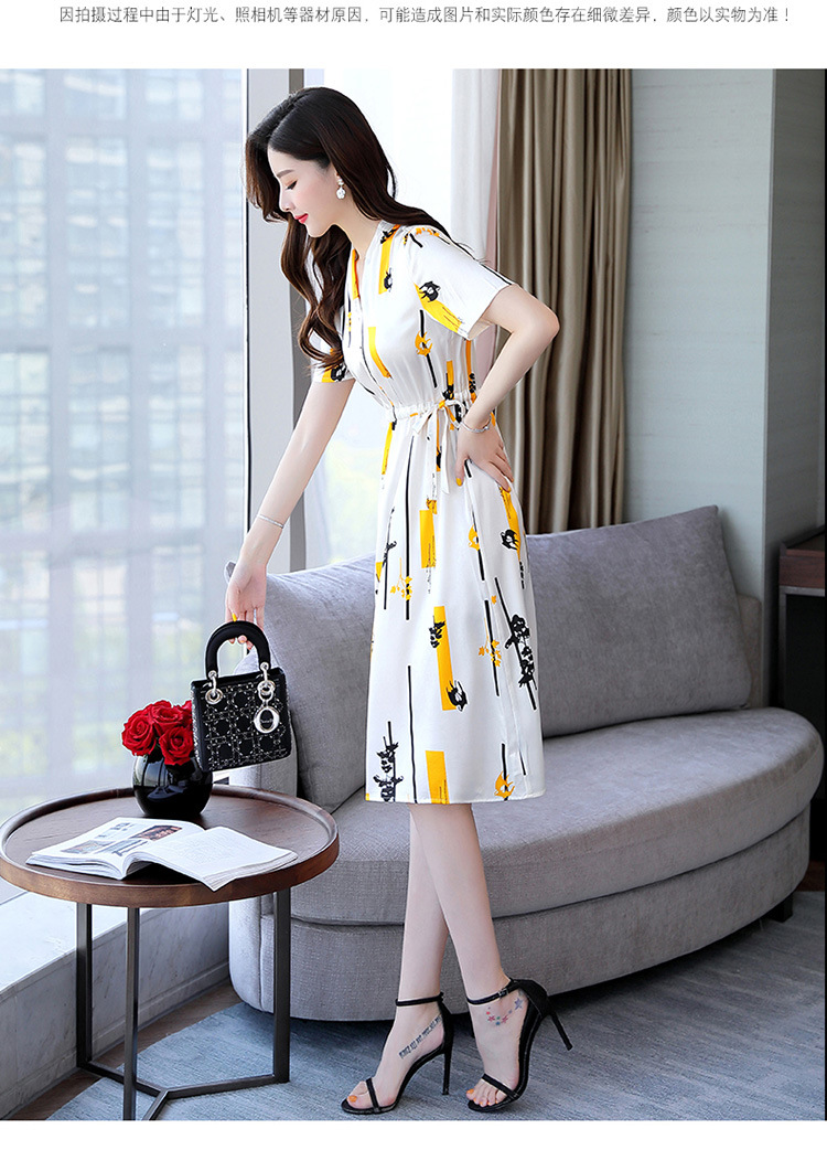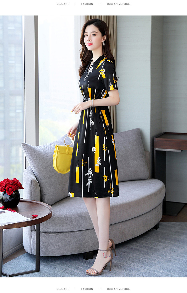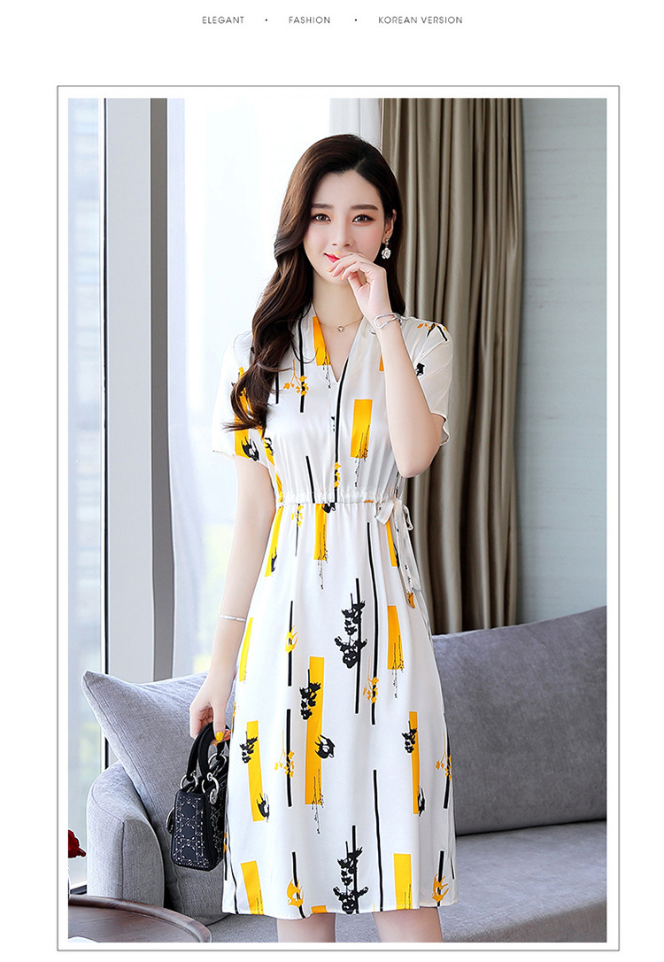 上海旗袍厂ASE-ASE2230真丝复古印花V领连衣裙中长款系带收腰显瘦