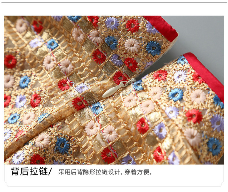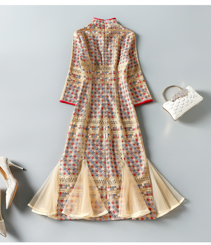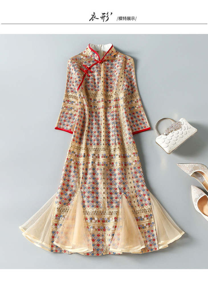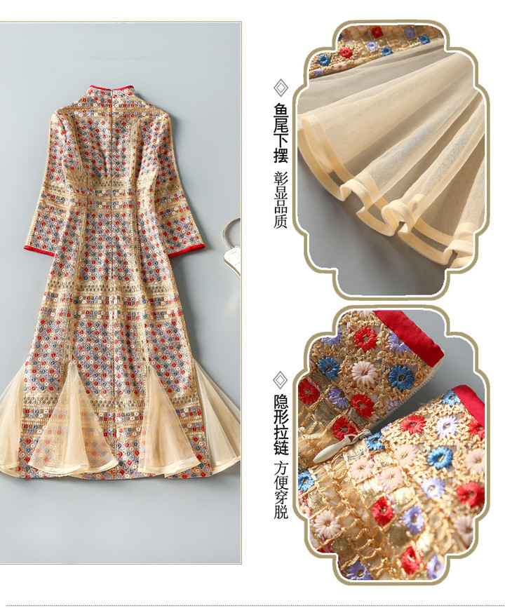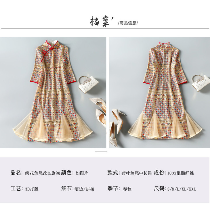 ZSM200825 2022春秋新款女美人鱼连衣裙重工绣花七分袖立领复古改良旗袍裙子