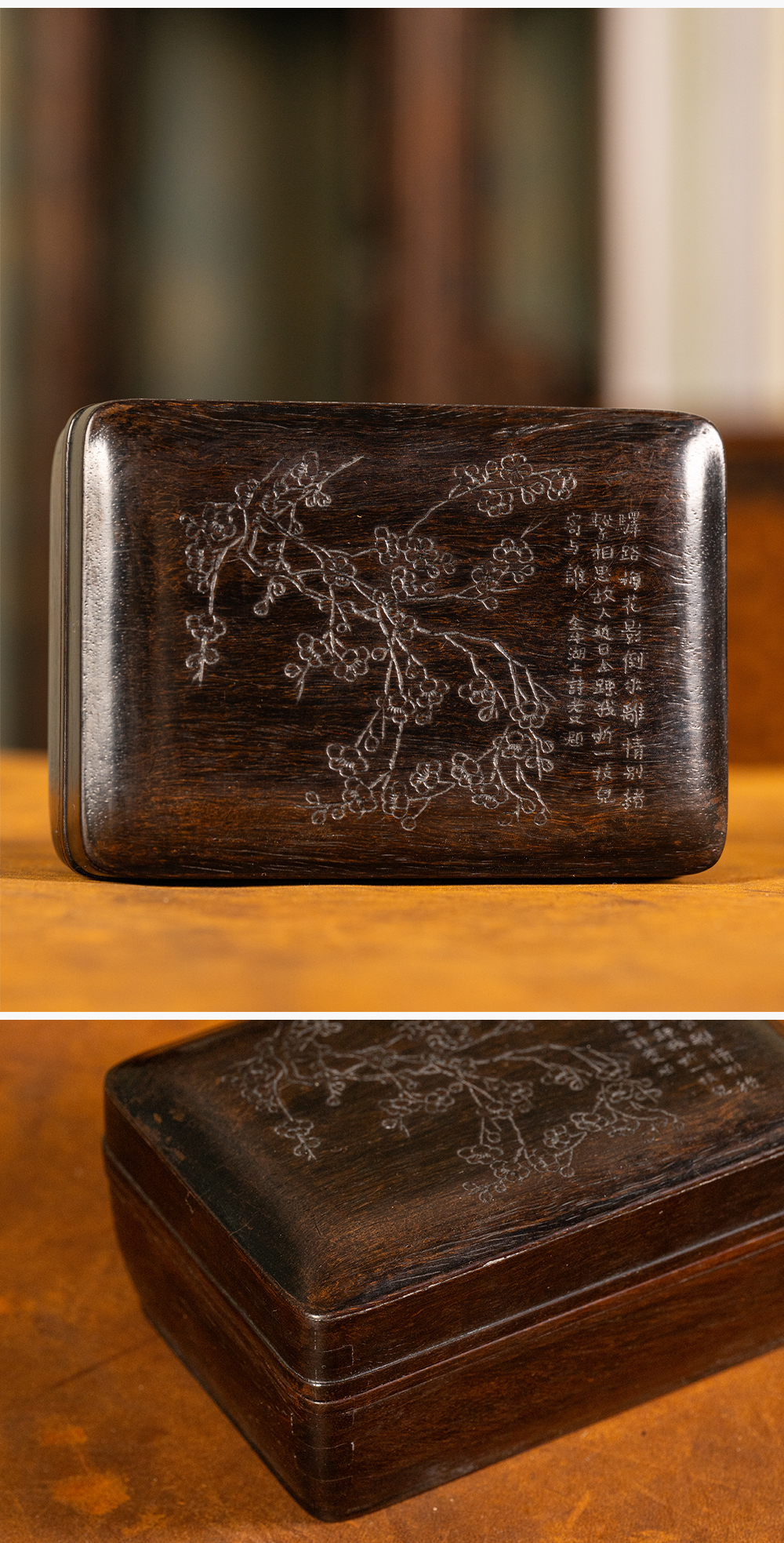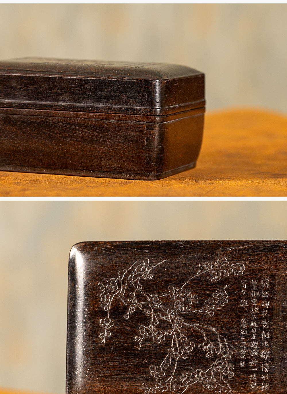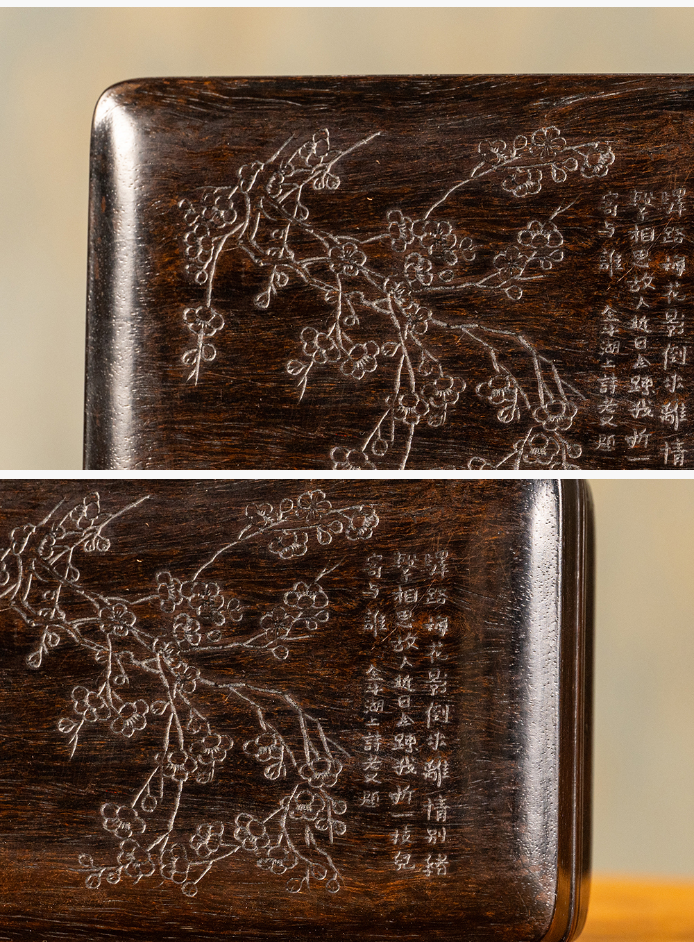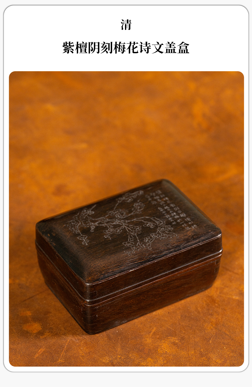 清 紫檀阴刻梅花诗文盖盒