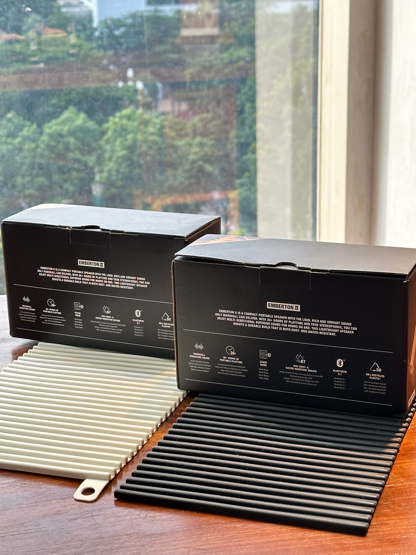 首先外观方面,继承了马歇尔经典的黑金色,还新增了奶油白,顶部和两侧均用硅胶包裹起来,支持 IP67级别的防尘防水,沾到一些水渍也不影响正常使用。