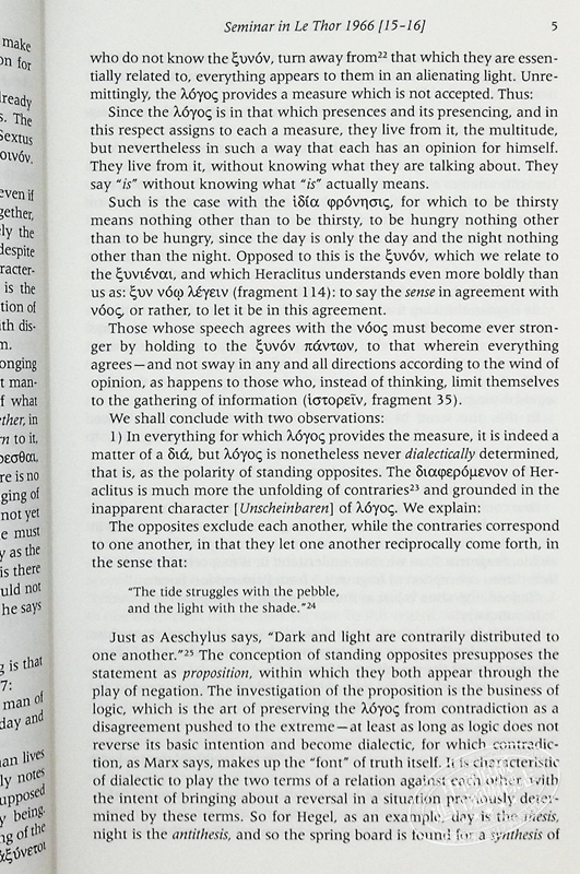 Overall Four Seminars is essentially a glimpse into Heidegger's way of working with students. Its pages recount his effortless command of the sweep of the history of Western philosophy from Anaximander to Husserl and Wittgenstein, his modesty about the accomplishments of Being and Time fifty years after writing the book, his conviction about the fundamental philosophical importance of phenomenological method . . . . Genuine teaching, then, is the demonstration of listening and thinking, not the presentation of content.26.1 2005