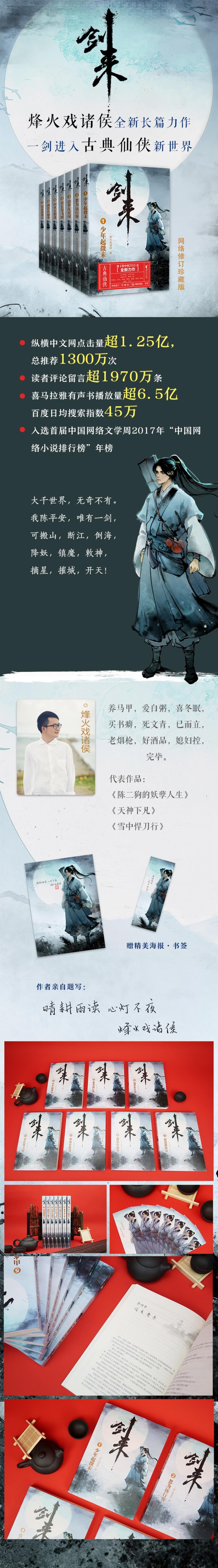 《剑来》是网络超级大神烽火戏诸侯全新创作的一部长篇古典仙侠力作。该书不仅取得了纵横中文网点击量破亿、喜马拉雅有声书播放量超5亿、百度日均所搜指数45万等亮眼的成绩,还荣获第四届橙瓜网络文学奖十大作品及拥有潜力十大动漫IP荣誉,位居2018猫片·胡润原创文学IP潜力价值榜第三名。影视剧改编亦在进行中。《剑来》讲述了小人物陈平安坚守本心,逆境成长的故事。故事中的充溢中浓浓的浩然正气。这套书是首次以纸质图书的形式面试出版。全书精心设计,以水墨风格完美表现出了该书的古典仙侠气质及传统的内核。封面邀请人气画手白衣巷九为封面绘图,著名书法家任平为书名题字。套装还赠送精美海报及明信片,极具收藏加之。