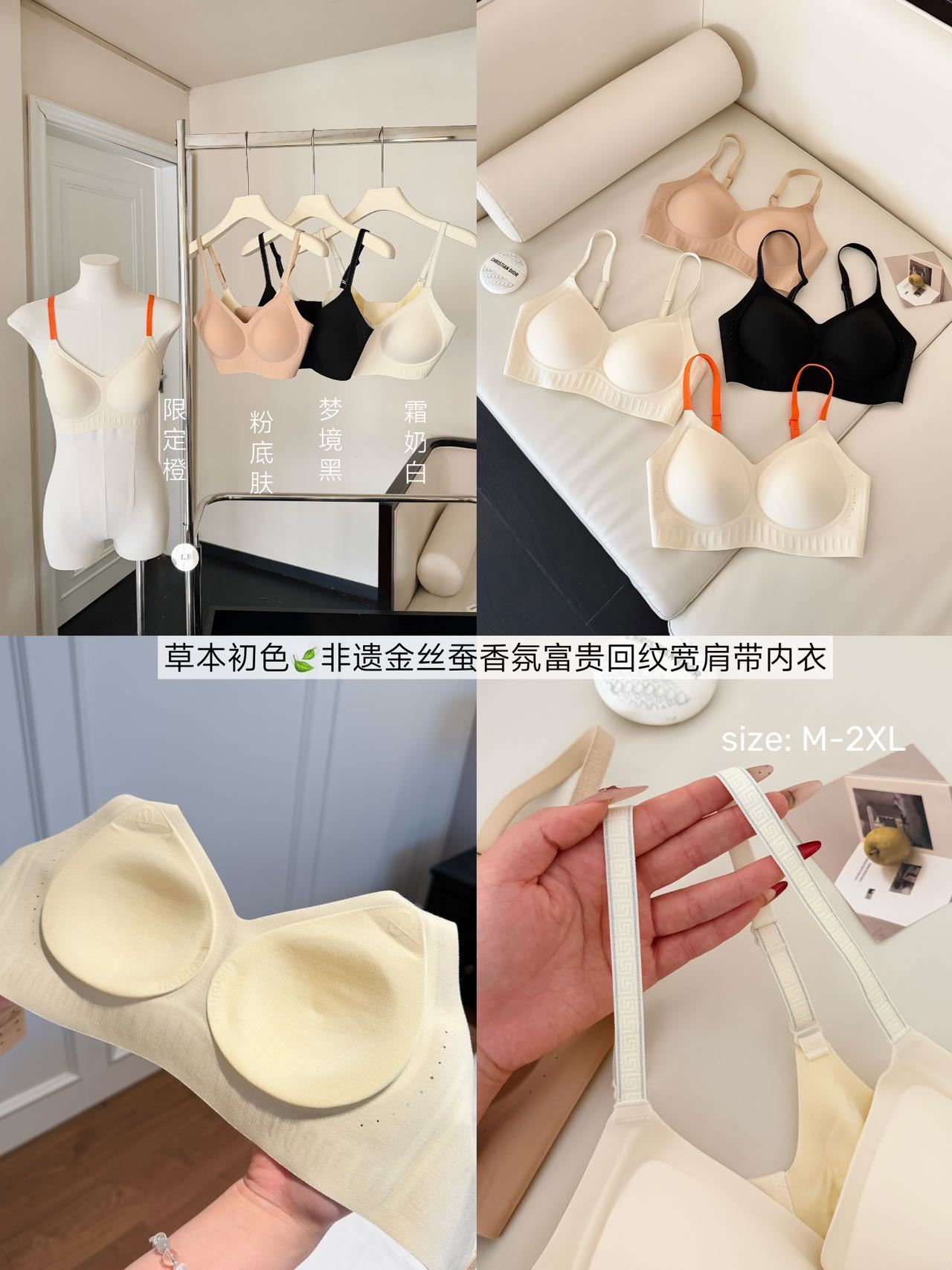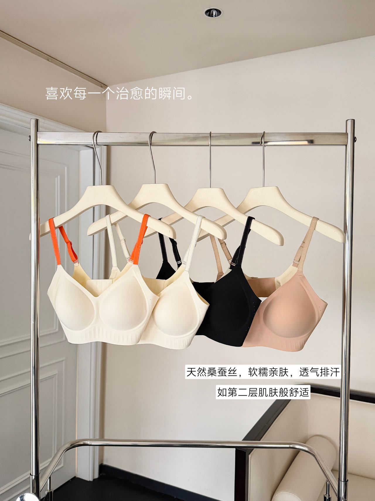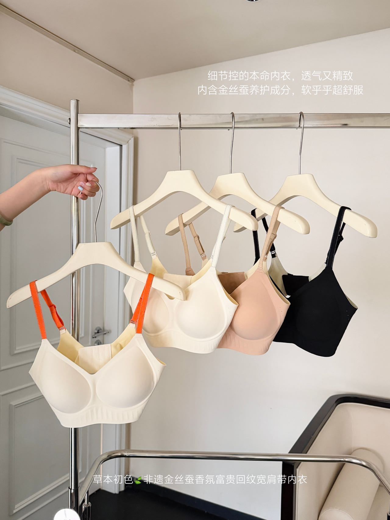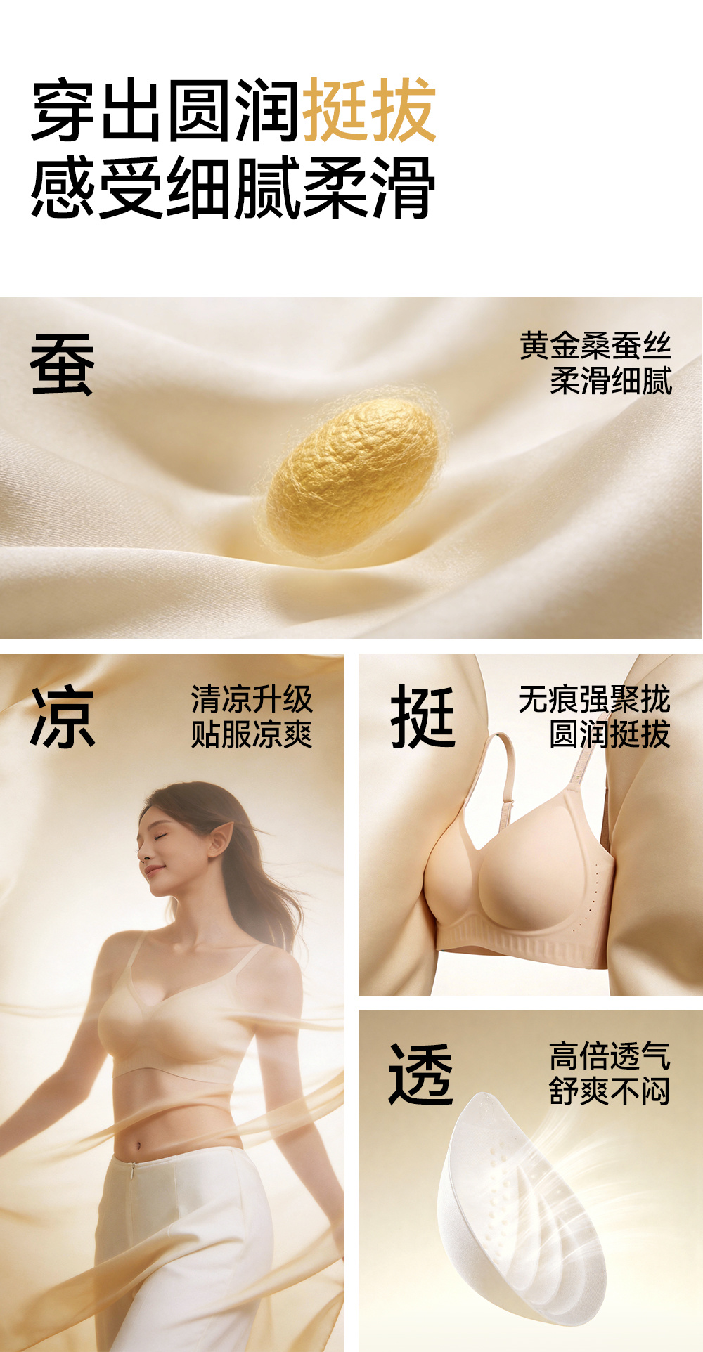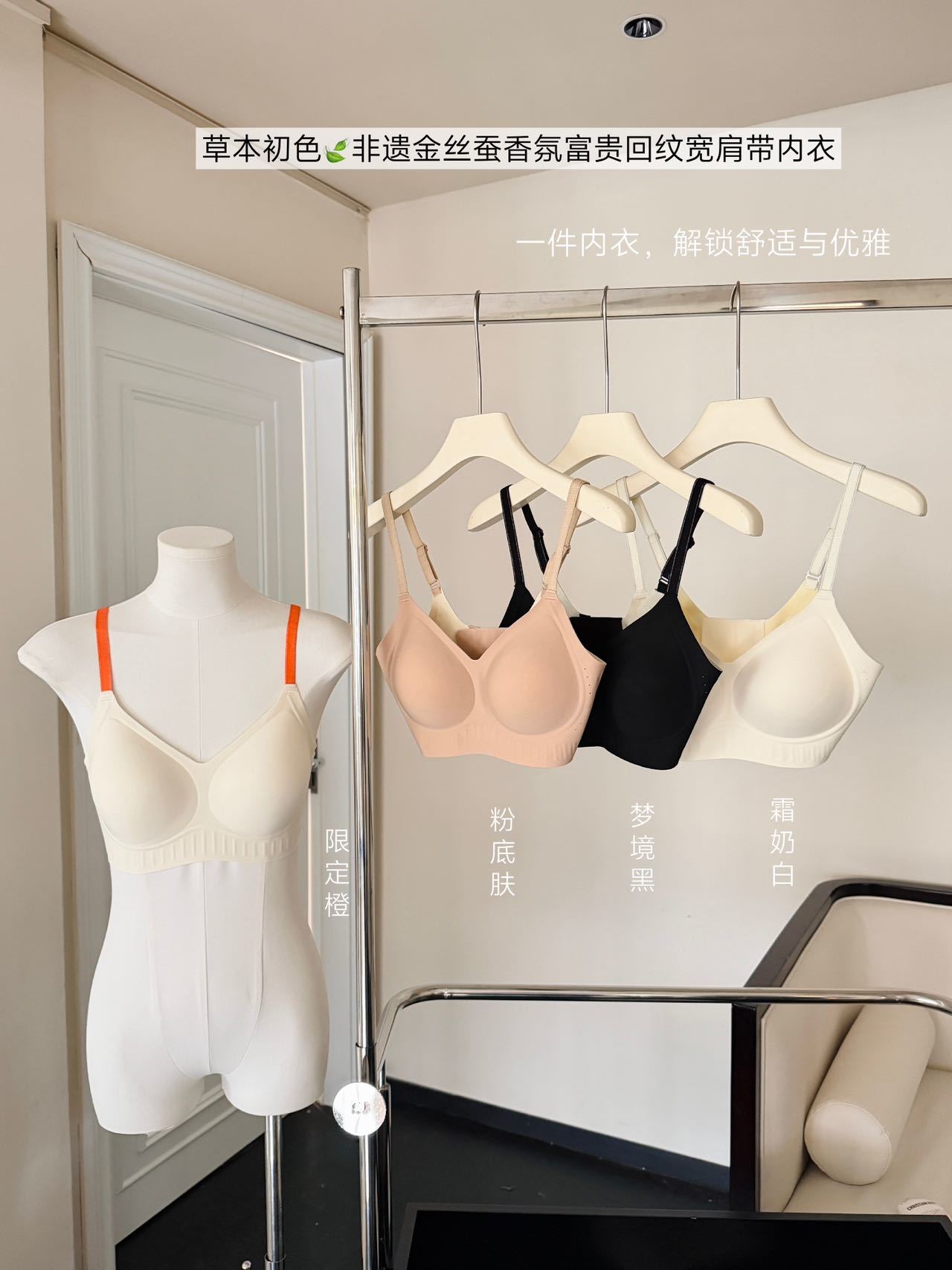 「不止是内衣,更是第二层肌肤」 天然桑蚕丝面料,触感如云朵般软糯,透气孔设计加速空气循环,自带微胶囊香氛,让每一次呼吸都清新自在。