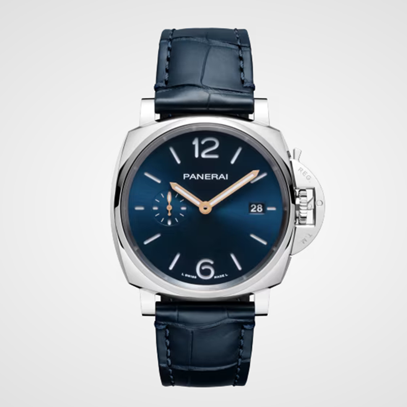 镜面材质 | 蓝宝石水晶玻璃 | 表盘 | 抛光精钢表壳,蓝色太阳放射饰纹,附夜光阿拉伯数字及小时标示。3点钟位置设日期显示,9点钟位置设小秒盘。 功能:时、分、小秒针、日期 精钢表冠护桥(沛纳海专利) |