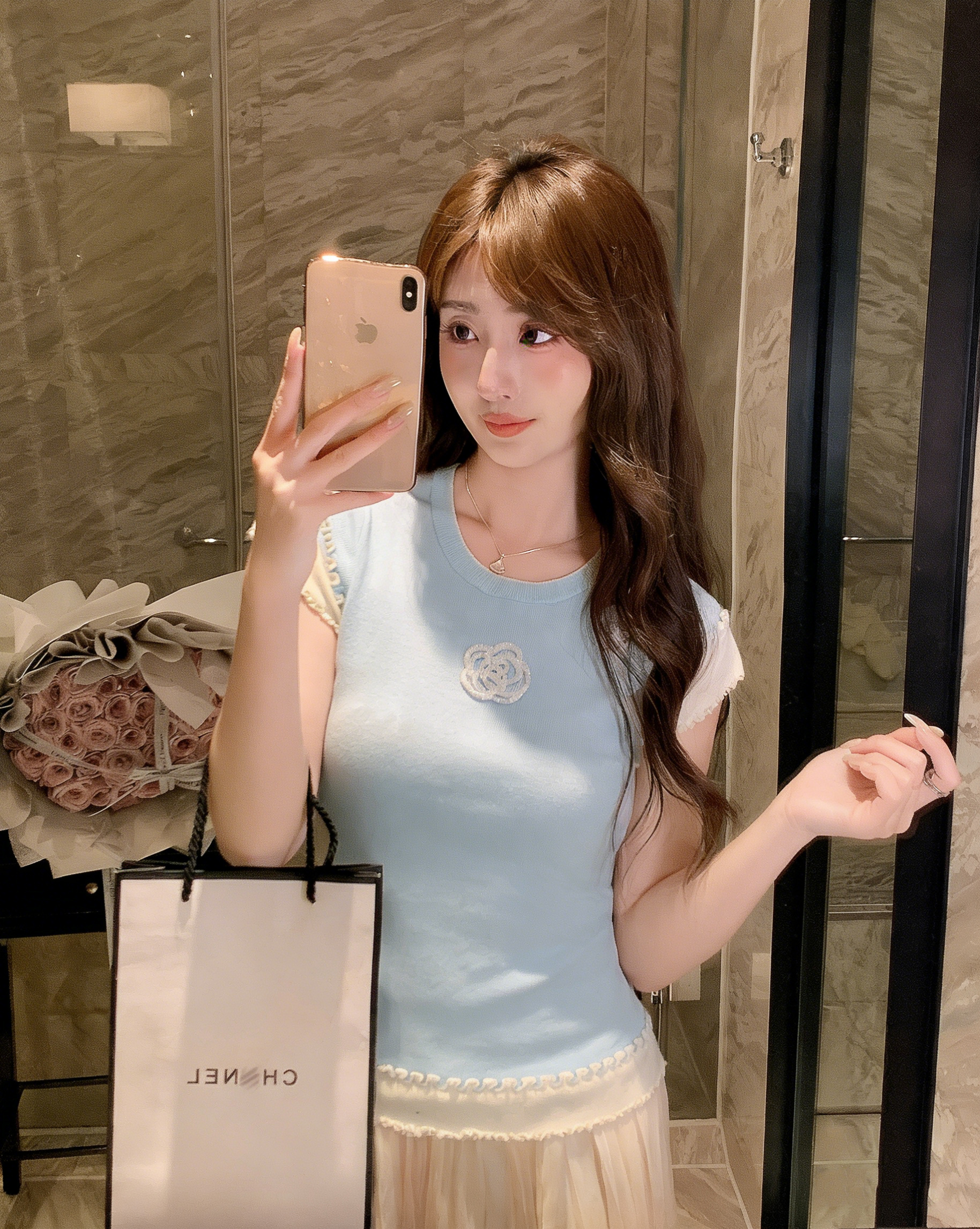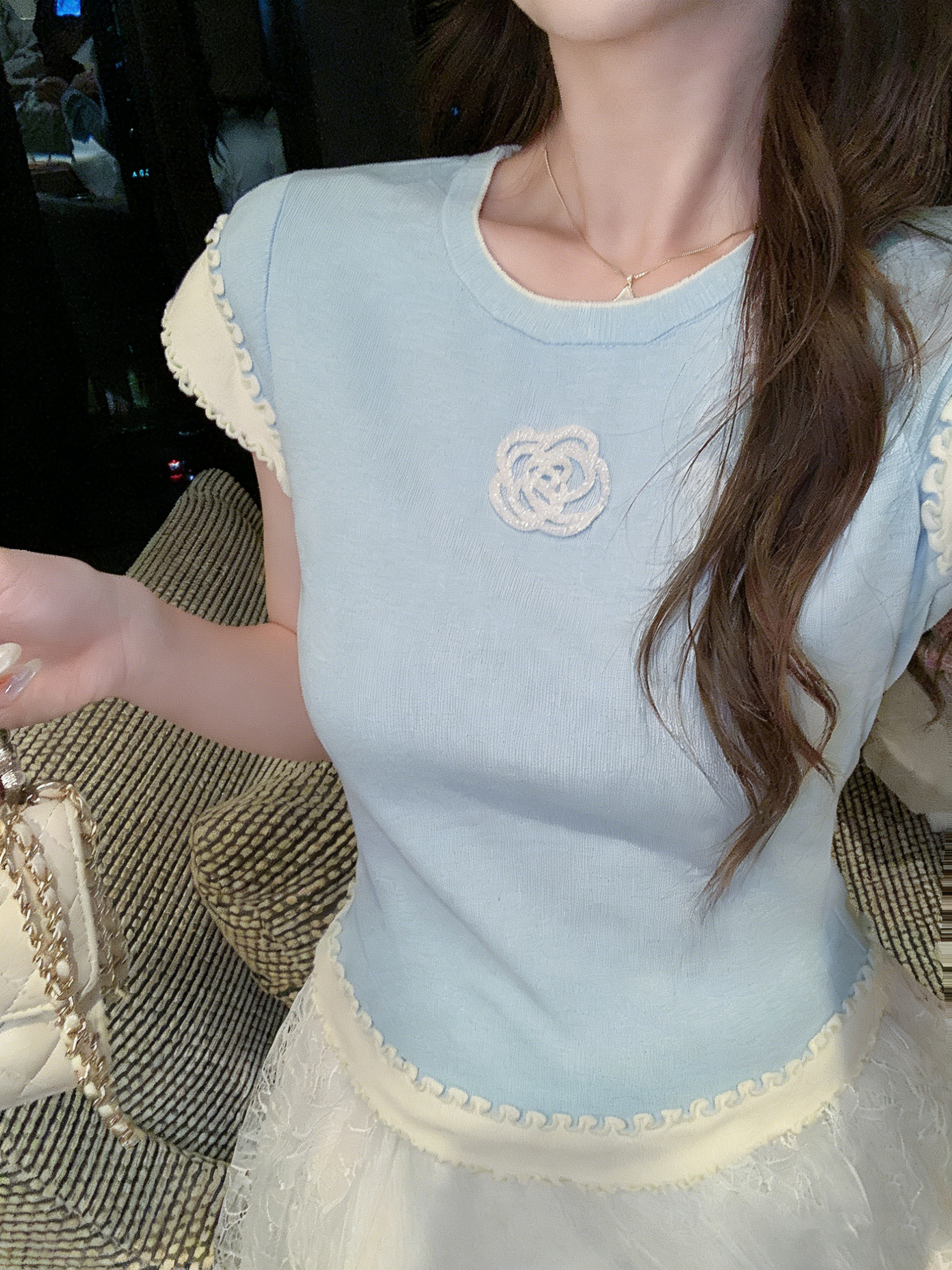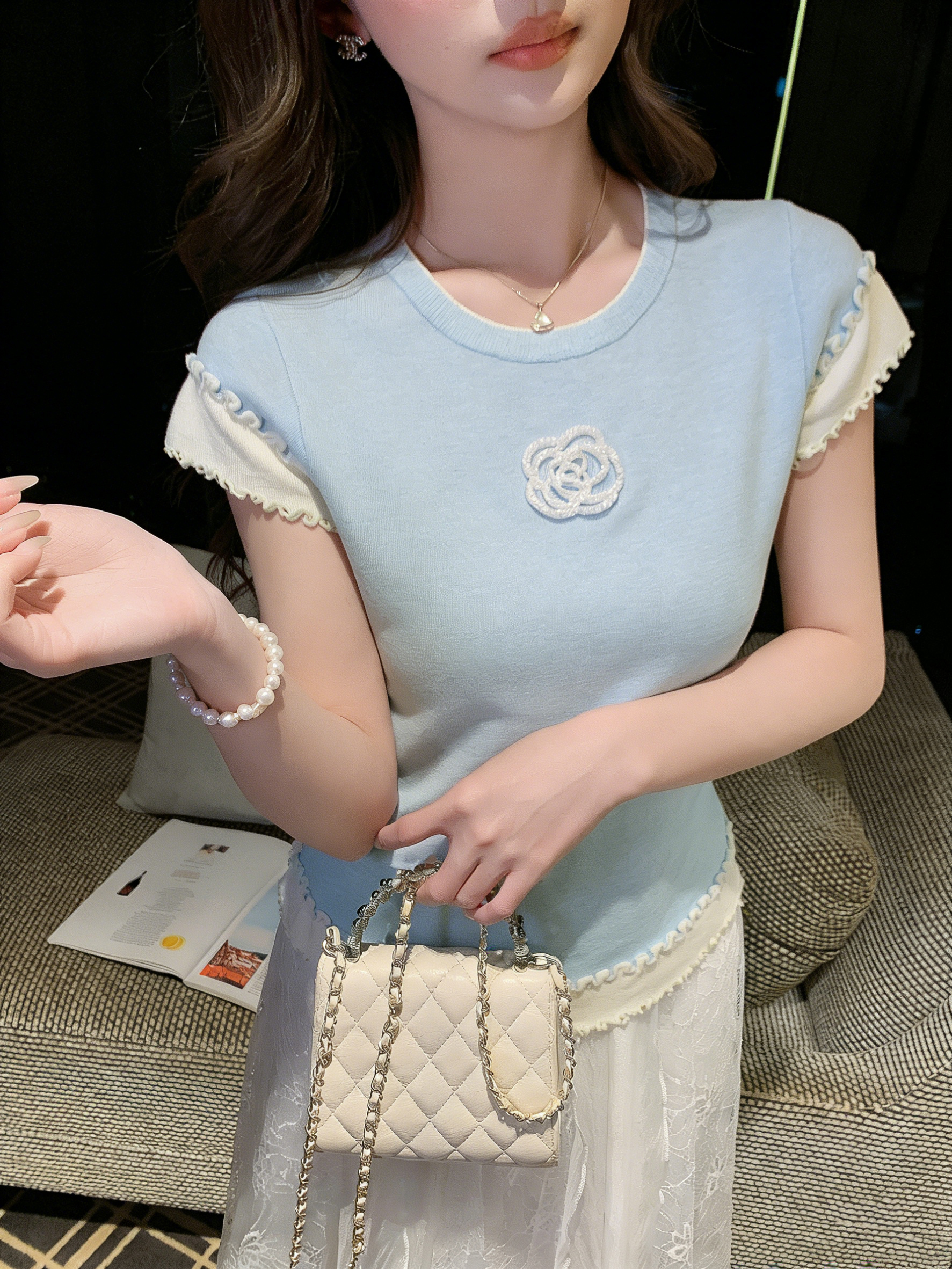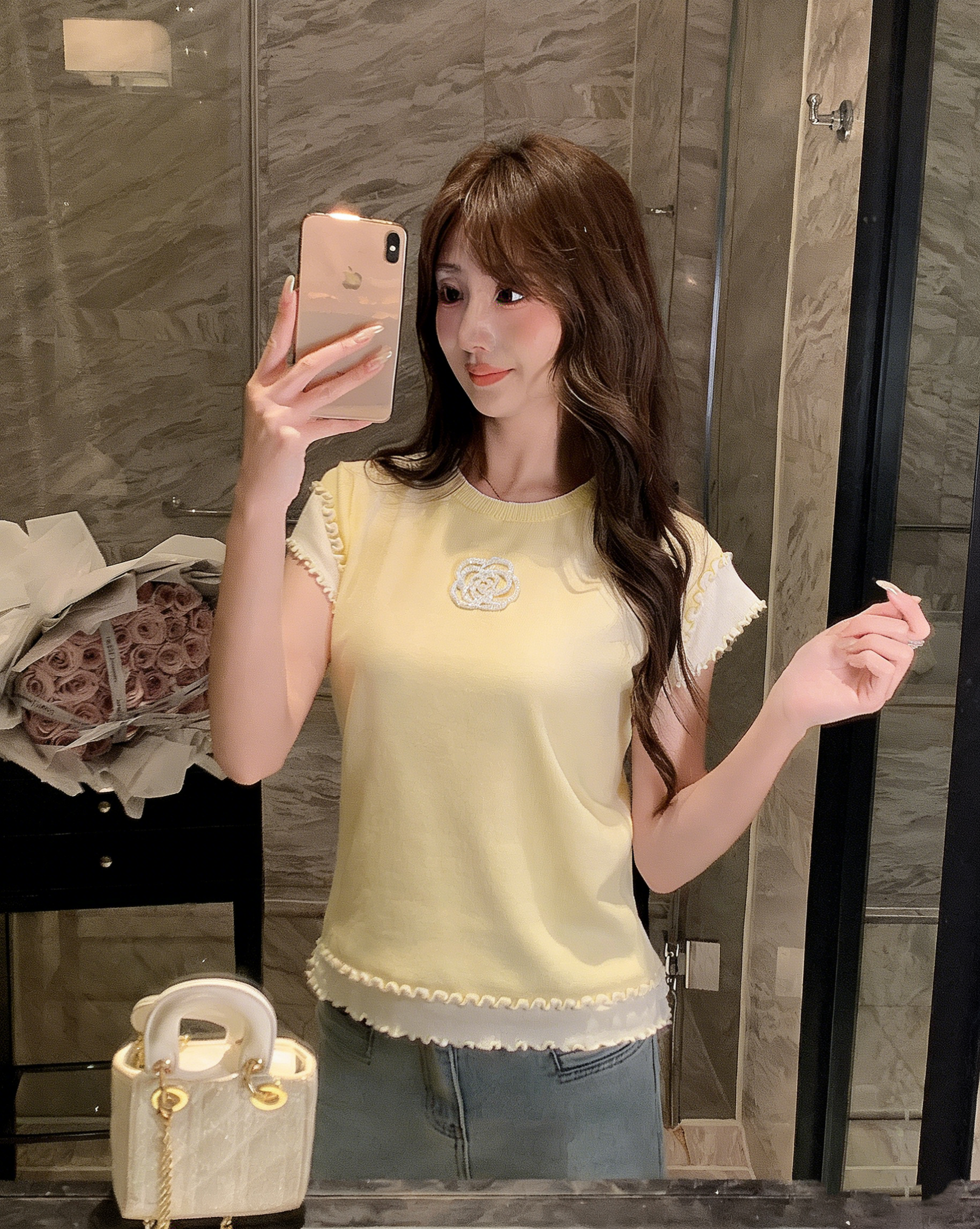 张心子【山茶栀意】圆领气质山茶花撞色花边上衣 U2603006