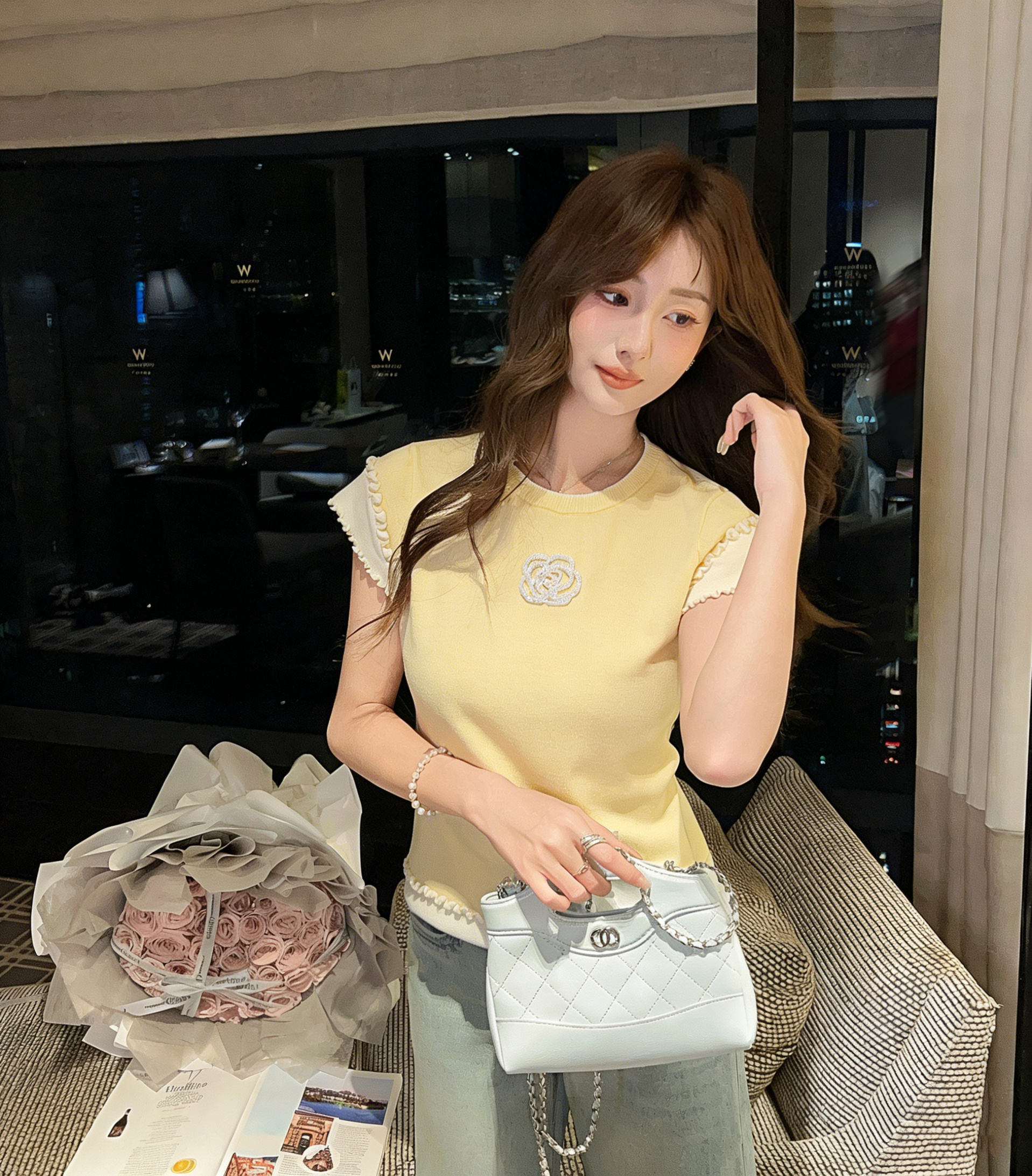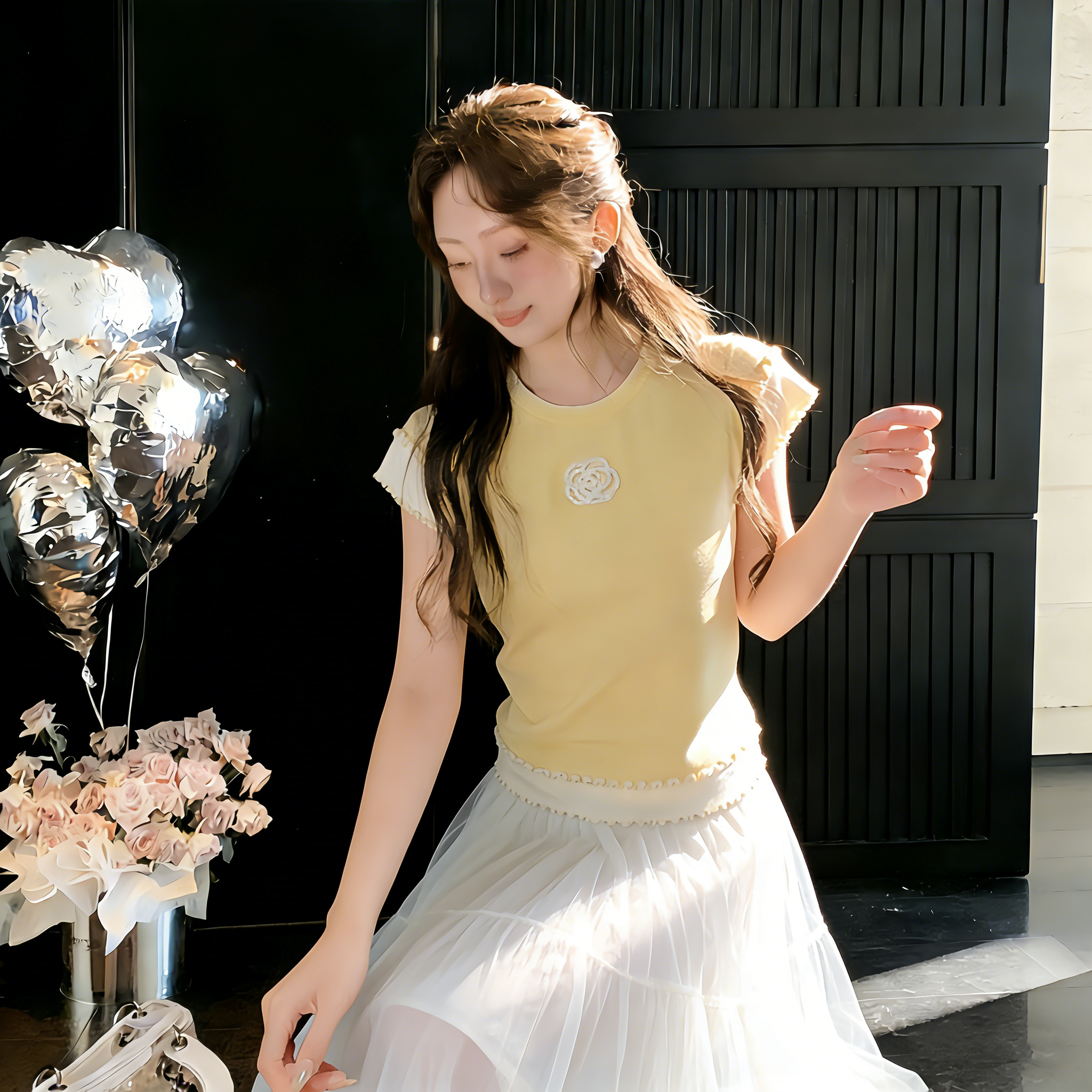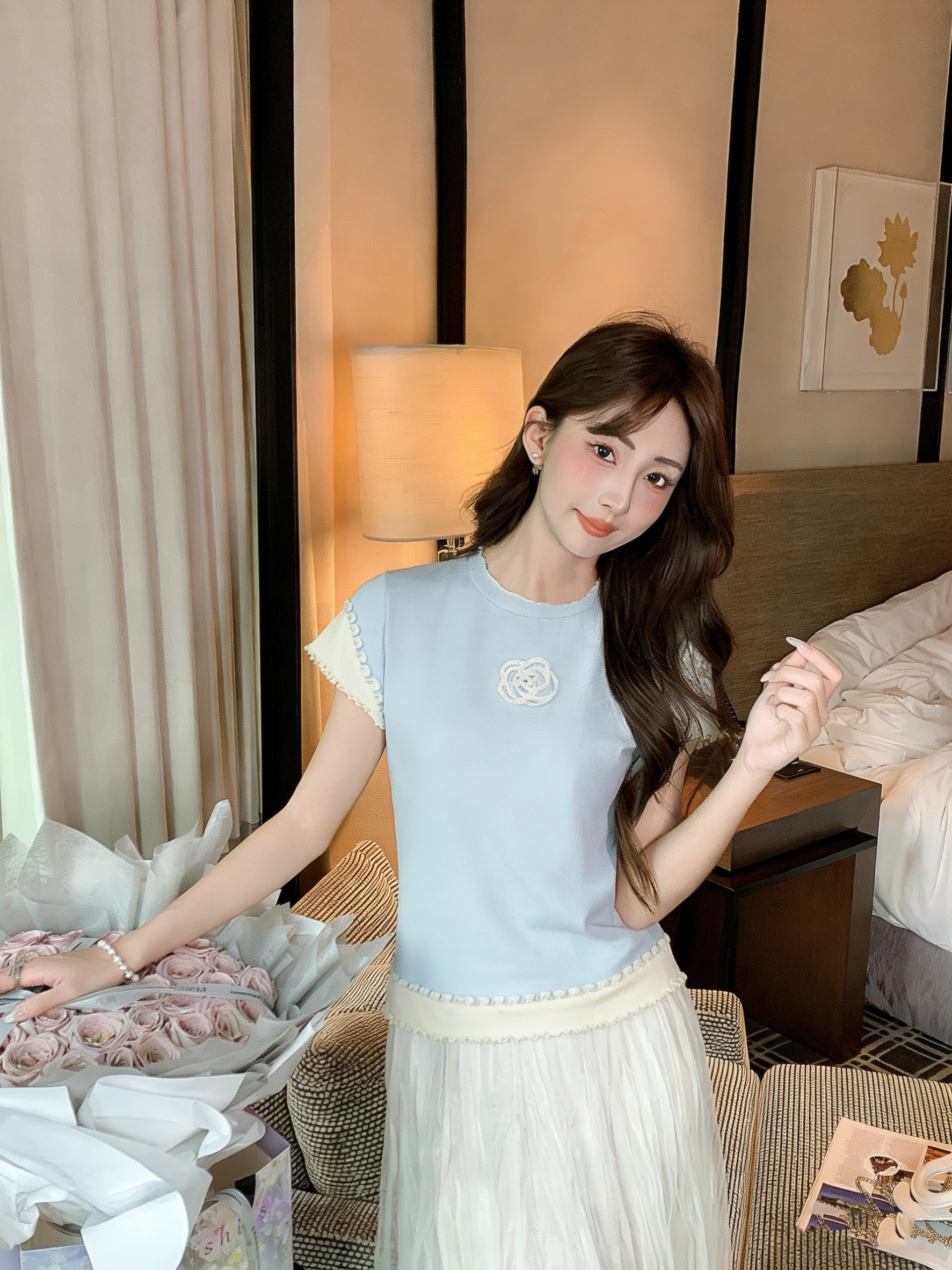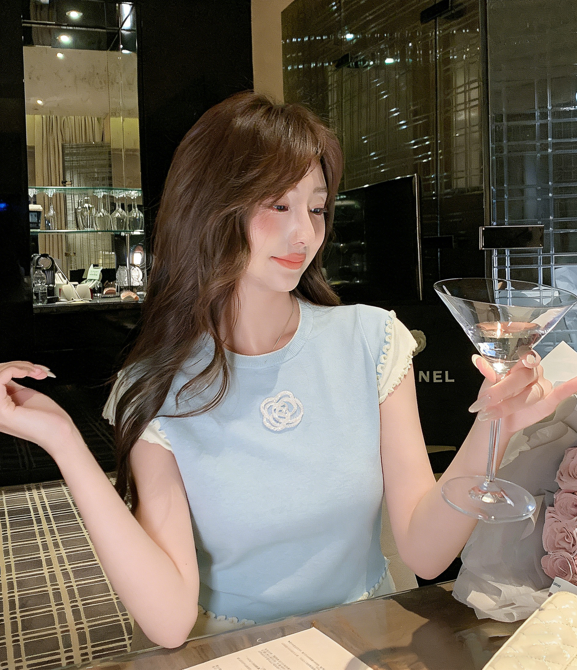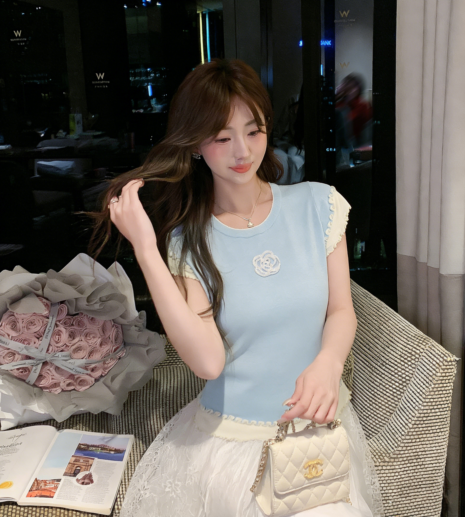 张心子【山茶栀意】圆领气质山茶花撞色花边上衣 U2603006