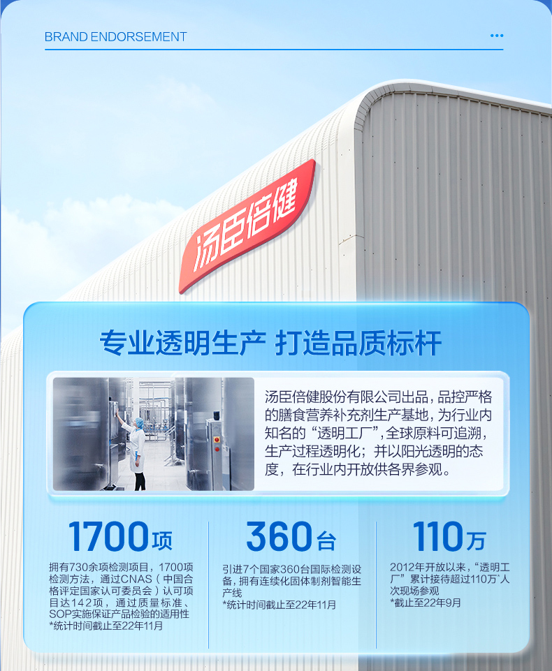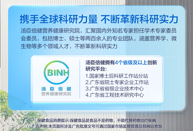 - 作为全球膳食营养补充剂行业领先者,汤臣倍健实施科学营养战略,建立了全面的膳食营养补充剂科学体系,携手全球前沿科研力量,以极致的科学精神,打造极致的科学营养产品力。