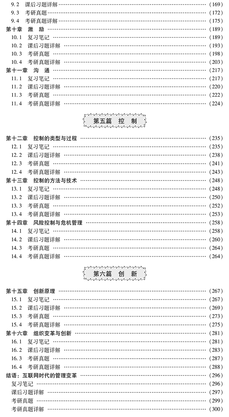 目 录 绪 论 0.1 复习笔记 0.2 课后习题详解 0.3 考研真题 0.4 考研真题详解 *篇 总 论 *章 管理与管理活动 1.1 复习笔记 1.2 课后习题详解 1.3 考研真题 1.4 考研真题详解 *章 管理理论的历史演变 2.1 复习笔记 2.2 课后习题详解 2.3 考研真题 2.4 考研真题详解 *篇 决 策 第三章 决策与决策过程 3.1 复习笔记 3.2 课后习题详解 3.3 考研真题 3.4 考研真题详解 第四章 环境分析与决策 4.1 复习笔记 4.2 课后习题详解 4.3 考研真题 4.4 考研真题详解 第五章 决策的实施与调整 5.1 复习笔记 5.2 课后习题详解 5.3 考研真题 5.4 考研真题详解 第三篇 组 织 第六章 组织设计 6.1 复习笔记 6.2 课后习题详解 6.3 考研真题 6.4 考研真题详解 第七章 人员配备 7.1 复习笔记 7.2 课后习题详解 7.3 考研真题 7.4 考研真题详解 第八章 组织文化 8.1 复习笔记 8.2 课后习题详解 8.3 考研真题 8.4 考研真题详解 第四篇 领 导 第九章 领导的一般理论 9.1 复习笔记 9.2 课后习题详解 9.3 考研真题 9.4 考研真题详解 第十章 激 励 10.1 复习笔记 10.2 课后习题详解 10.3 考研真题 10.4 考研真题详解 第十一章 沟 通 11.1 复习笔记 11.2 课后习题详解 11.3 考研真题 11.4 考研真题详解 第五篇 控 制 第十二章 控制的类型与过程 12.1 复习笔记 12.2 课后习题详解 12.3 考研真题 12.4 考研真题详解 第十三章 控制的方法与技术 13.1 复习笔记 13.2 课后习题详解 13.3 考研真题 13.4 考研真题详解 第十四章 风险控制与危机管理 14.1 复习笔记 14.2 课后习题详解 14.3 考研真题 14.4 考研真题详解 第六篇 创 新 第十五章 创新原理 15.1 复习笔记 15.2 课后习题详解 15.3 考研真题 15.4 考研真题详解 第十六章 组织变革与创新 16.1 复习笔记 16.2 课后习题详解 16.3 考研真题 16.4 考研真题详解 结语:互联网时代的管理变革 复习笔记 课后习题详解 考研真题 考研真题详解