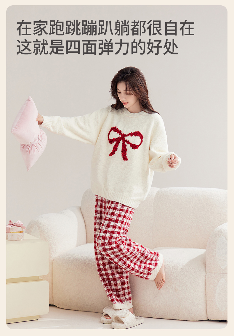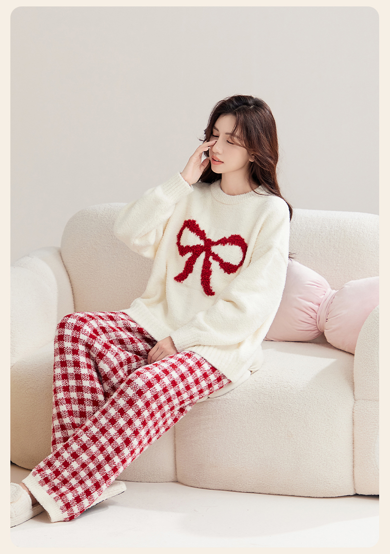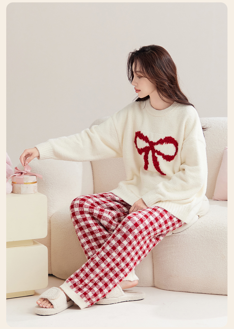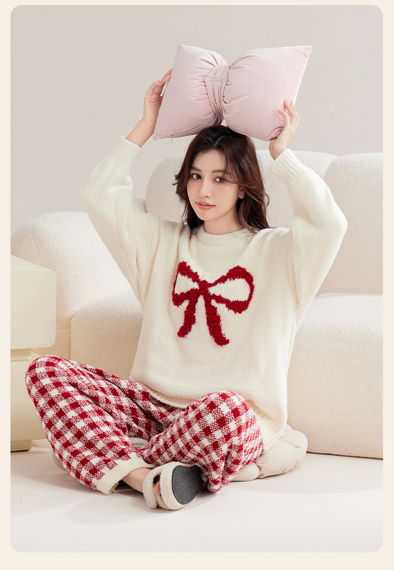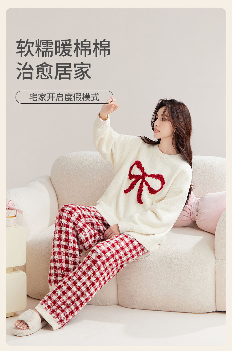 洁丽雅秋冬半边绒女睡衣甜美蝴蝶结长绒保暖柔软舒适家居服套装女