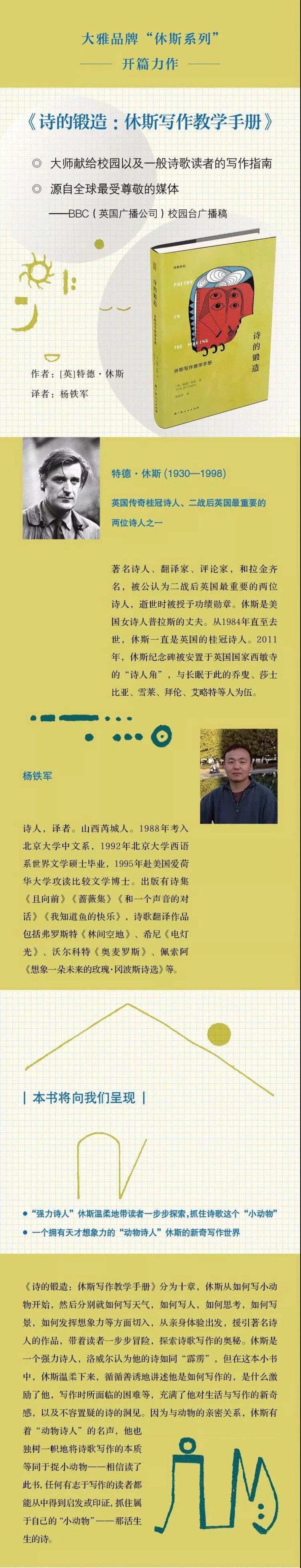 有名诗人、翻译家、评论家,二战后英国最重要的两位诗人之一。休斯是美国女诗人普拉斯的丈夫。他一生写了40多部作品,出版有《雨中鹰》《乌鸦之歌》《生日信札》等诗集,《诗的锻造:休斯写作教学手册》《冬日花粉:休斯文集》等文集。从1984年直至去世,休斯一直是英国的桂冠诗人。休斯早期的诗多以自然之美和自然中的暴力为主题,后期的诗在强悍之中注入一股沉郁顿挫之气,突出了诗人对生命的觉醒和顿悟。2011年,休斯纪念碑被安置于英国国家西敏寺的“诗人角”,与长眠于此的乔叟、莎士比亚、雪莱、拜伦、艾略特等人为伍。
