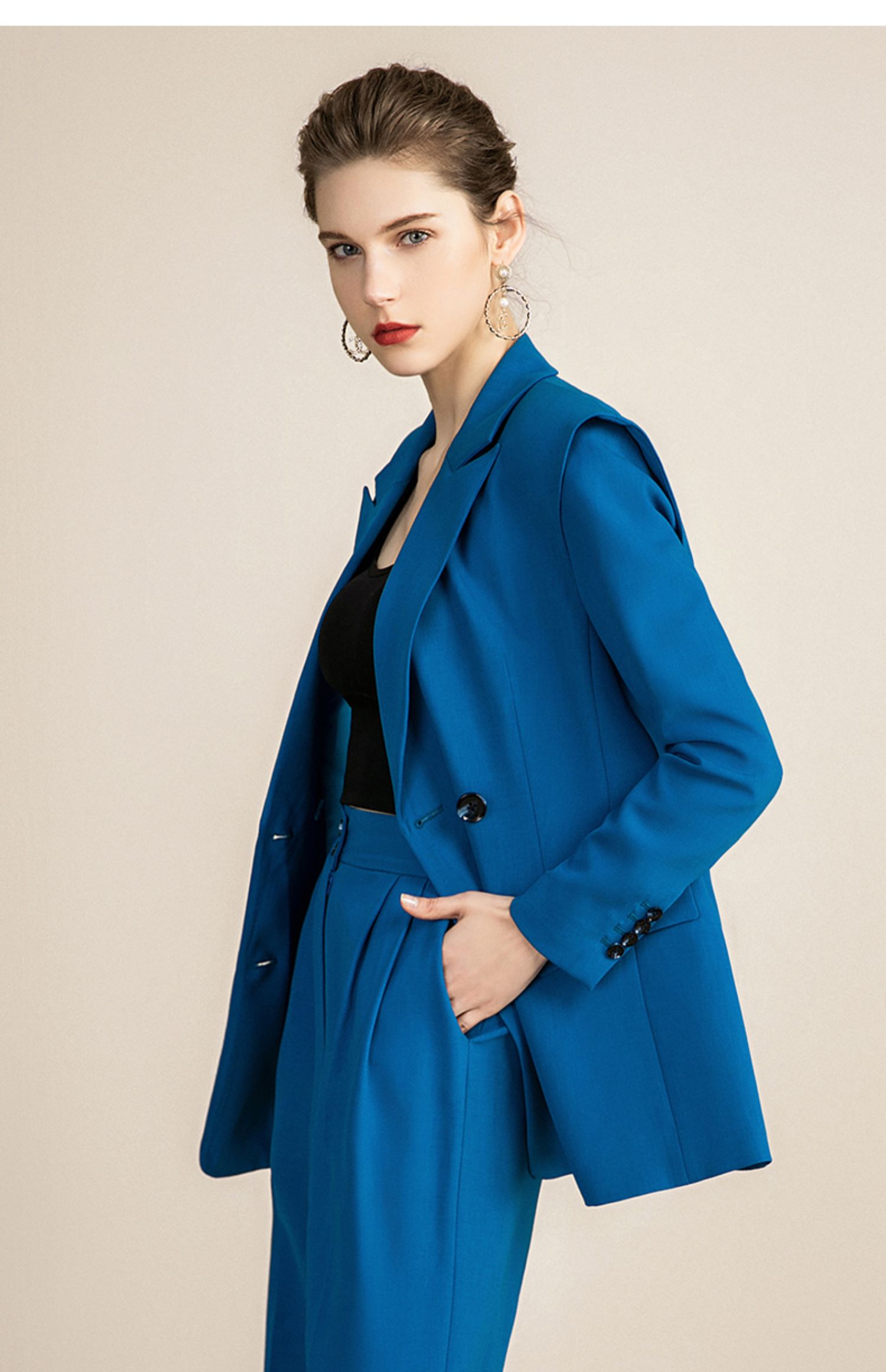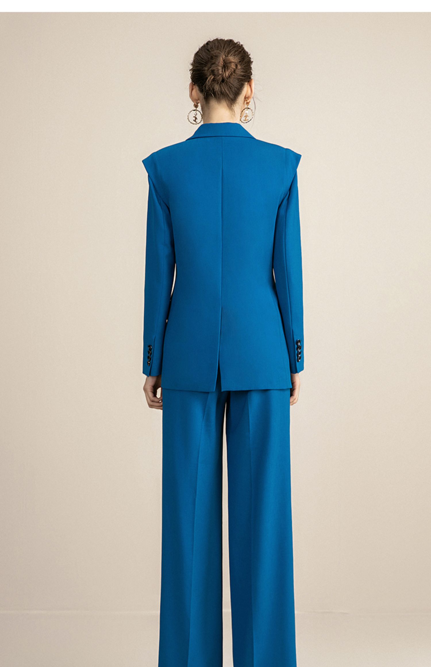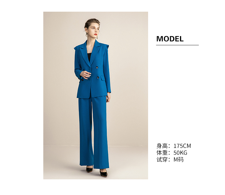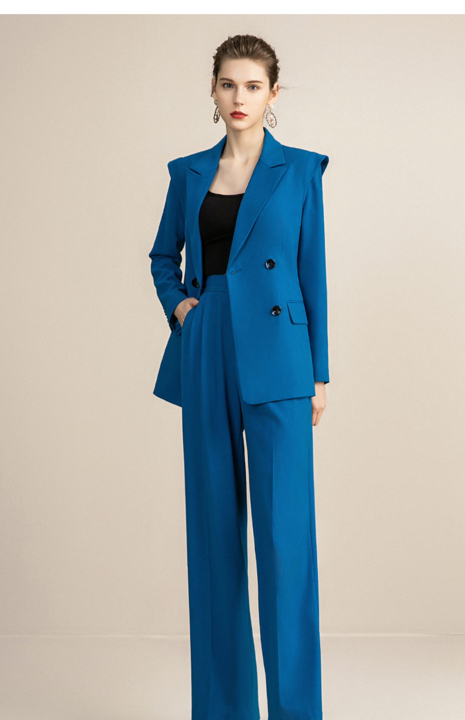 IWY/蓝色休闲时尚套装女阔腿裤职业装双排扣修身韩版西装工作服OL 213151C1+P6