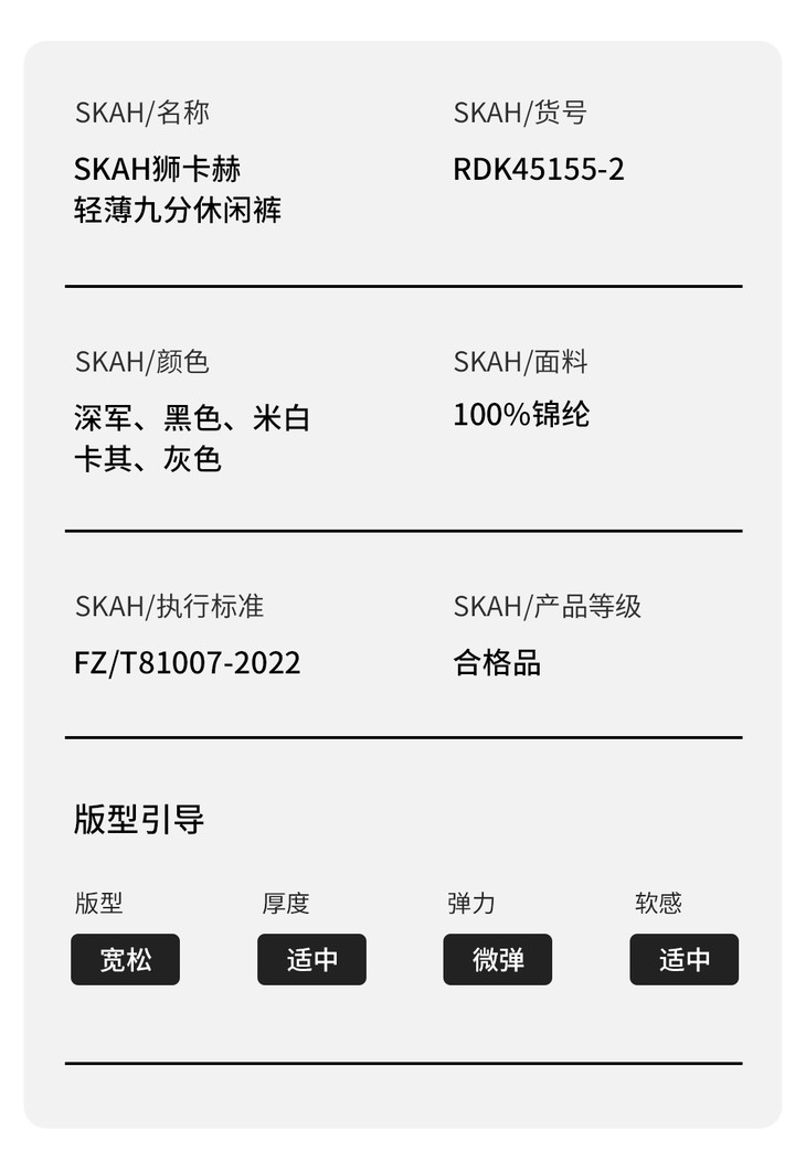 【舒适轻盈体感】SKAH狮卡赫轻薄九分休闲裤RDK45155-2 夏季薄款日常通勤出行百搭运动 细腻触感透气中长裤