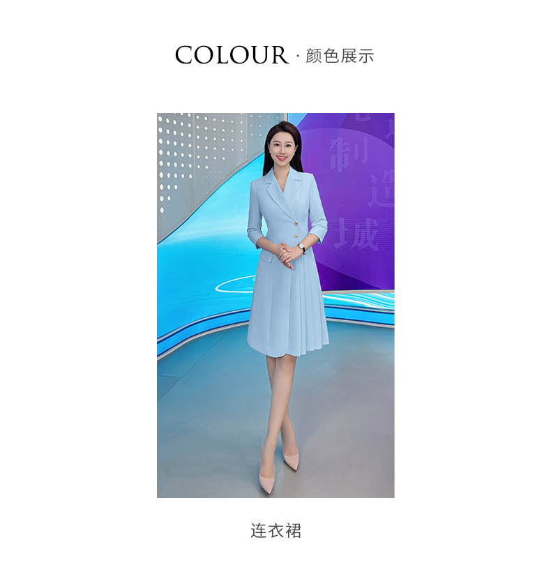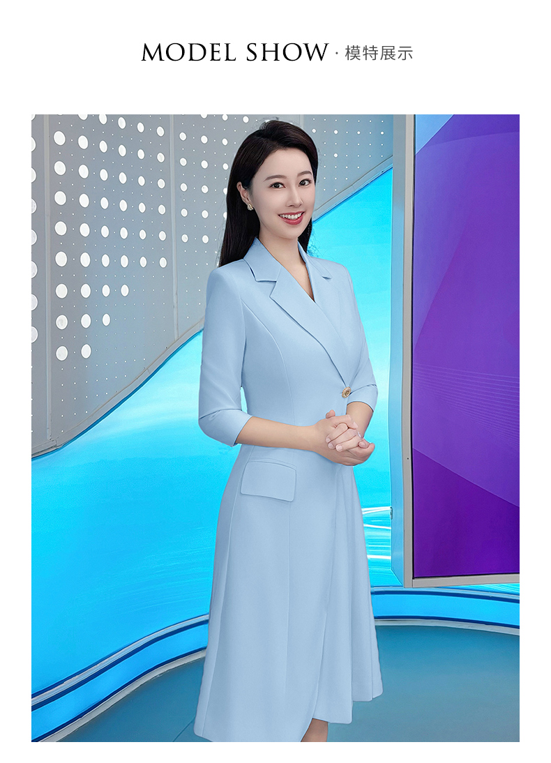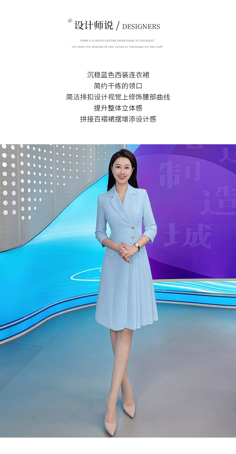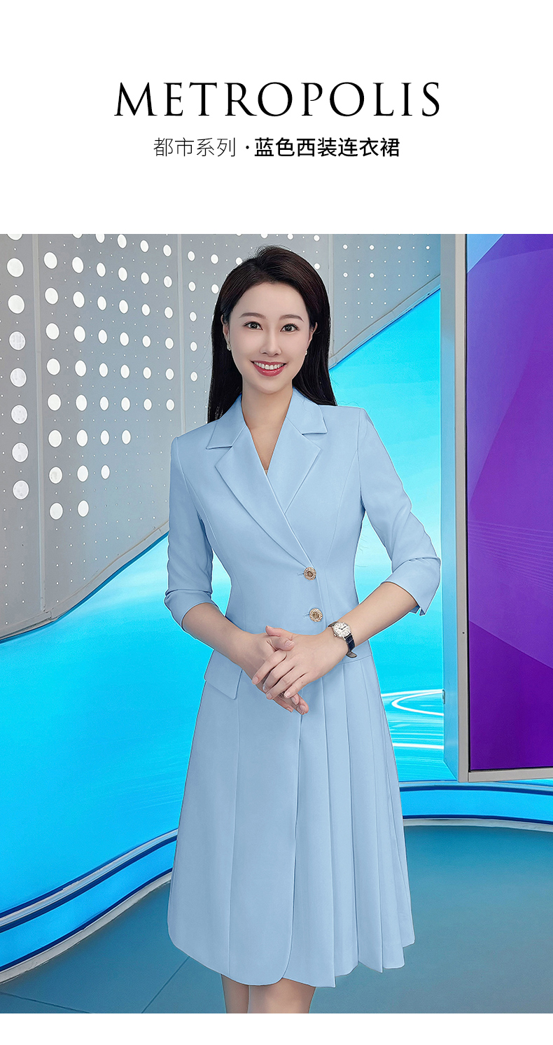 IWY/气质蓝色七分袖西装连衣裙女士播音主持上镜正式场合职业裙Q1174