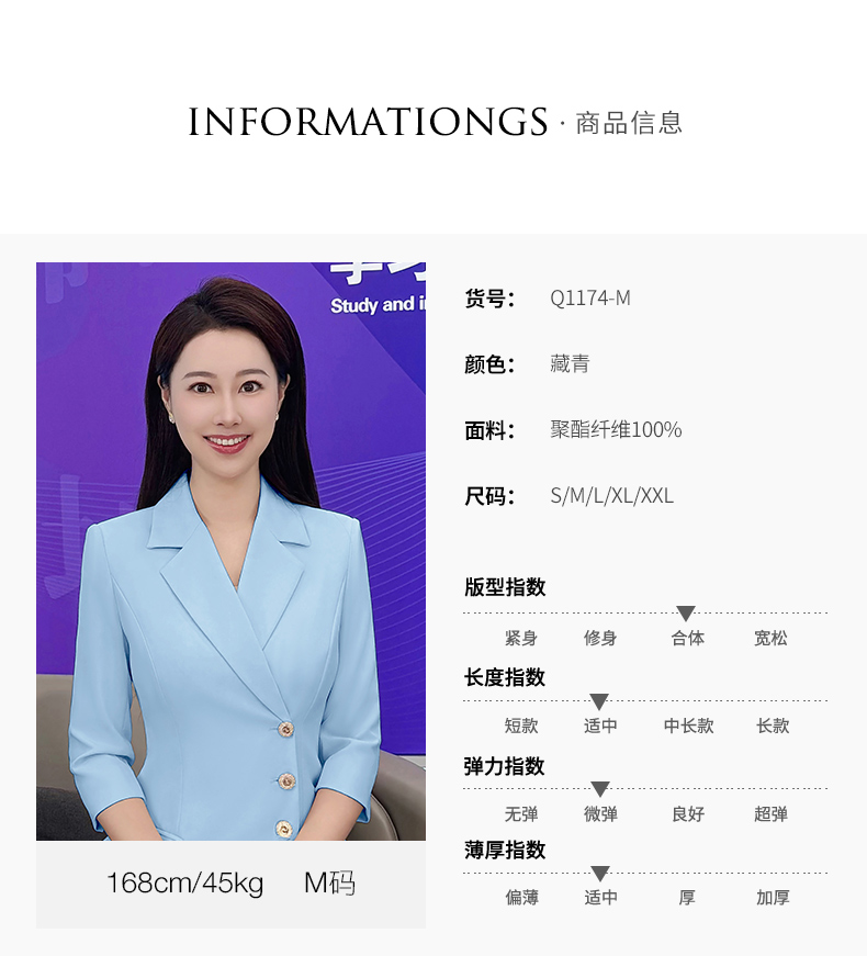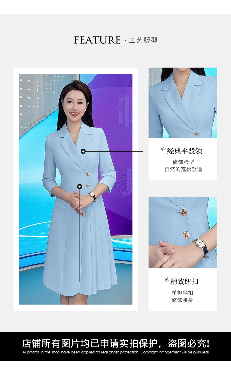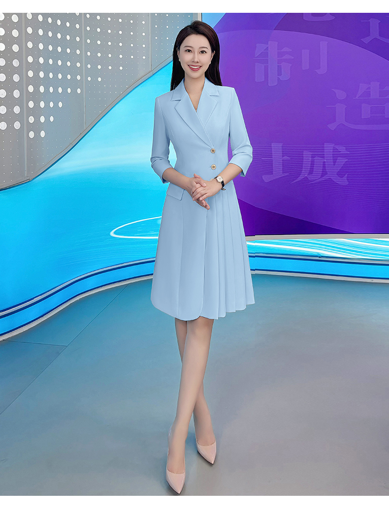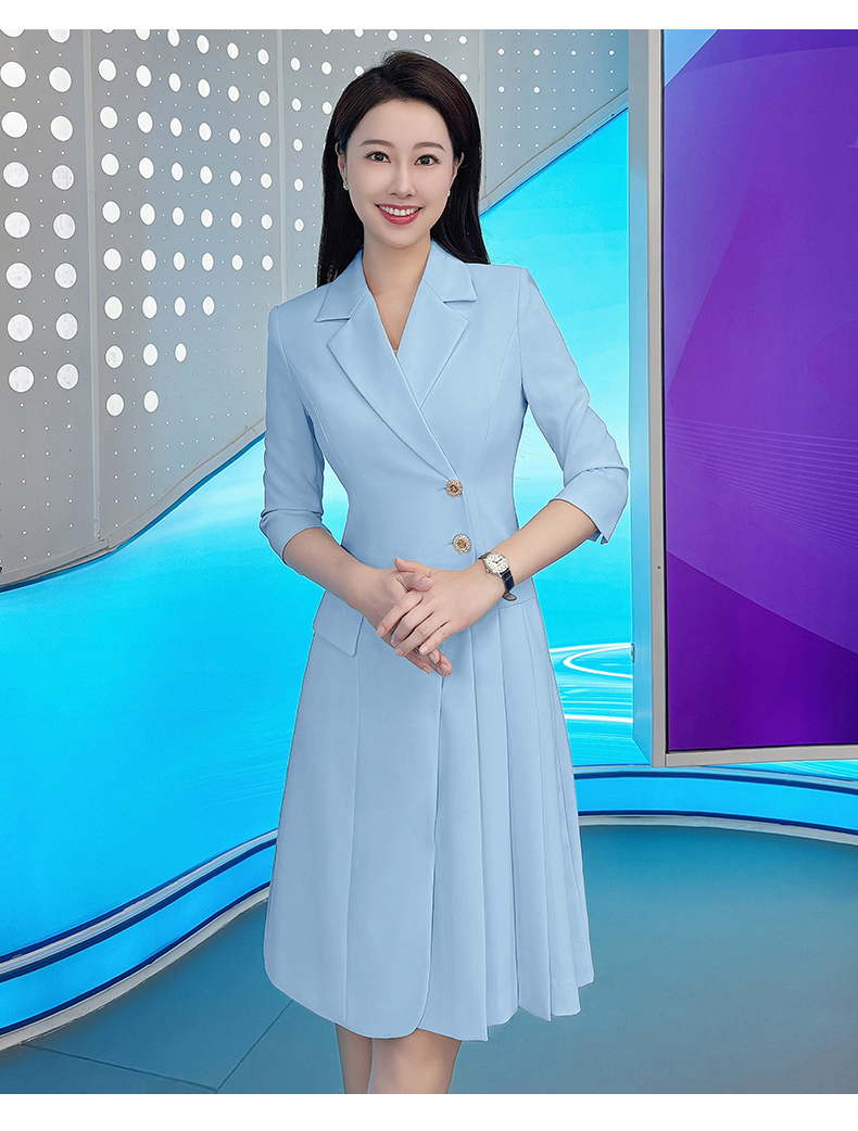 IWY/气质蓝色七分袖西装连衣裙女士播音主持上镜正式场合职业裙Q1174