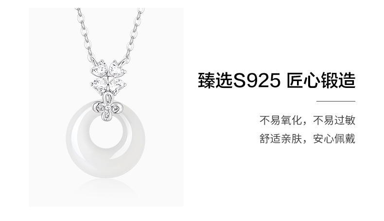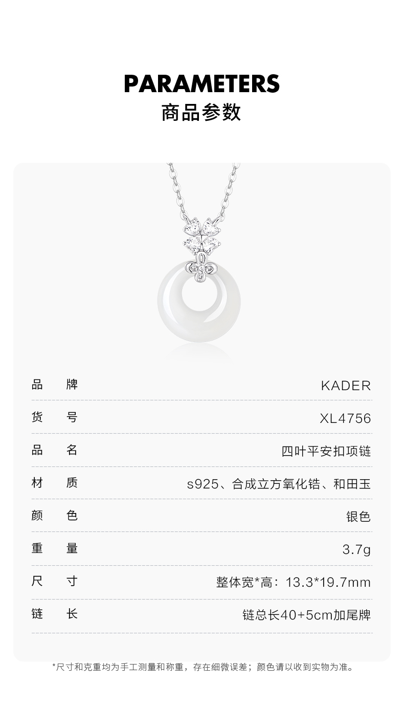 卡蒂罗/KADER 如意福牌系列 四叶平安扣项链 925银和田玉新中式幸运四叶草平安如意可调节锁骨链 温柔浪漫优雅气质
