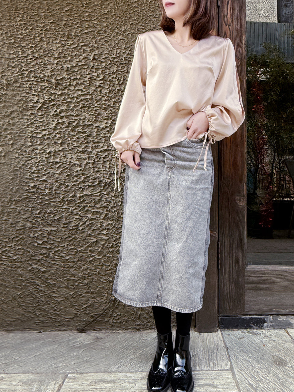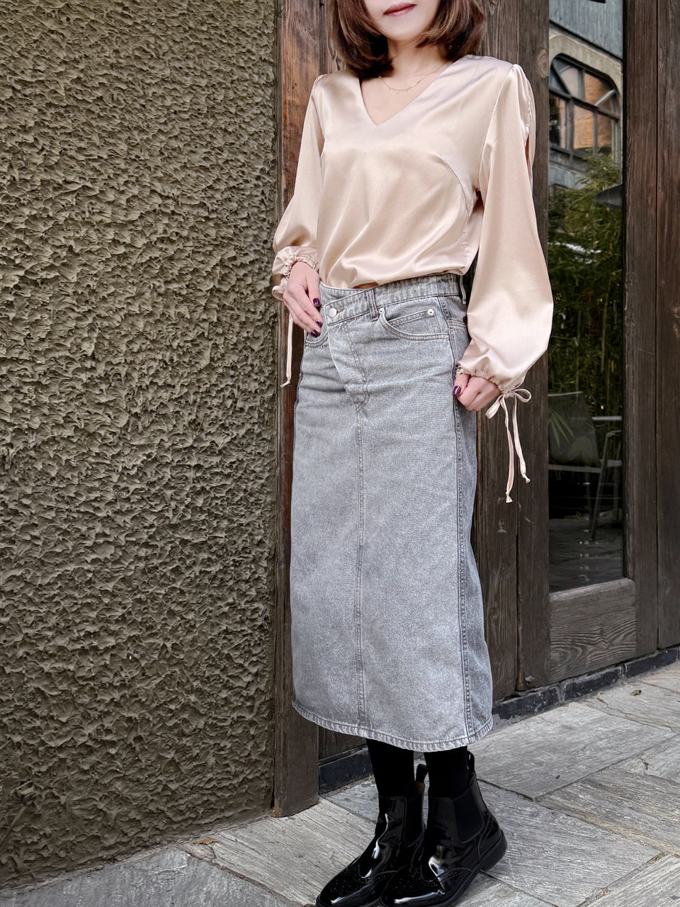 TYNVIE 开衩袖V领真丝衬衫-浅米色