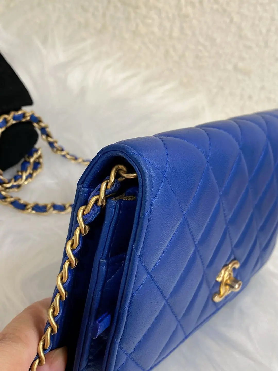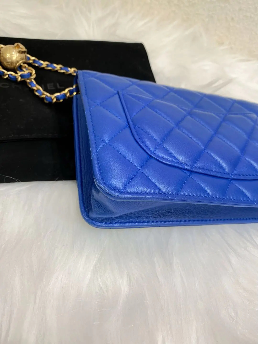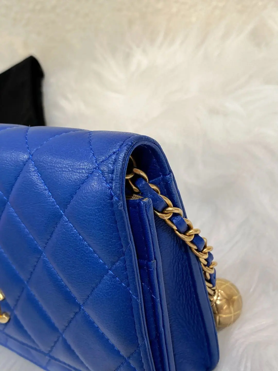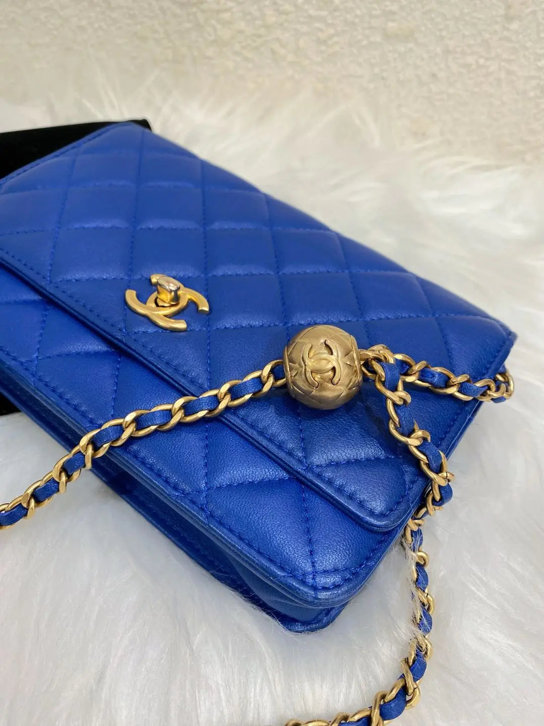 【商品详情】正品二手 Chanel 蓝色 金球 Woc 斜挎包👜97新 19*12 新钢标 配件:防尘袋。时髦精必备。