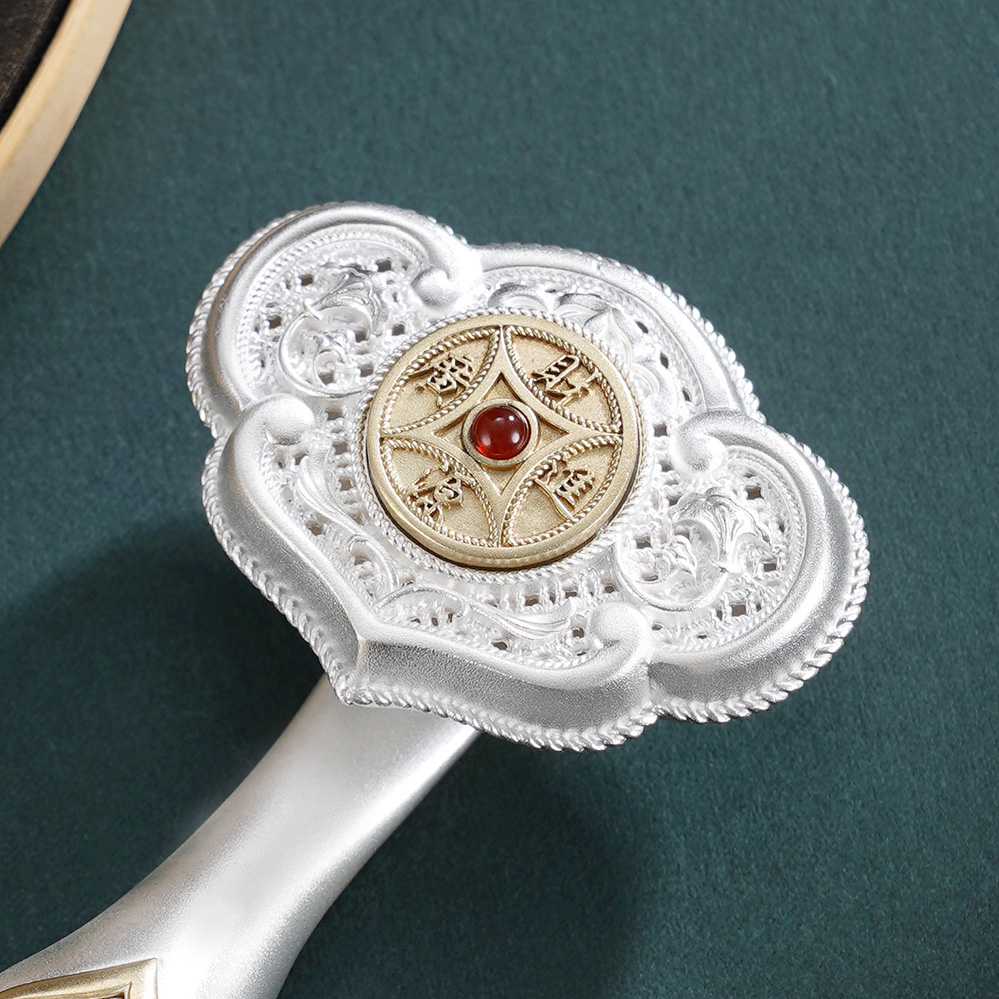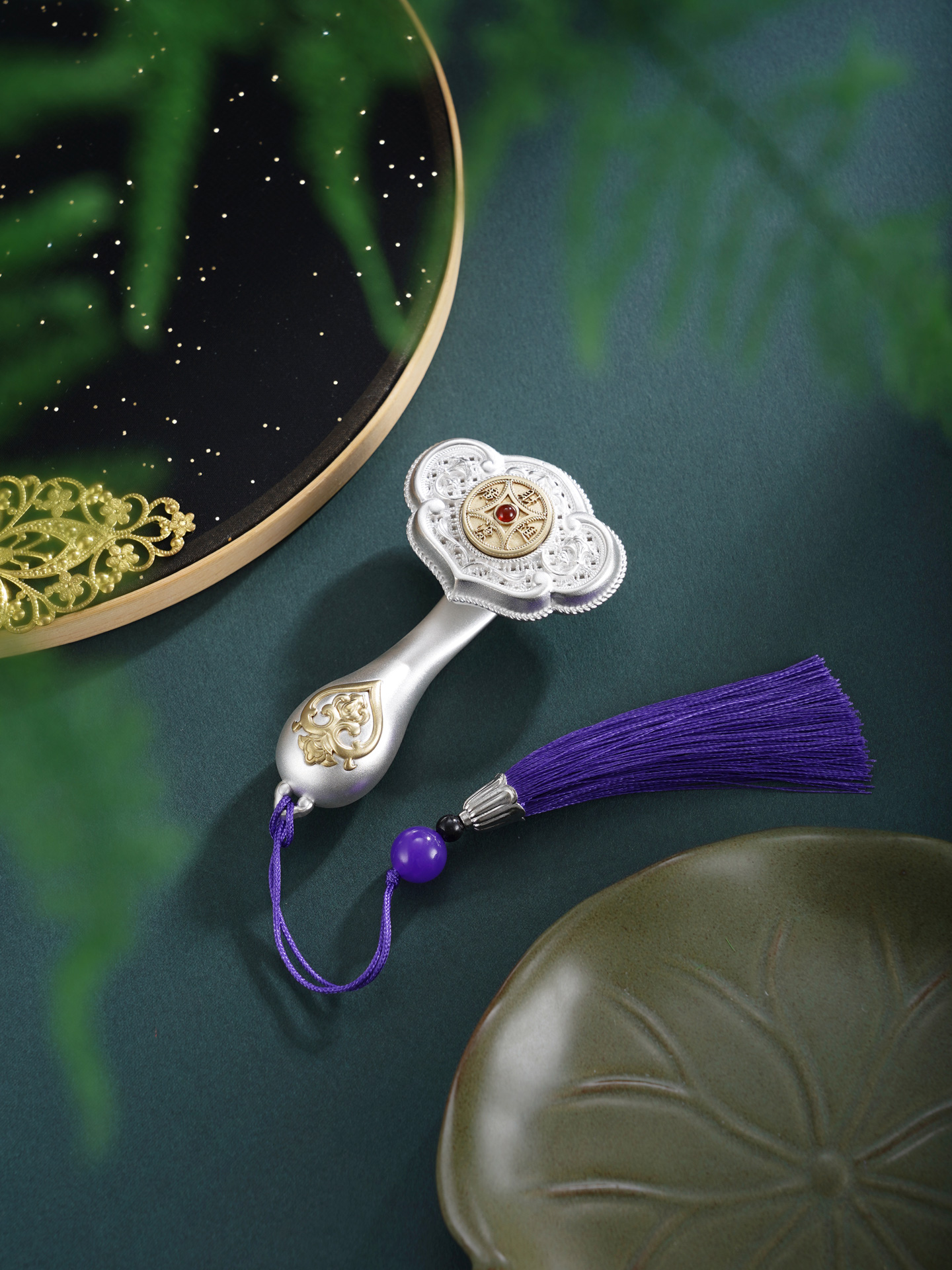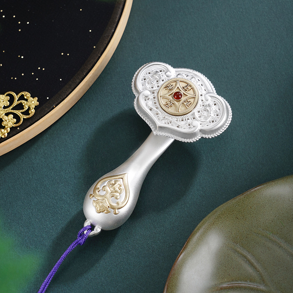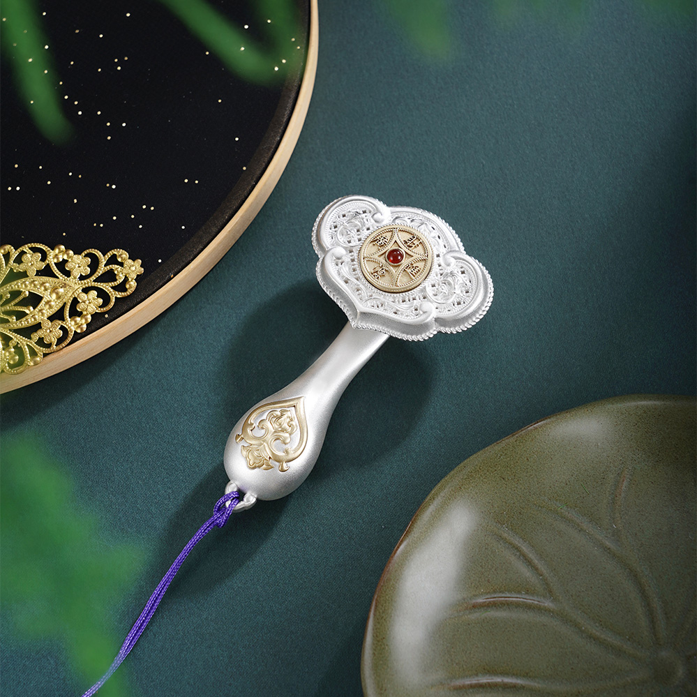 【寓意】:作品以大唐鎏金如意为原型设计,结合开元通宝的铜钱造型,饰以唐代经典纹样,再现盛唐华贵气韵。中间的铜钱可以转动,寓意财源滚动,运转不息。整体设计将“财富”与“顺遂”两大吉祥寓意完美结合,寓意招财进宝,心想事成