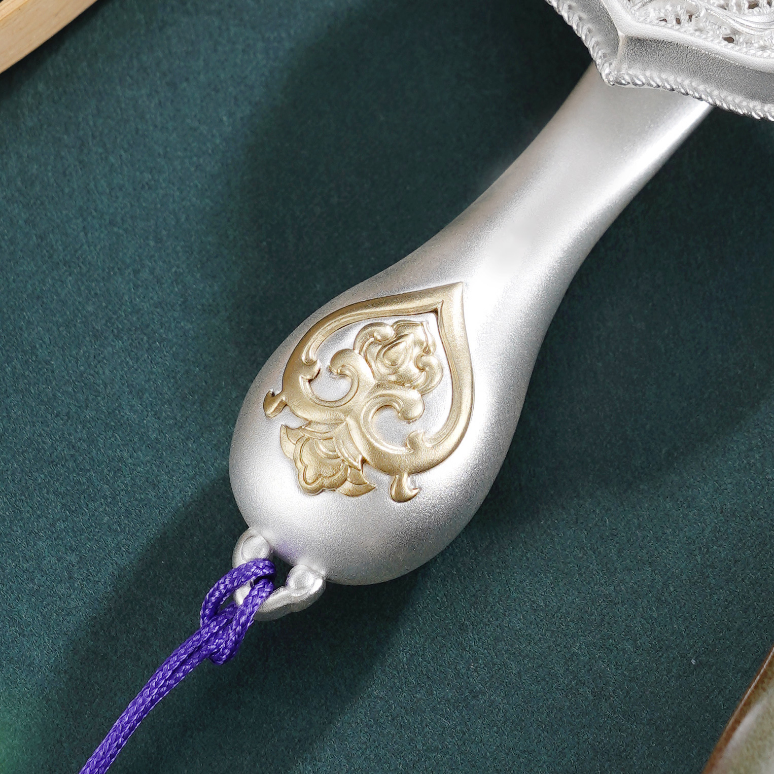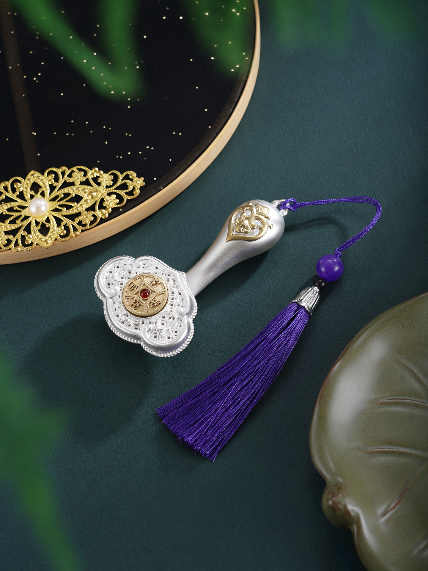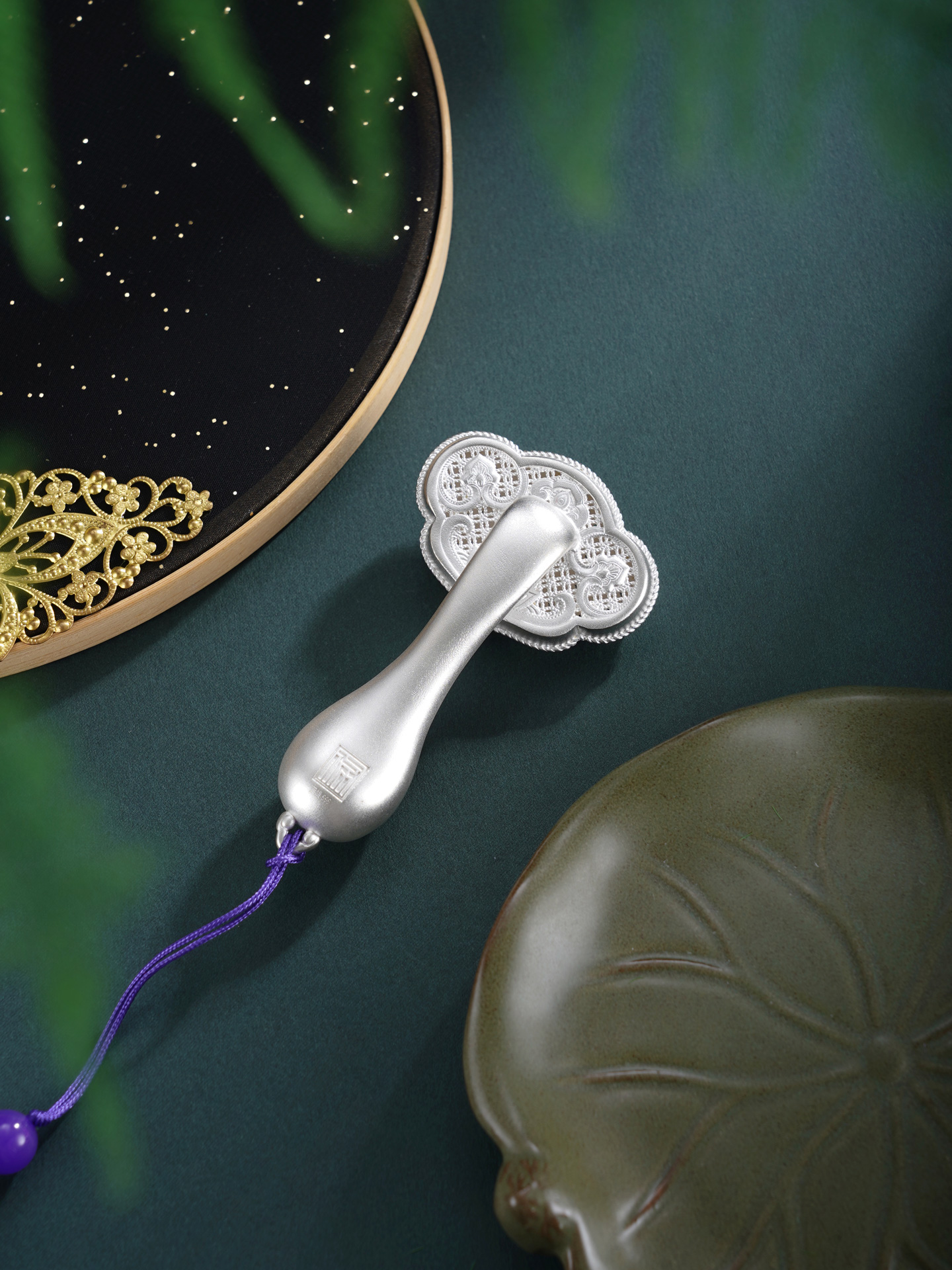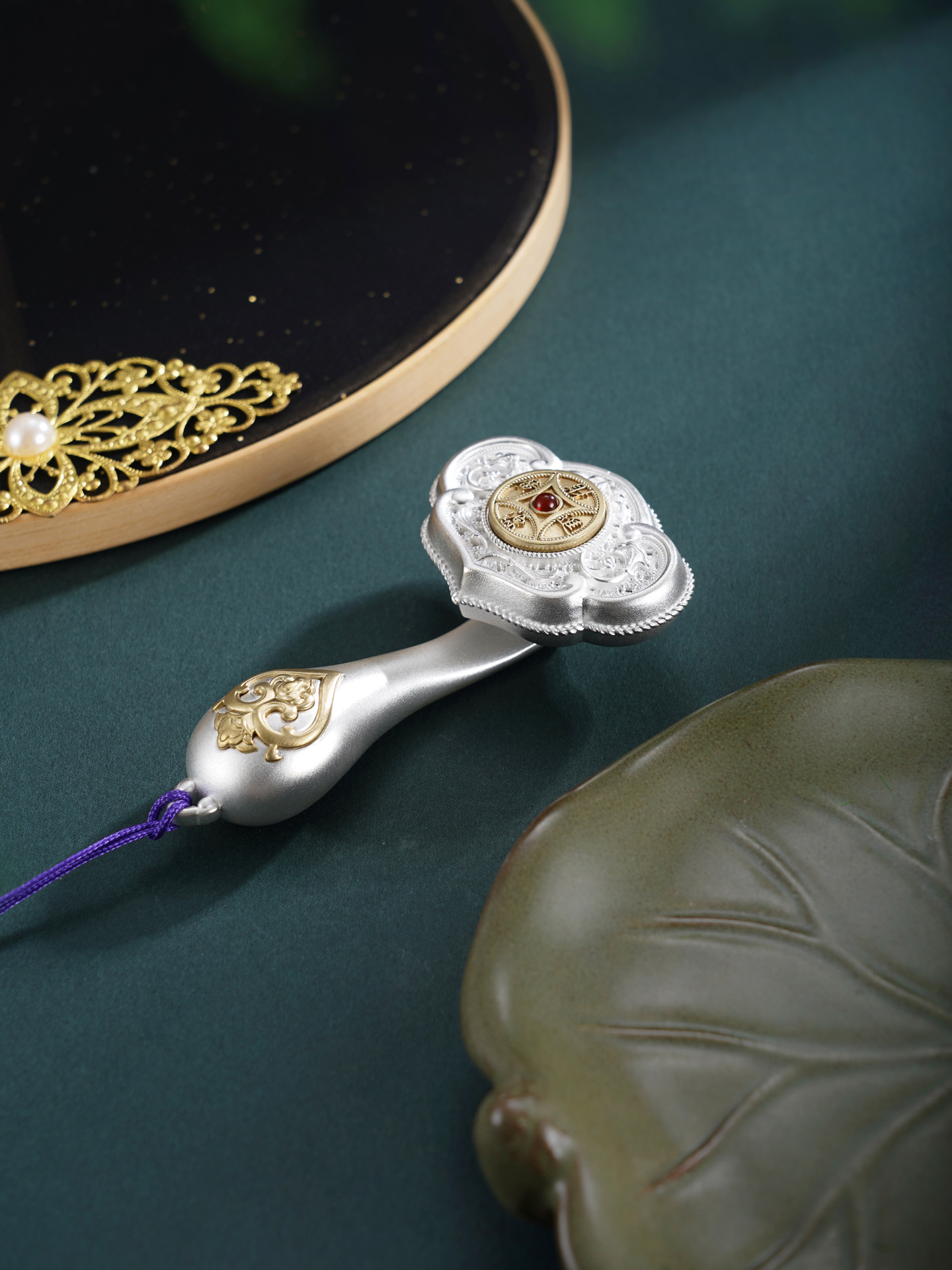【寓意】:作品以大唐鎏金如意为原型设计,结合开元通宝的铜钱造型,饰以唐代经典纹样,再现盛唐华贵气韵。中间的铜钱可以转动,寓意财源滚动,运转不息。整体设计将“财富”与“顺遂”两大吉祥寓意完美结合,寓意招财进宝,心想事成