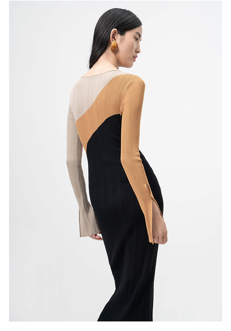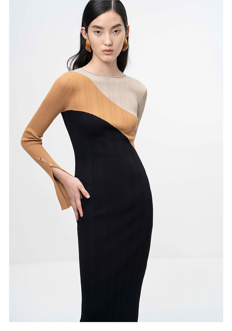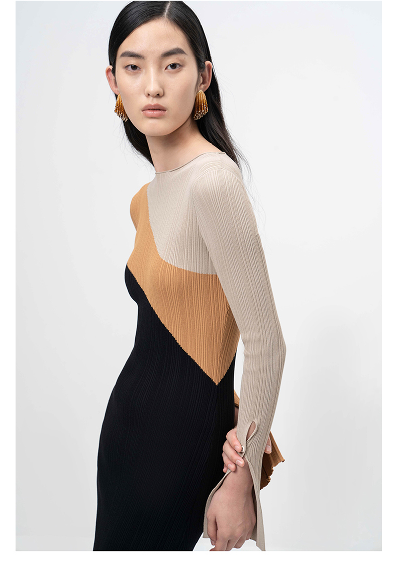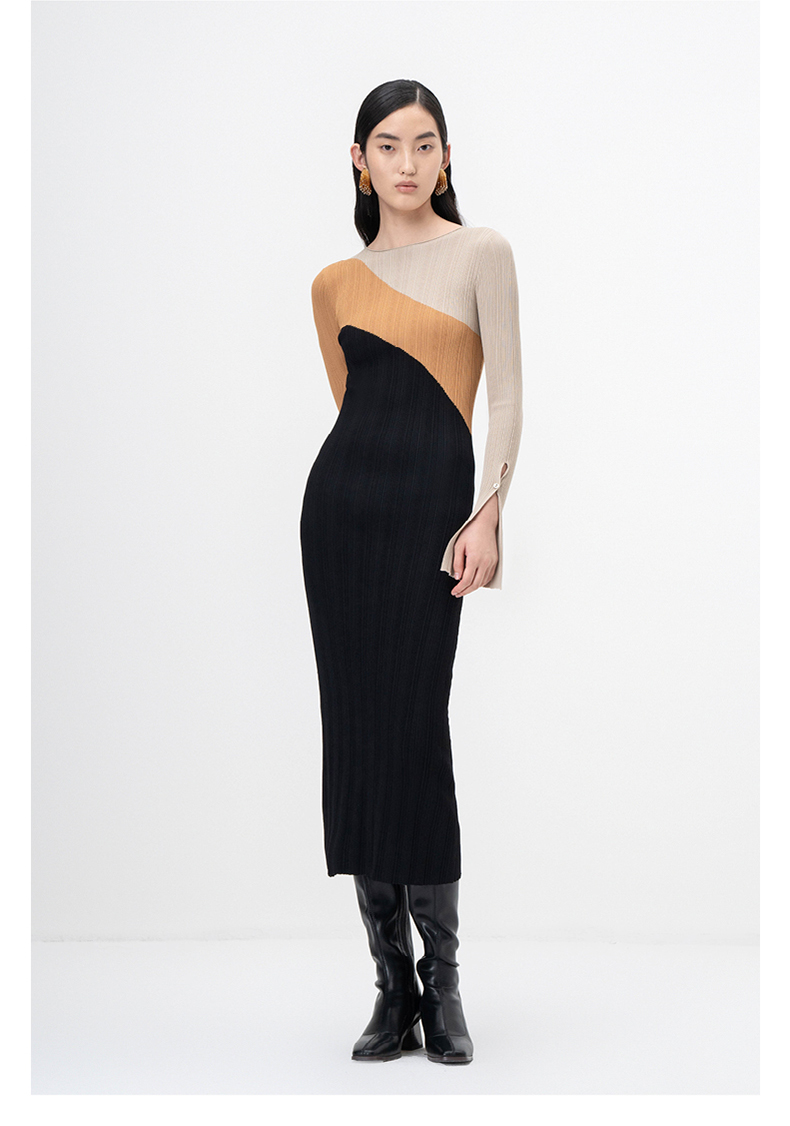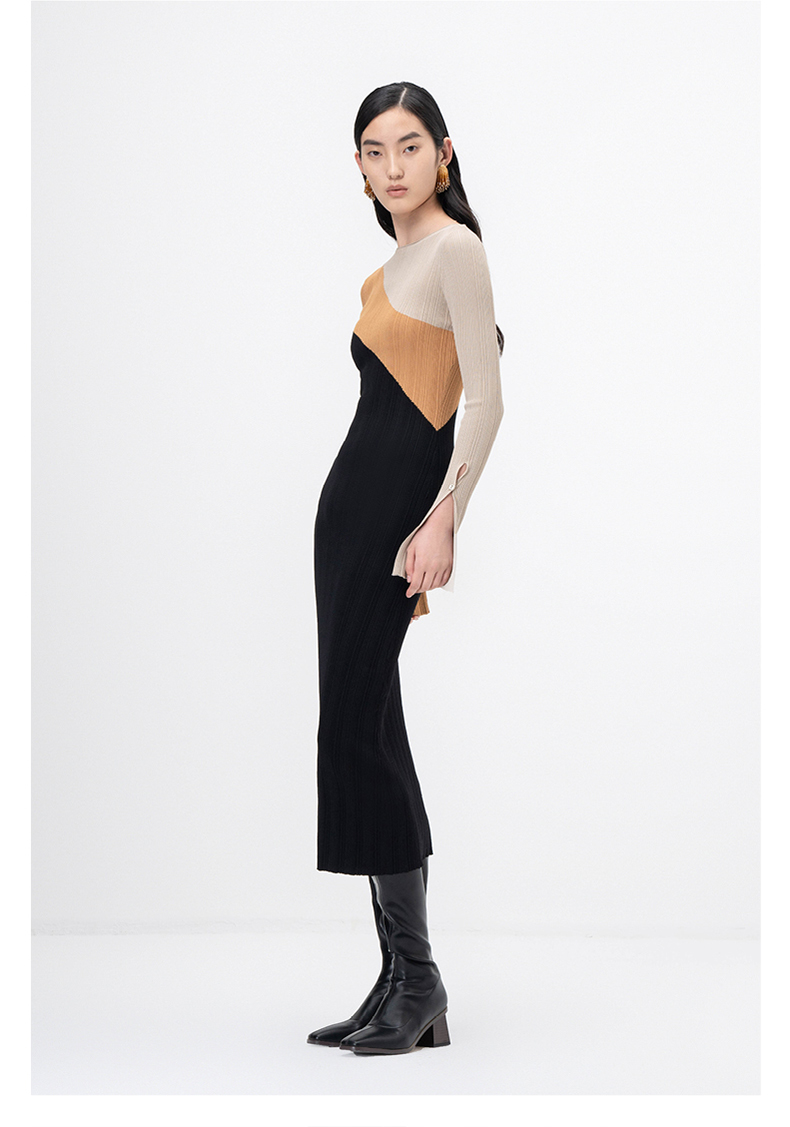 【轮廓线】流畅曲线三色拼接长袖针织连衣裙/202106