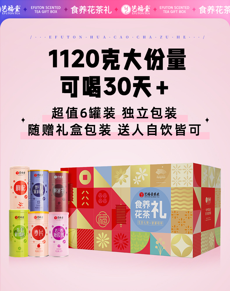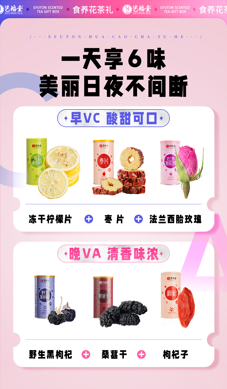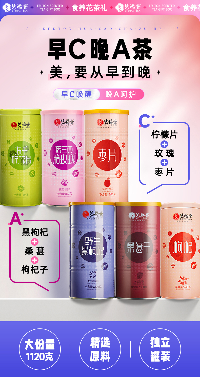 艺福堂黑枸杞220g/罐 桑葚干300g/罐 枸杞240g/罐 冻干柠檬片80g/罐 西胎玫瑰花茶80g/罐 枣片200g/罐 佳节茶礼 艺福堂食养花茶礼盒 送老师 中秋佳礼