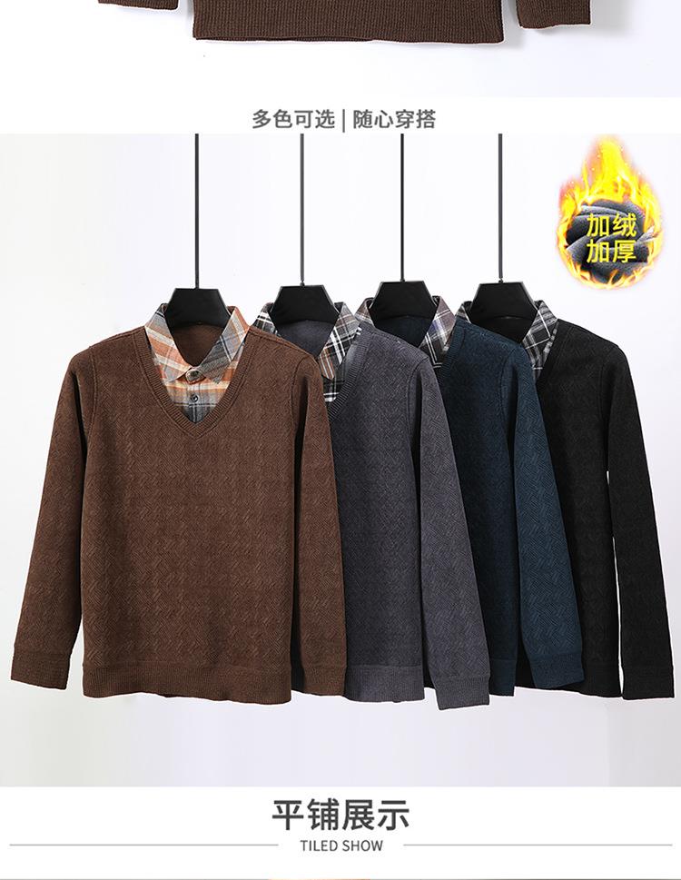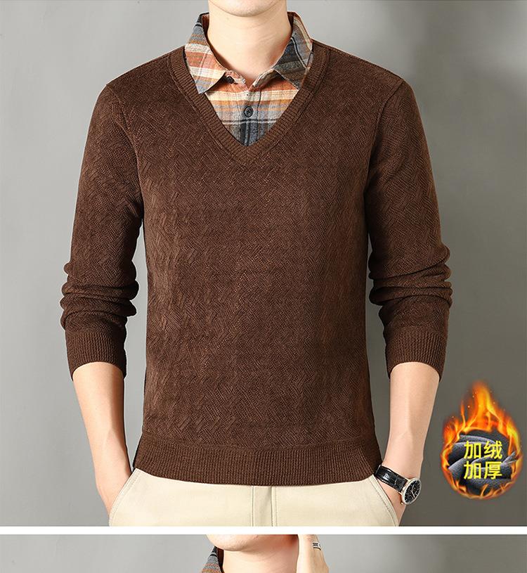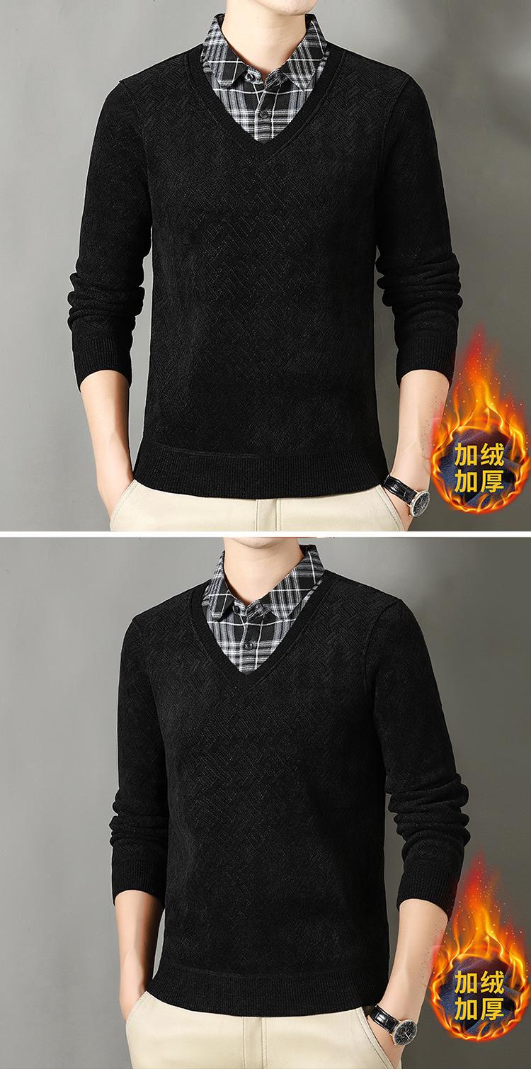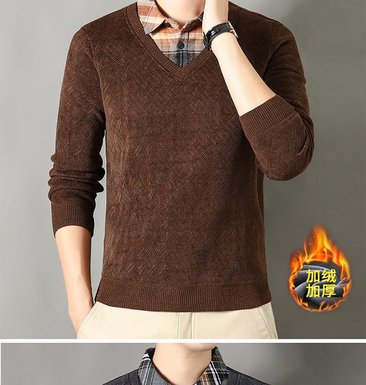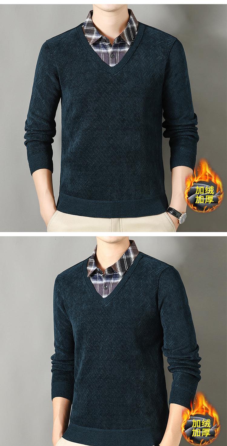 格子加绒加厚假两件长袖打底衫男士秋冬季新款毛衣男