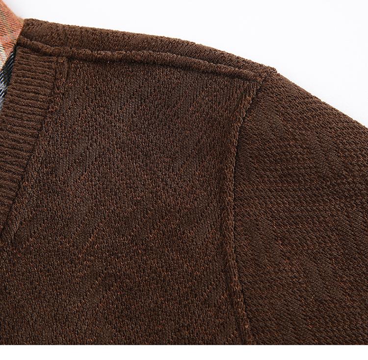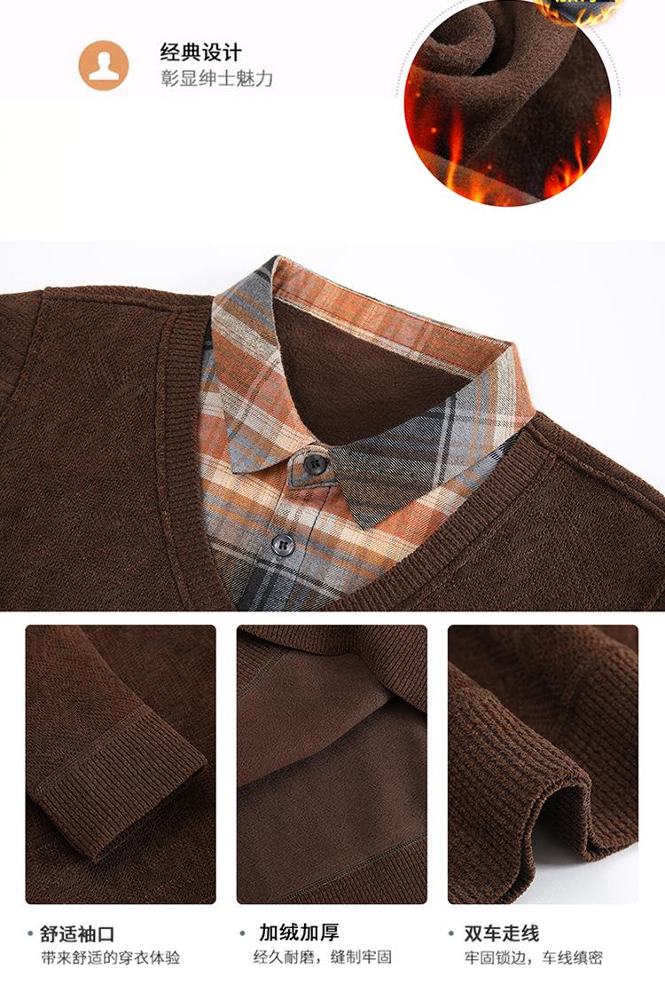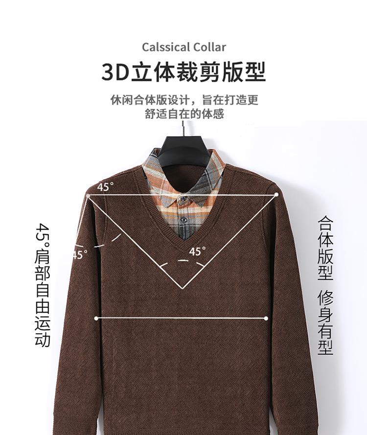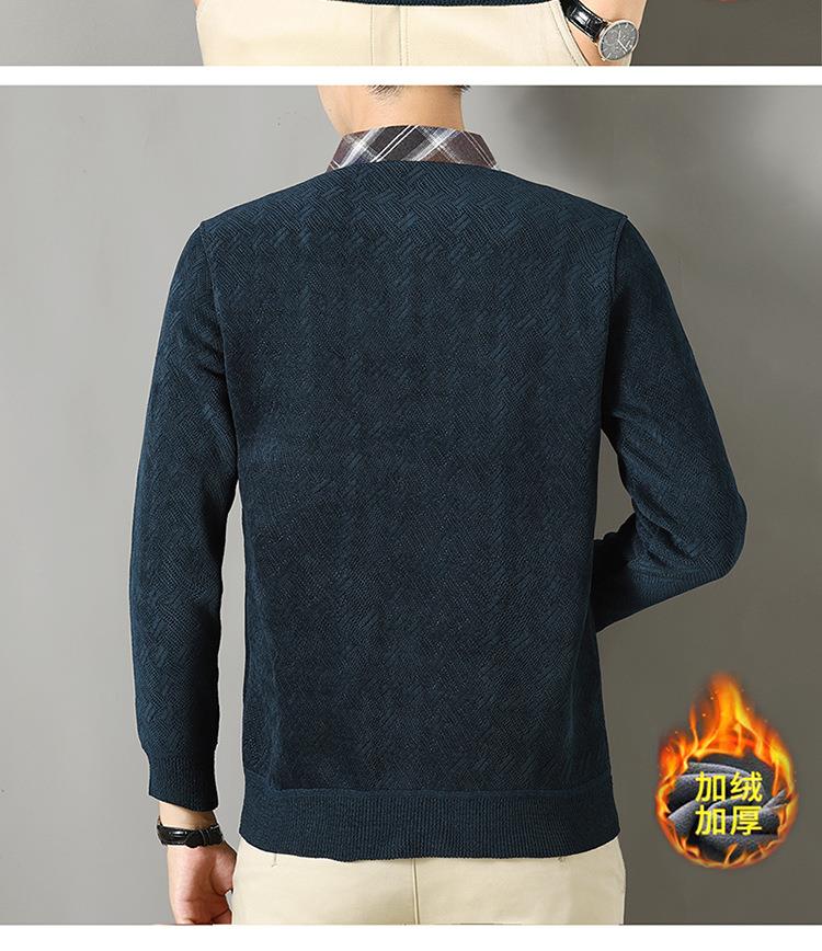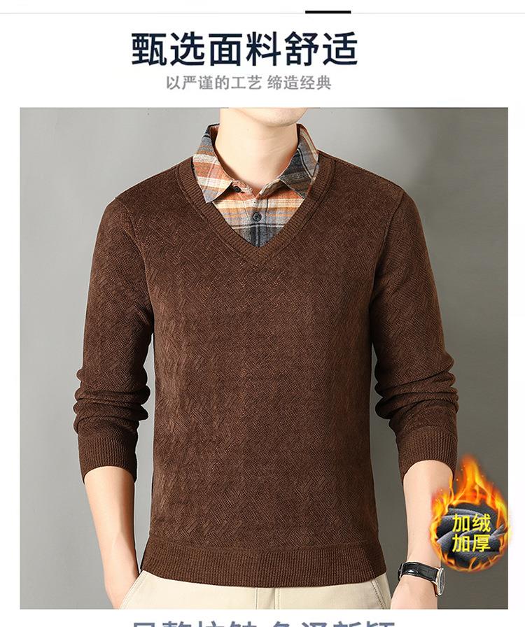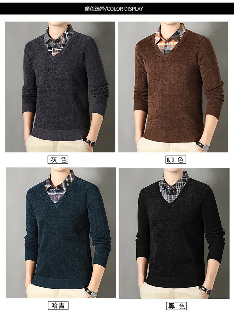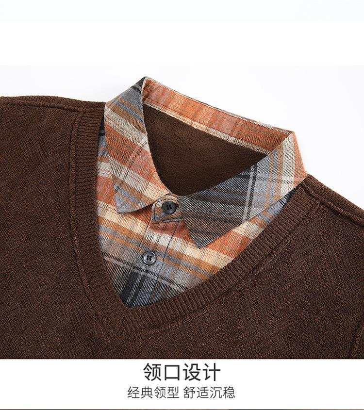 格子加绒加厚假两件长袖打底衫男士秋冬季新款毛衣男