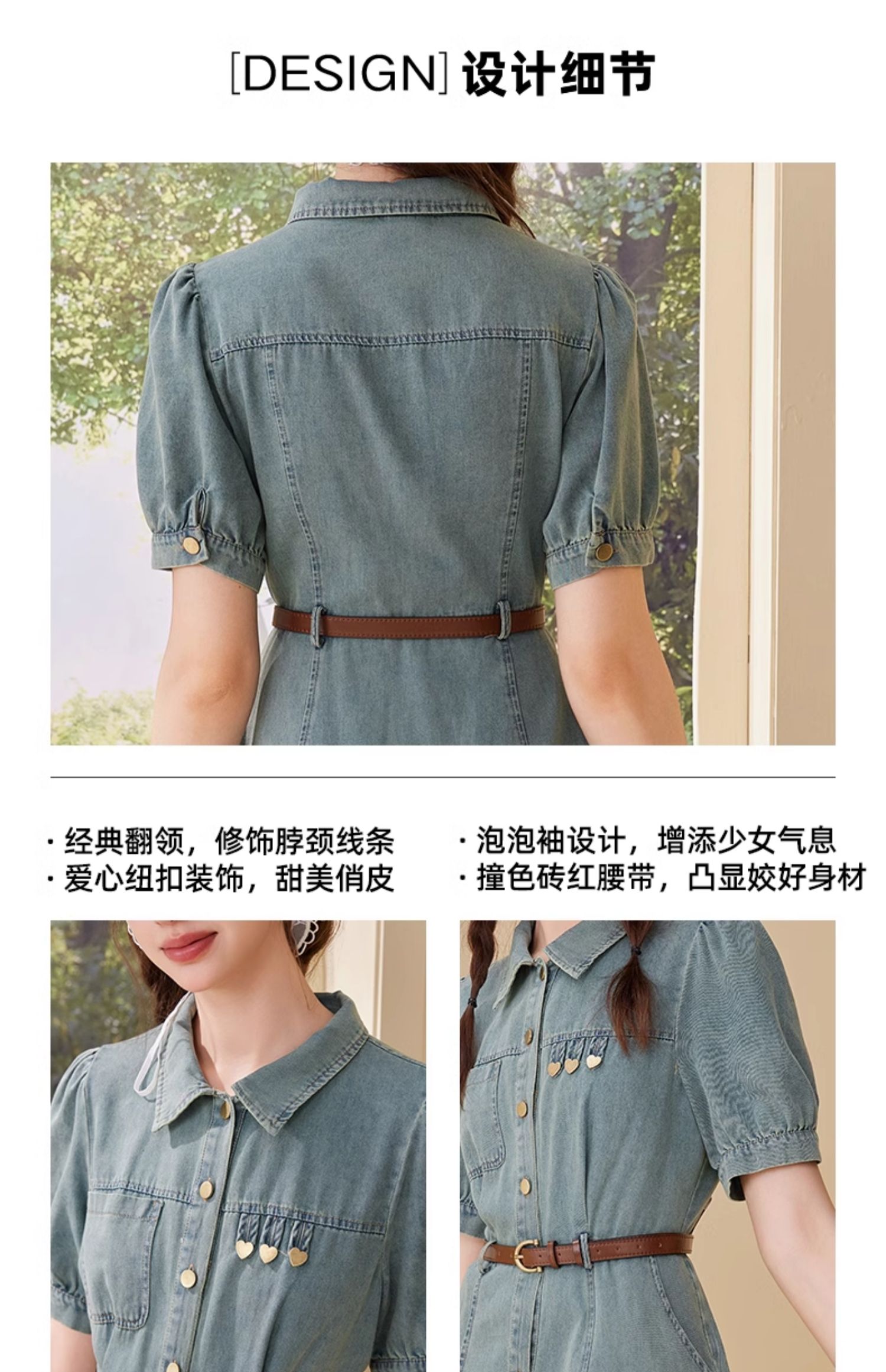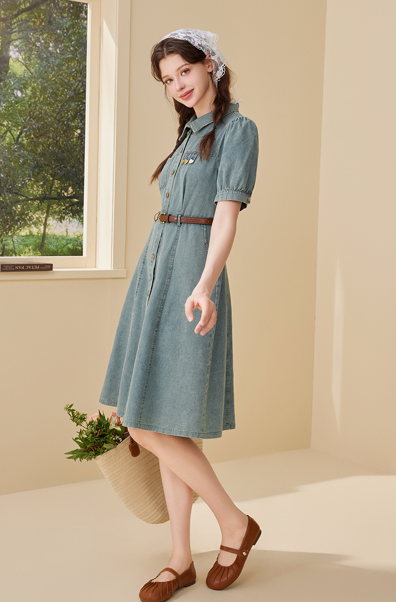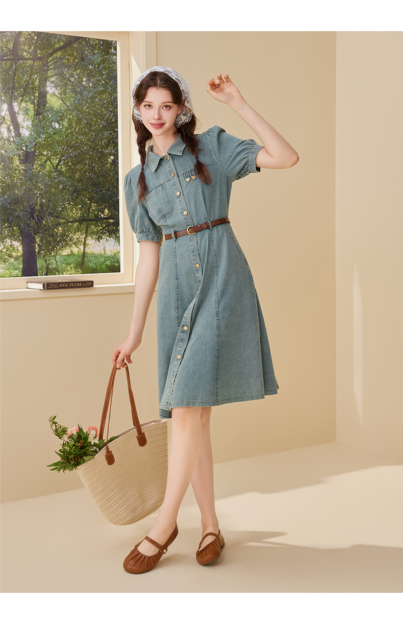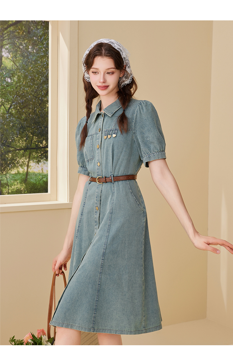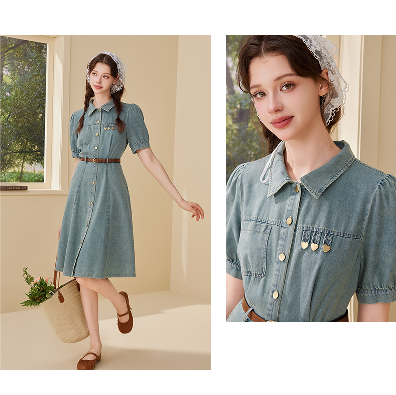 mc2翻领金属爱心牛仔连衣裙女2024夏装新款收腰显瘦甜美减龄洋气
