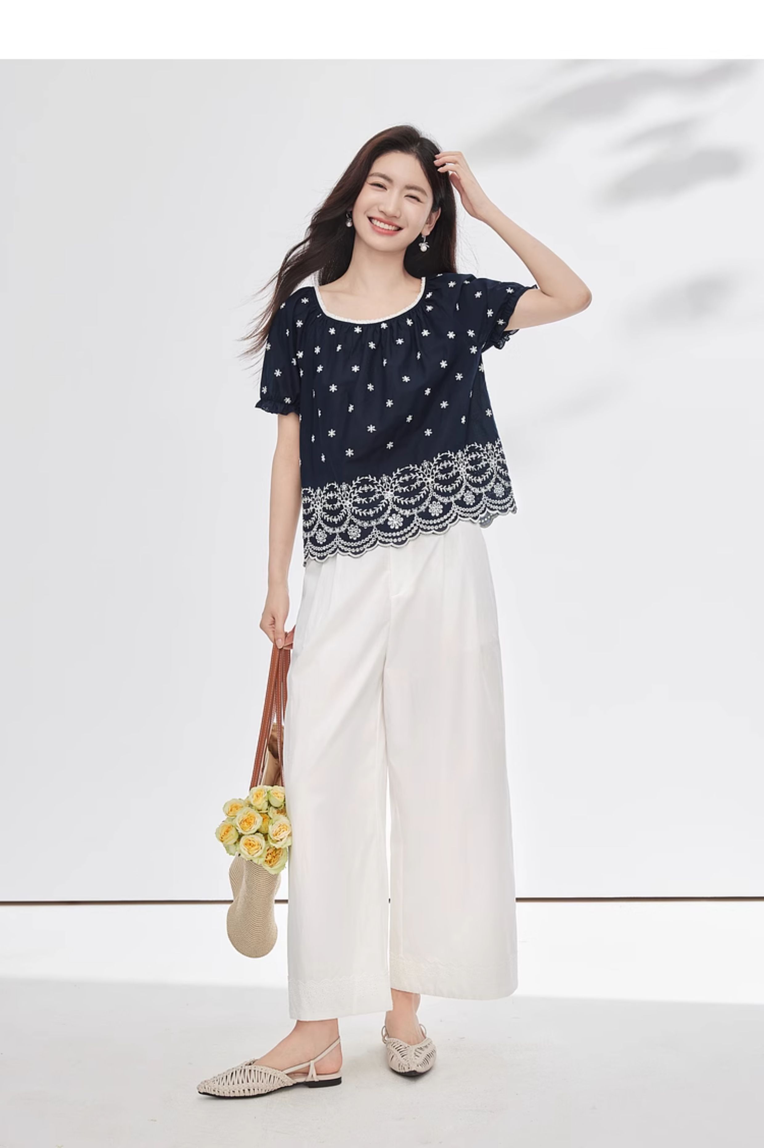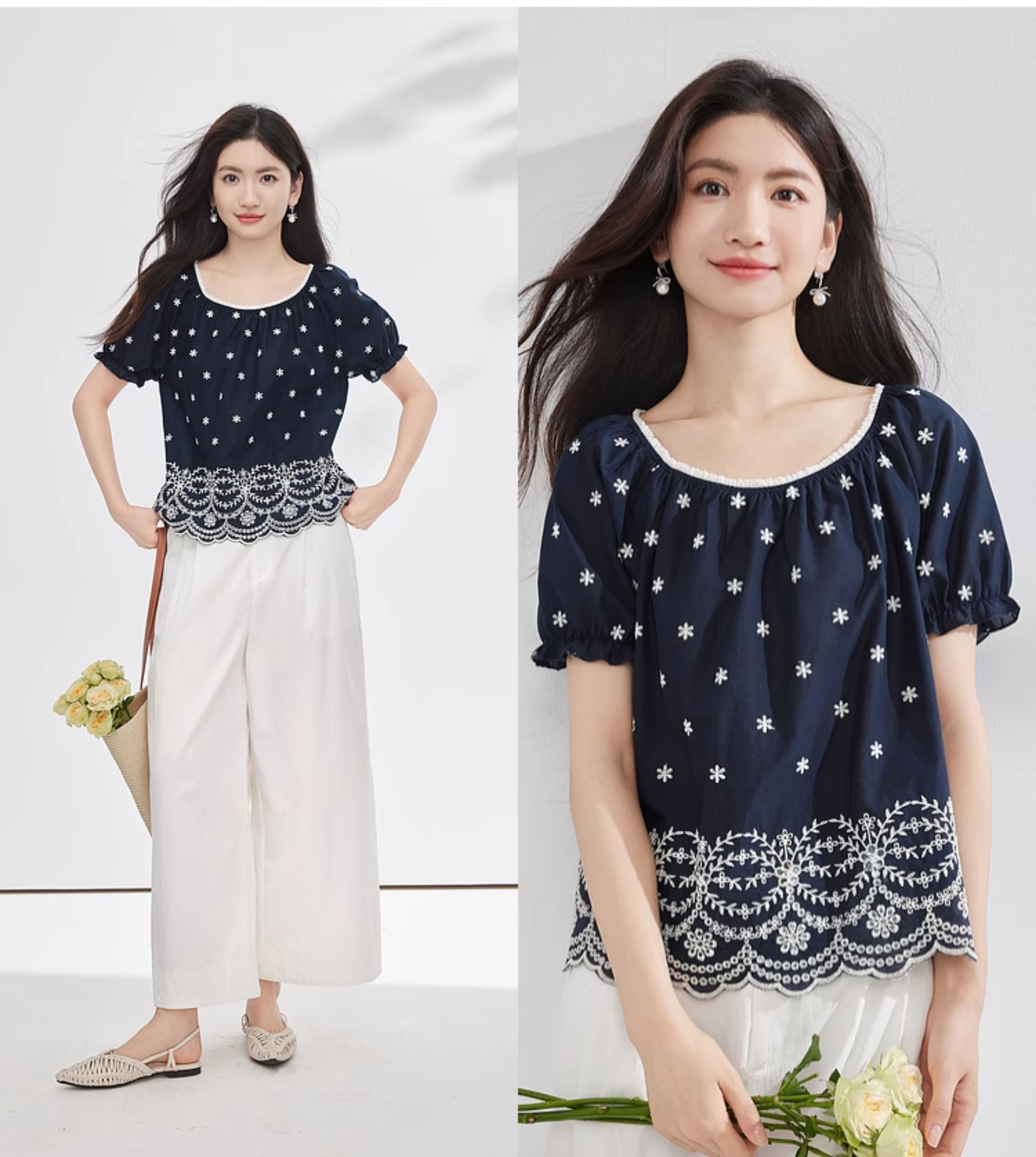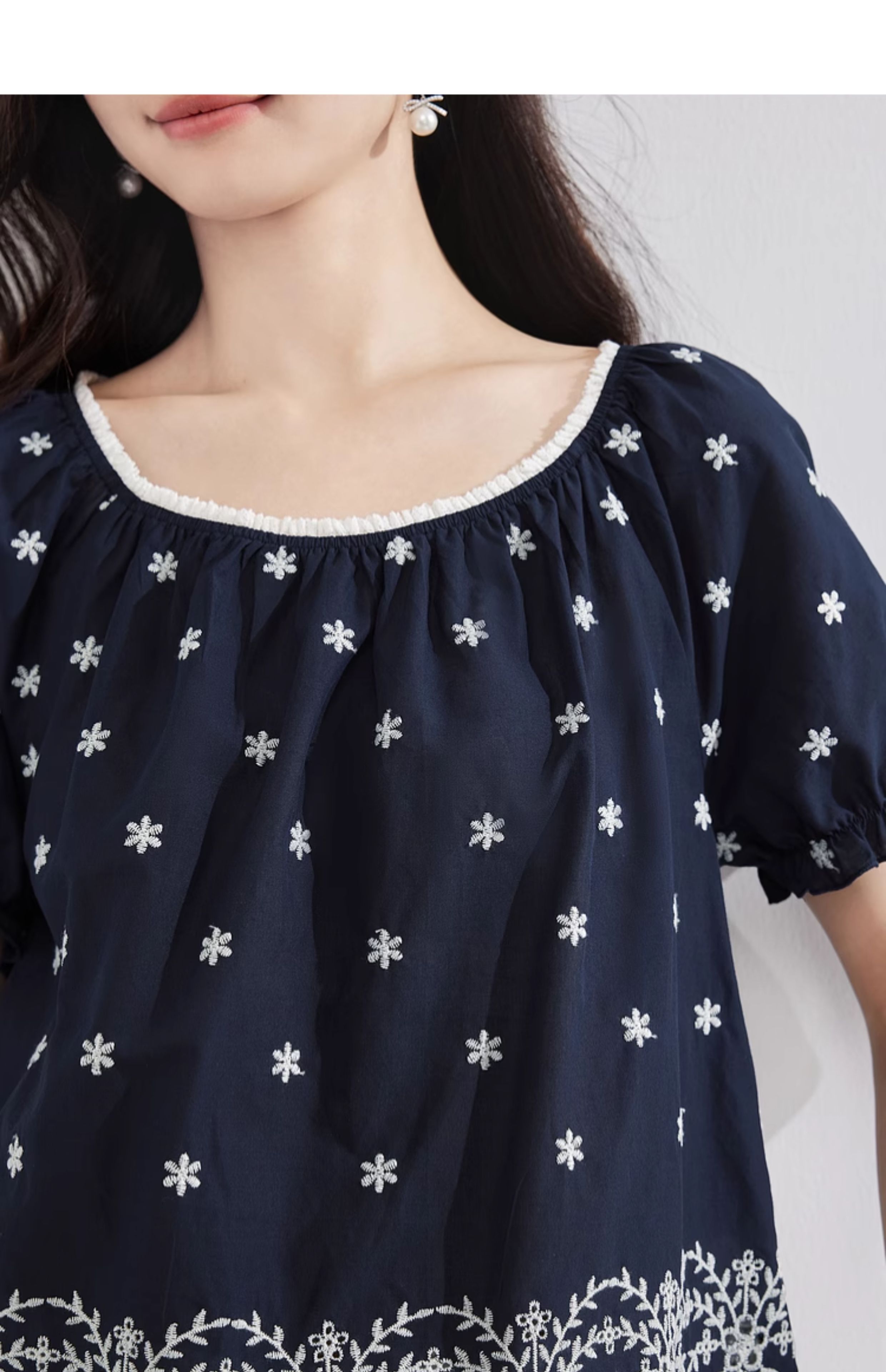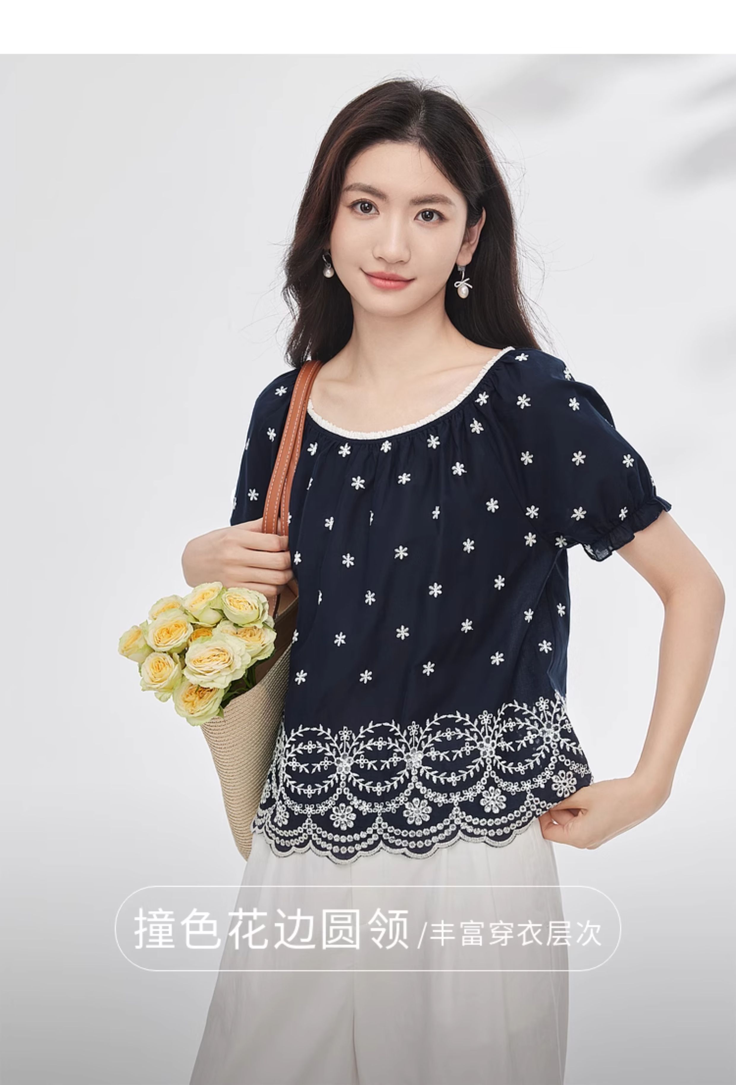 【07/09新品】熙世界复古民族风刺绣衬衫女夏季新款圆领短袖100%棉减龄小衫上衣