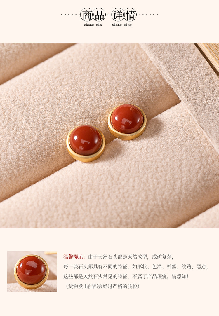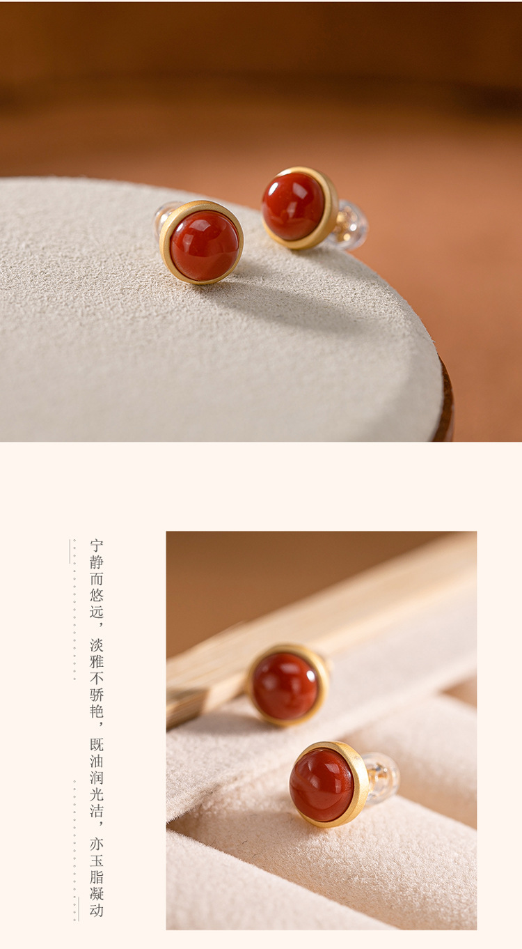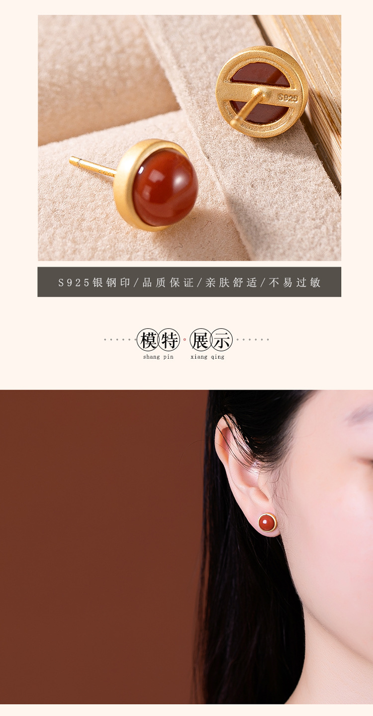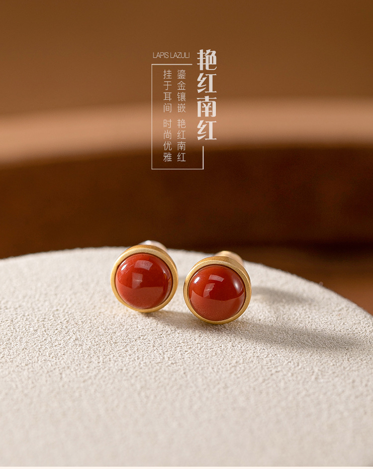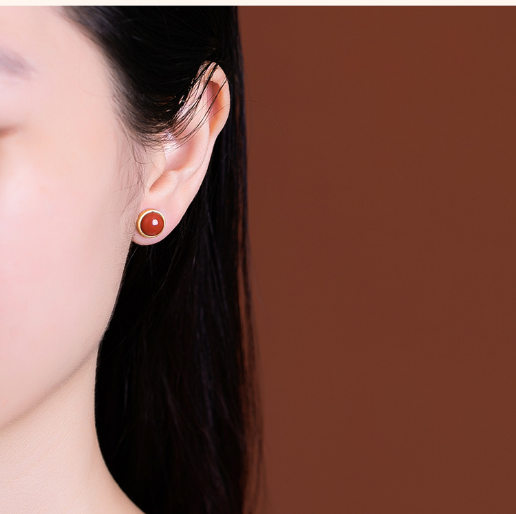 【晕轮】S925银镀金镶嵌南红玛瑙圆形耳钉【CW-701011】