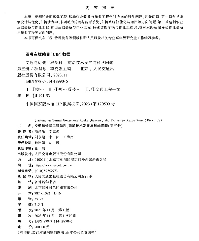 书名:交通与运载工程学科:前沿技术发展与科学问题(第五册)