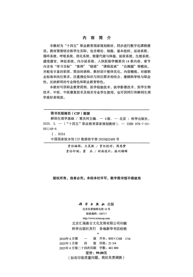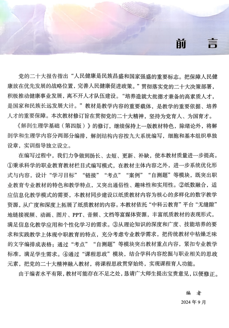 解剖生理学基础 第4四版 职业教育新形态教材 覃庆河主编 供职业教育药剂医学检验医学影像医学生物中医中医康复及相关等专业使用