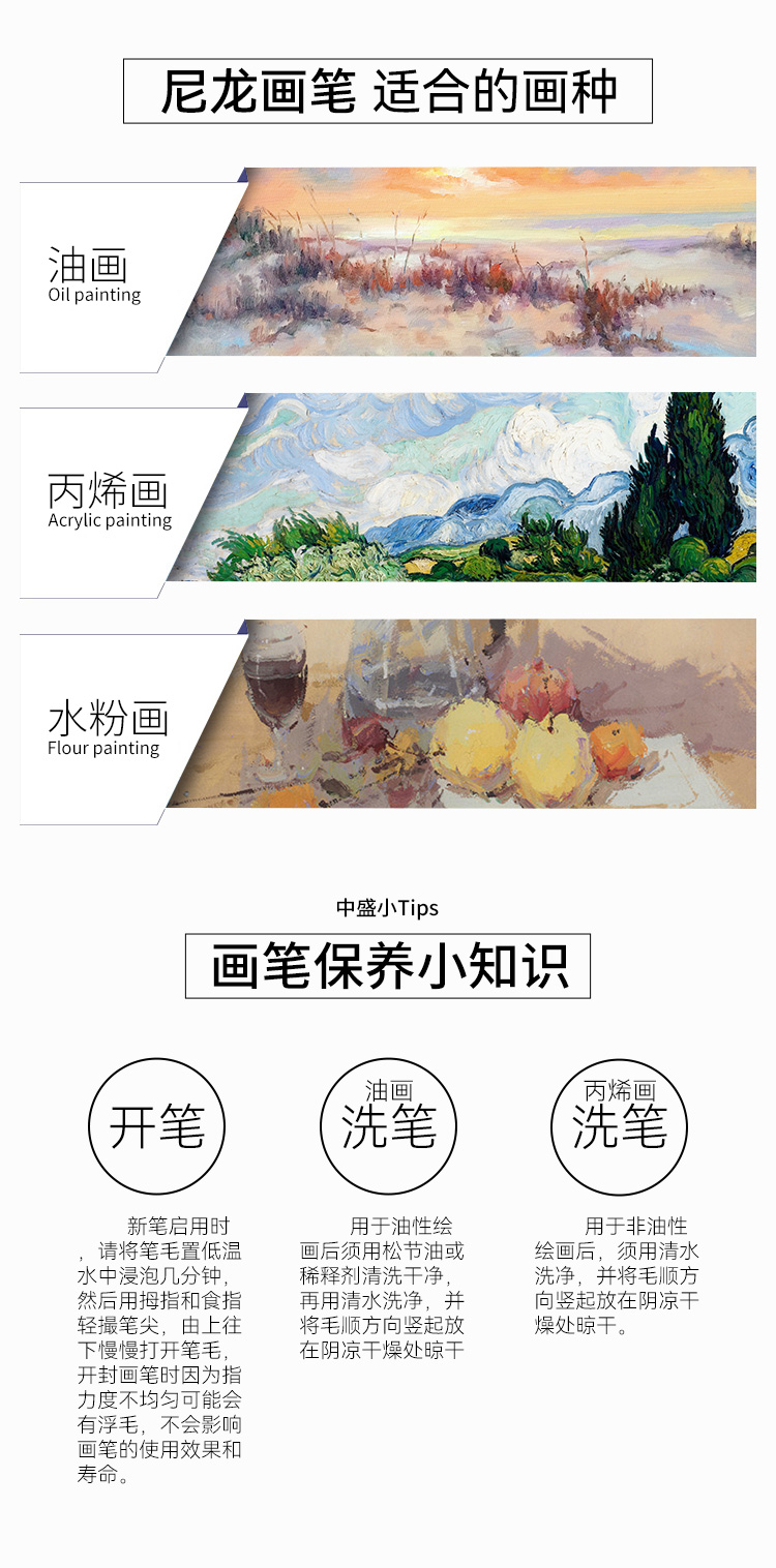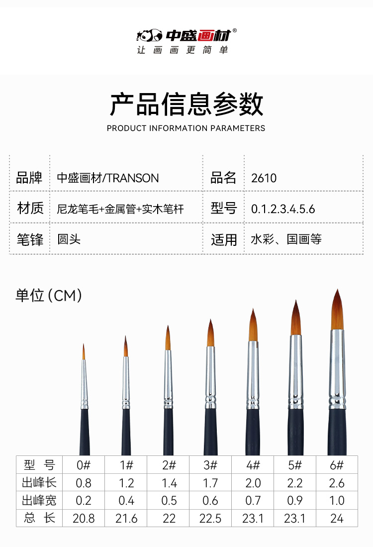 中盛画材尖头水彩笔油画笔圆头尼龙水彩画笔水粉笔颜料绘画笔2610